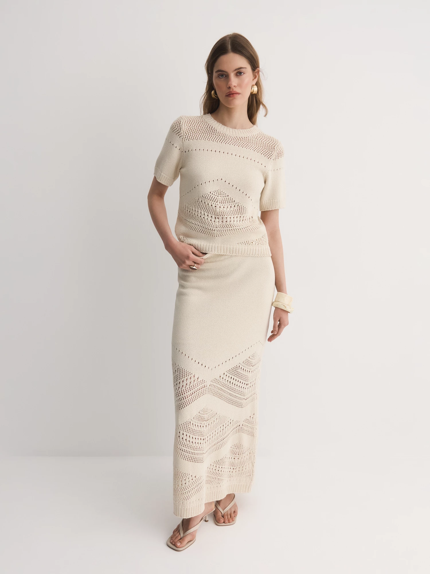 Прямая юбка стройнит и визуально увеличивает рост. Выбрали для модели уникальный ажурный рисунок, как будто связанный крючком вручную.