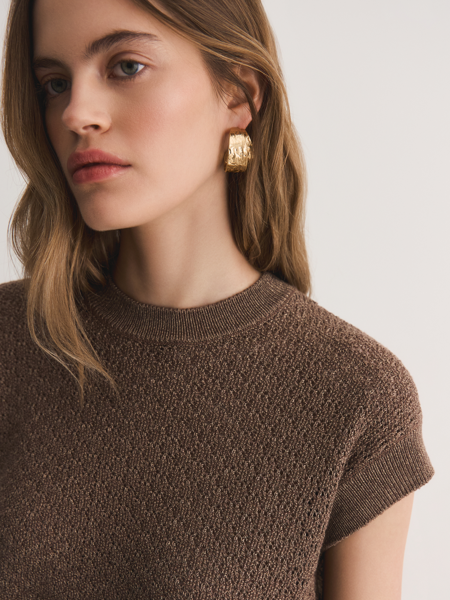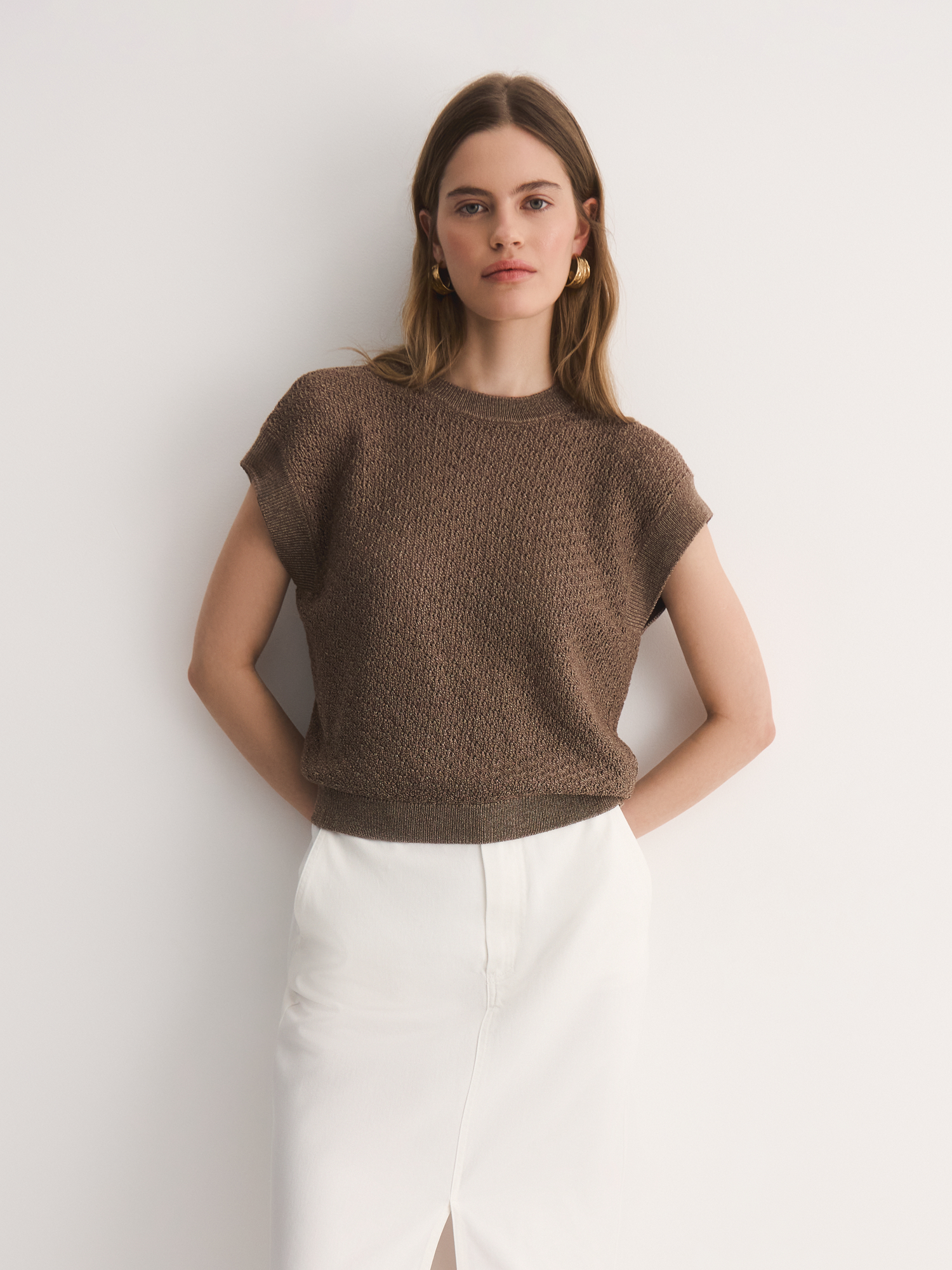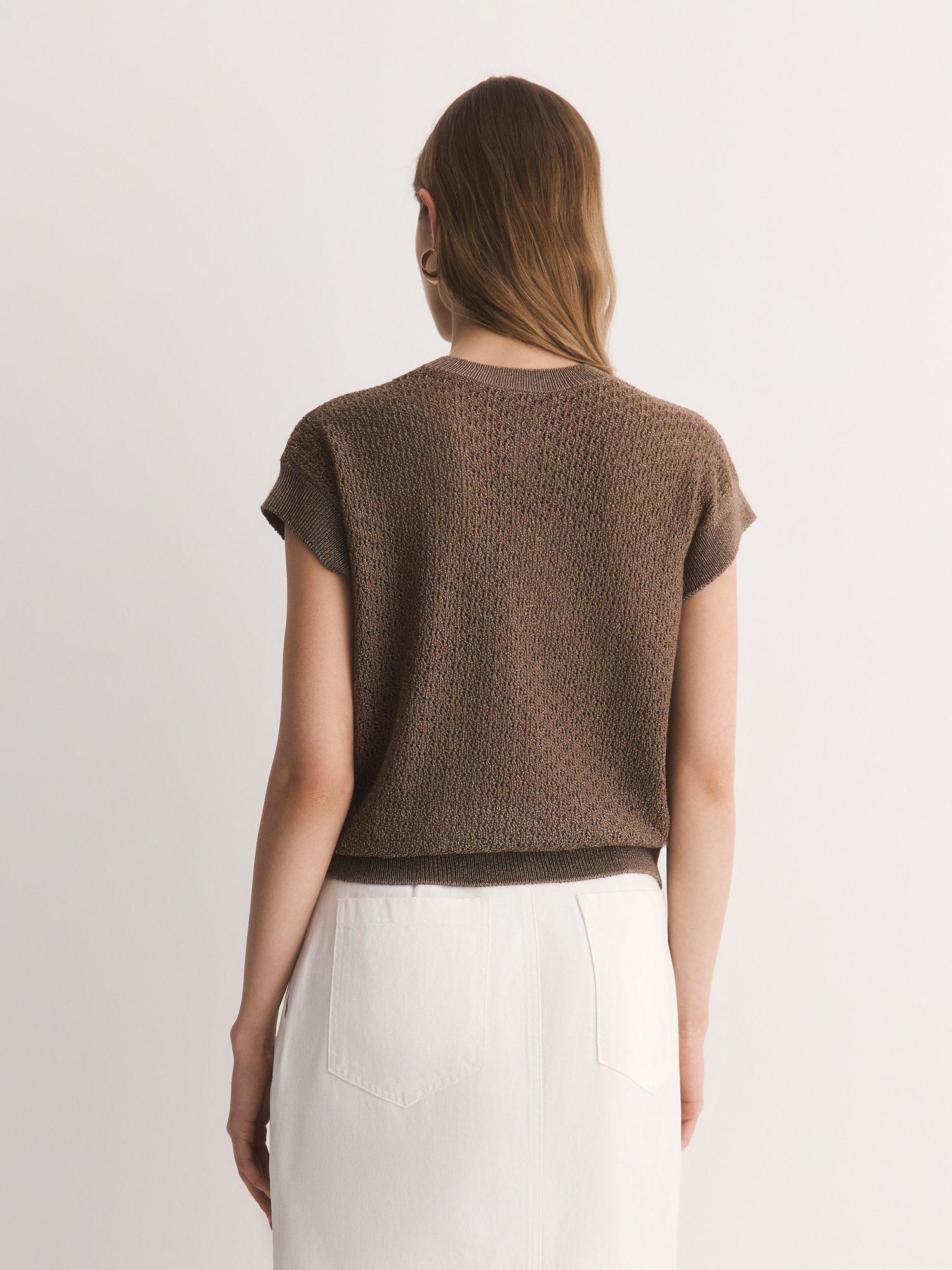 Легкая вязаная блуза цвета какао дополнит множество легких летних образов.