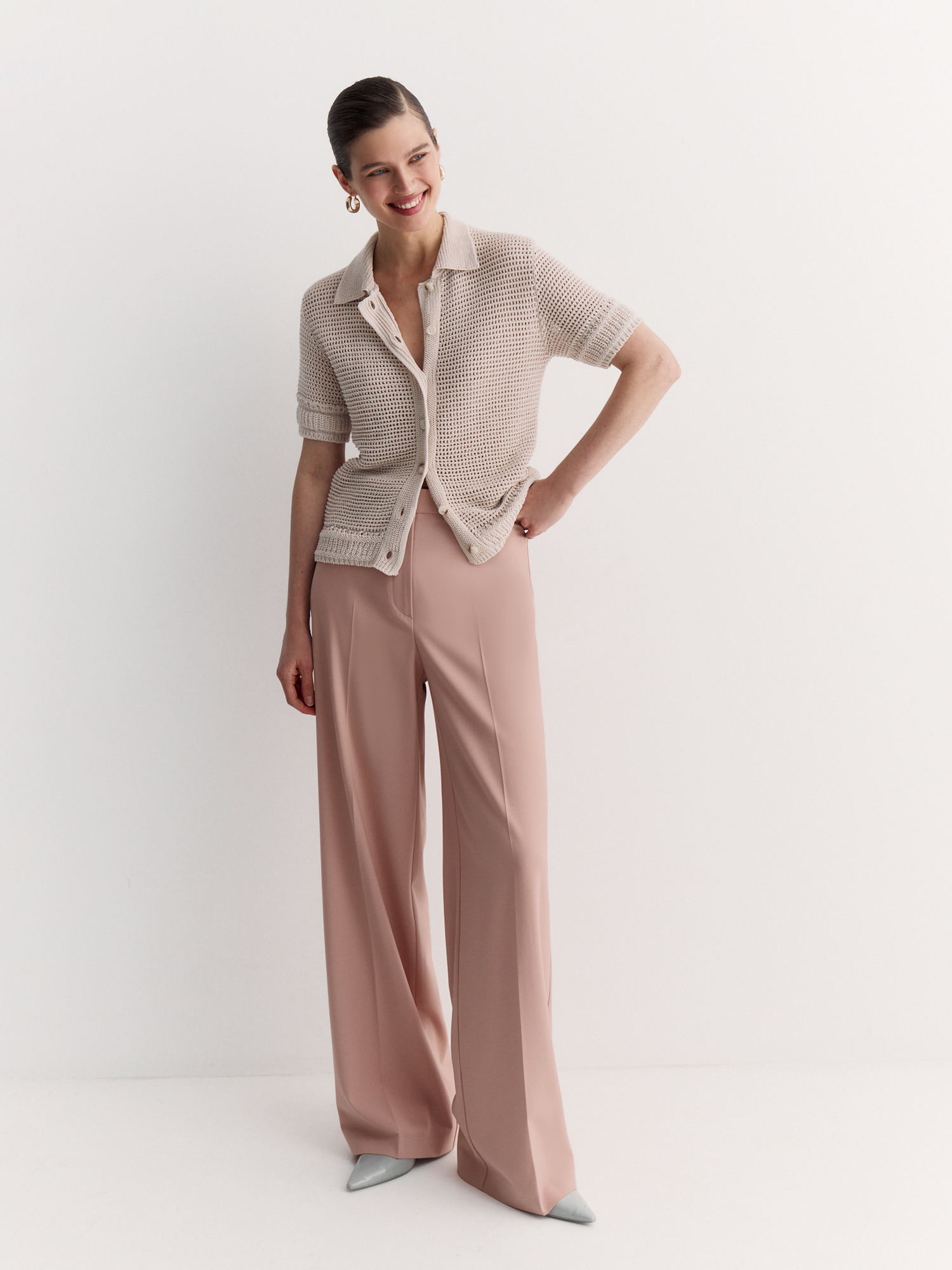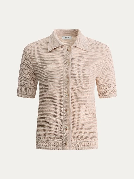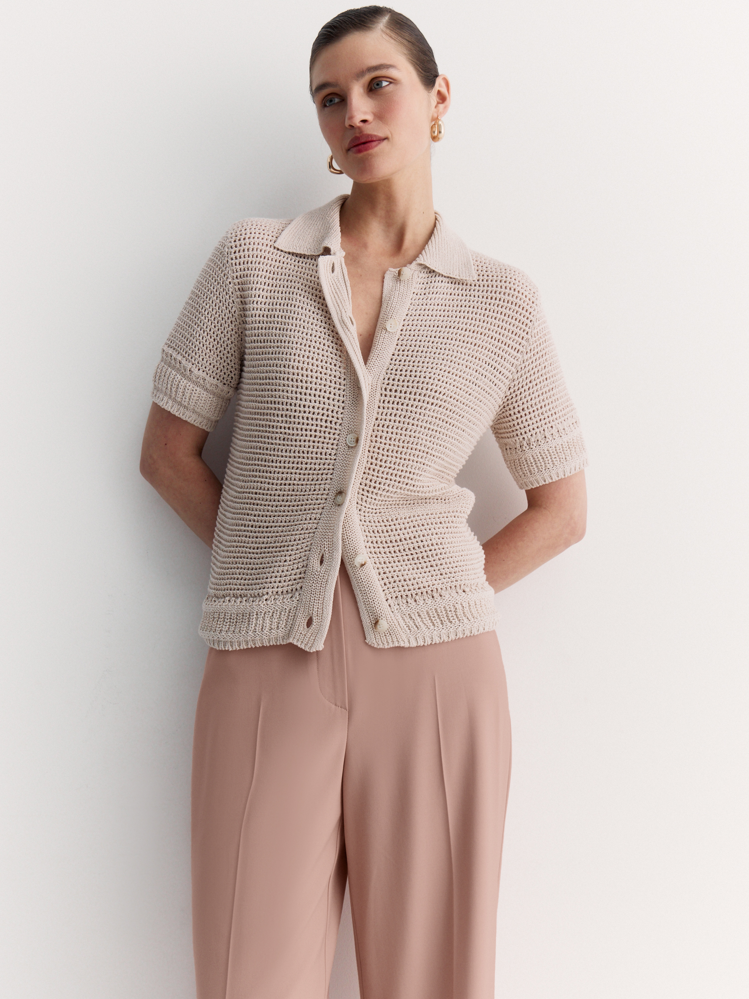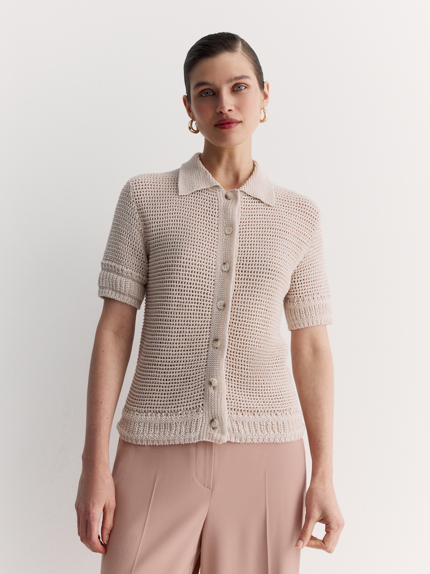 Модель с отложным воротником и короткими рукавами выглядит стильно и необычно. Застёжка на пуговицы делает кардиган удобным в носке.