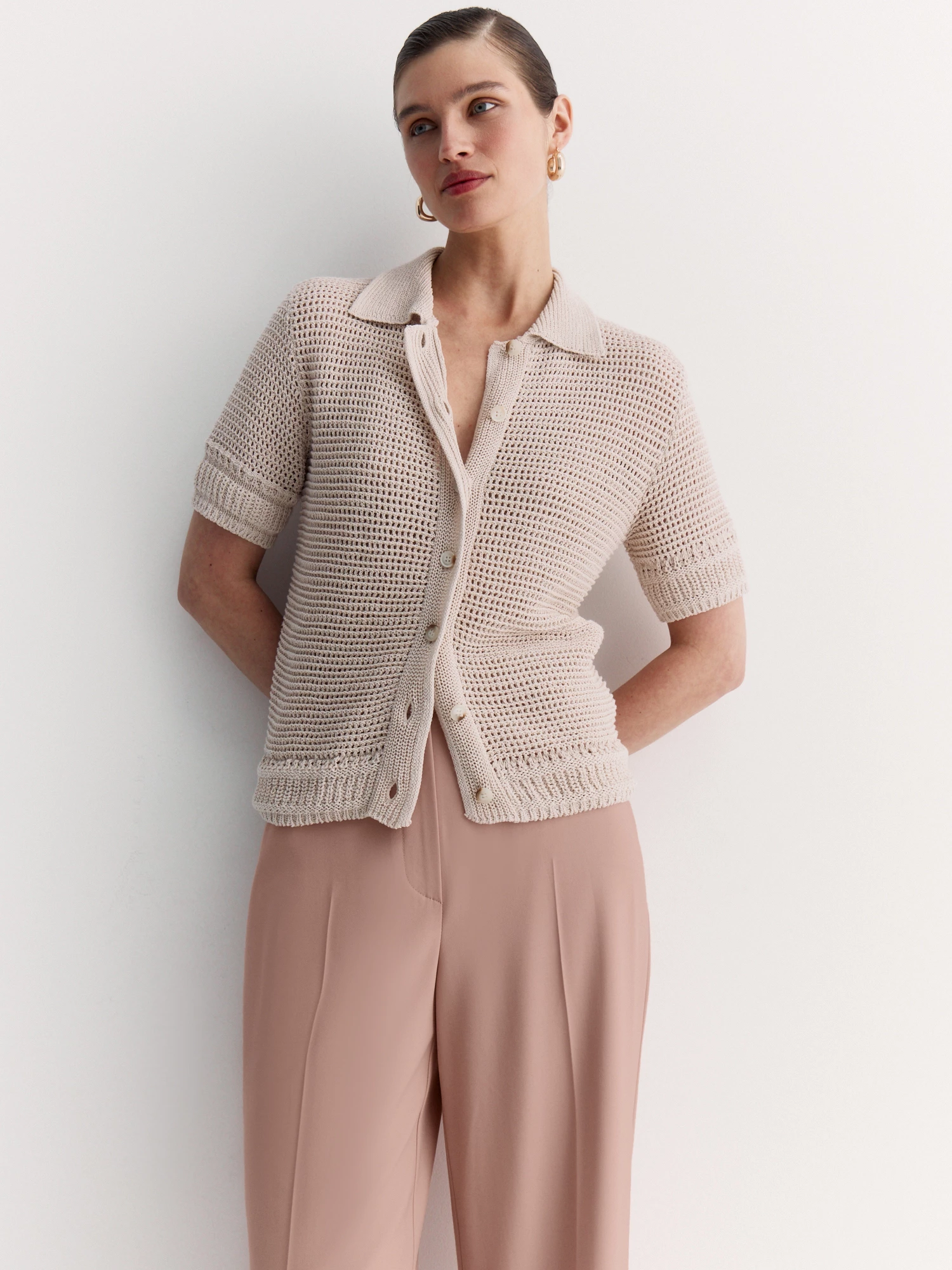 Уютный ажурный кардиган в рустикальном стиле – идеальный вариант для создания уникальных образов. Он как будто связан вручную крючком из итальянской хлопковой пряжи, нежной, дышащей и приятной к телу.