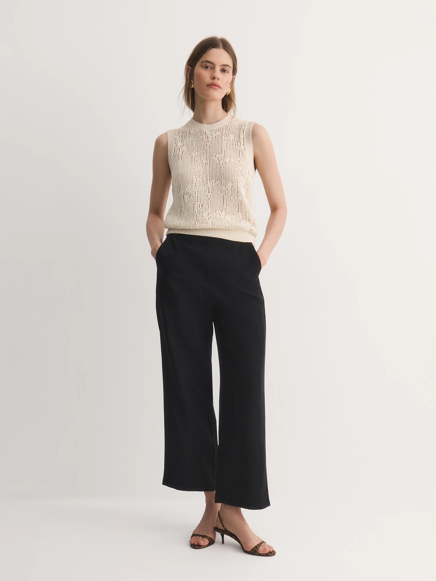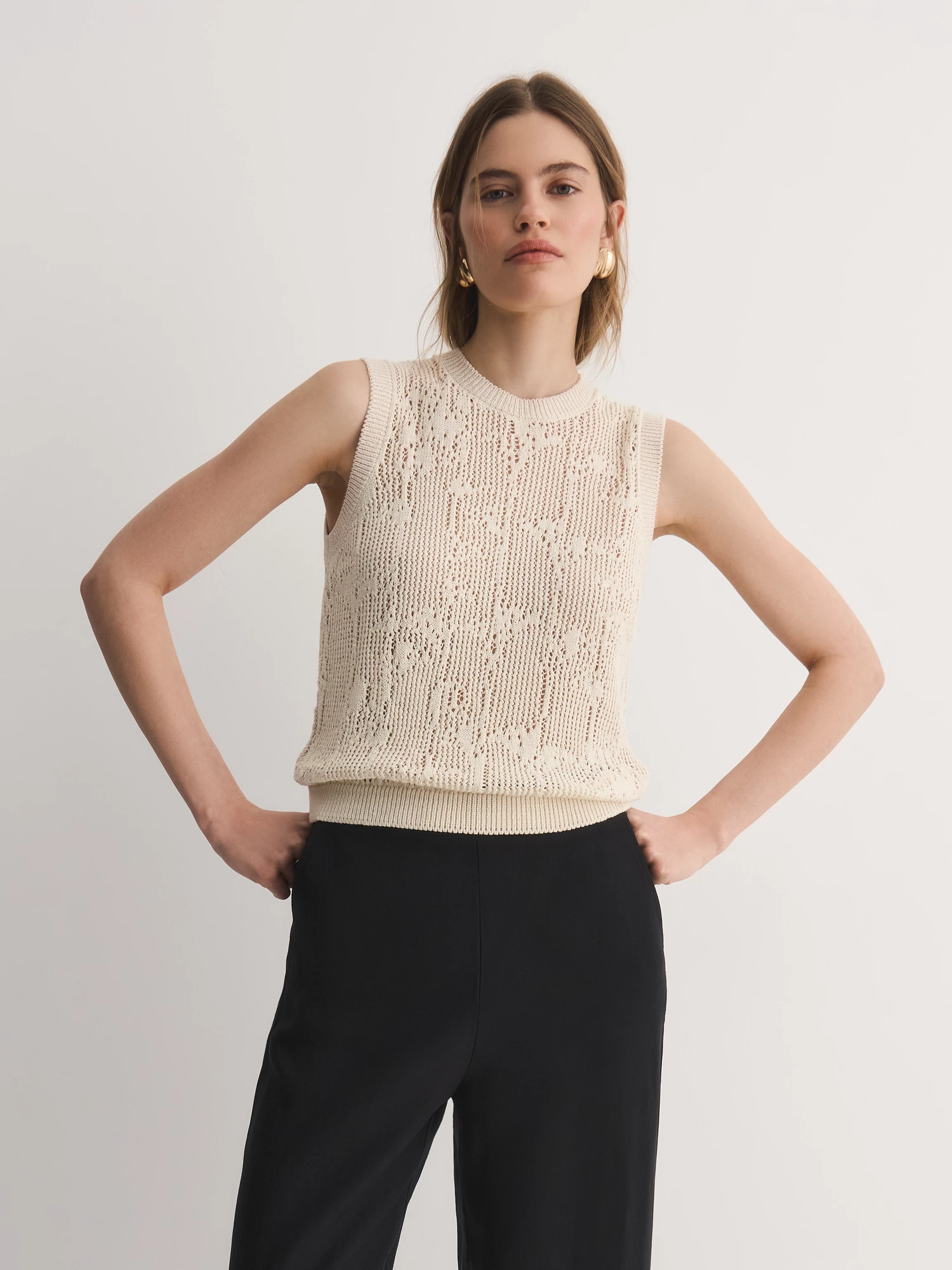 Воздушный ажур, созданный сложным переплетением нитей, воплощен в вязаном трикотаже. Непринужденность ажурной блузки подчеркнута безрукавным кроем - идеально для лета.