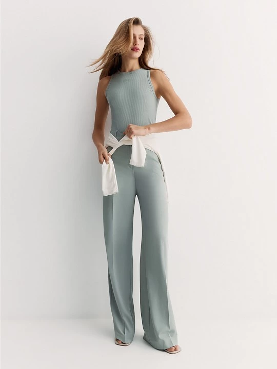 Цвет шалфея позволяет органично вписать топ в образ с жакетом JC0196 и брюками TR05231.