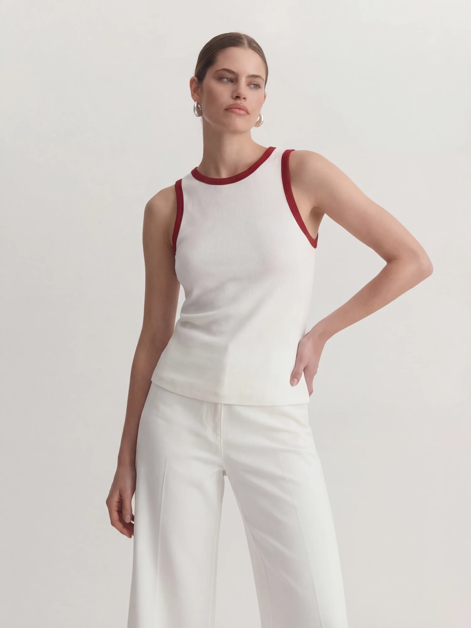 Простой, но изысканный дизайн модели подчеркивается отделкой выреза горловины и проймы окантовкой из контрастной ткани, что обращает внимание на высокое качество пошива. Ткань топа — вискозный трикотаж в рубчик с добавлением спандекса — обладает мягкостью, легкостью и высоким тактильным качеством. Вискоза делает топ воздухопроницаемым, что особенно комфортно в теплое время года, а спандекс придает ткани эластичность, обеспечивая хорошую посадку по фигуре и свободу движений.