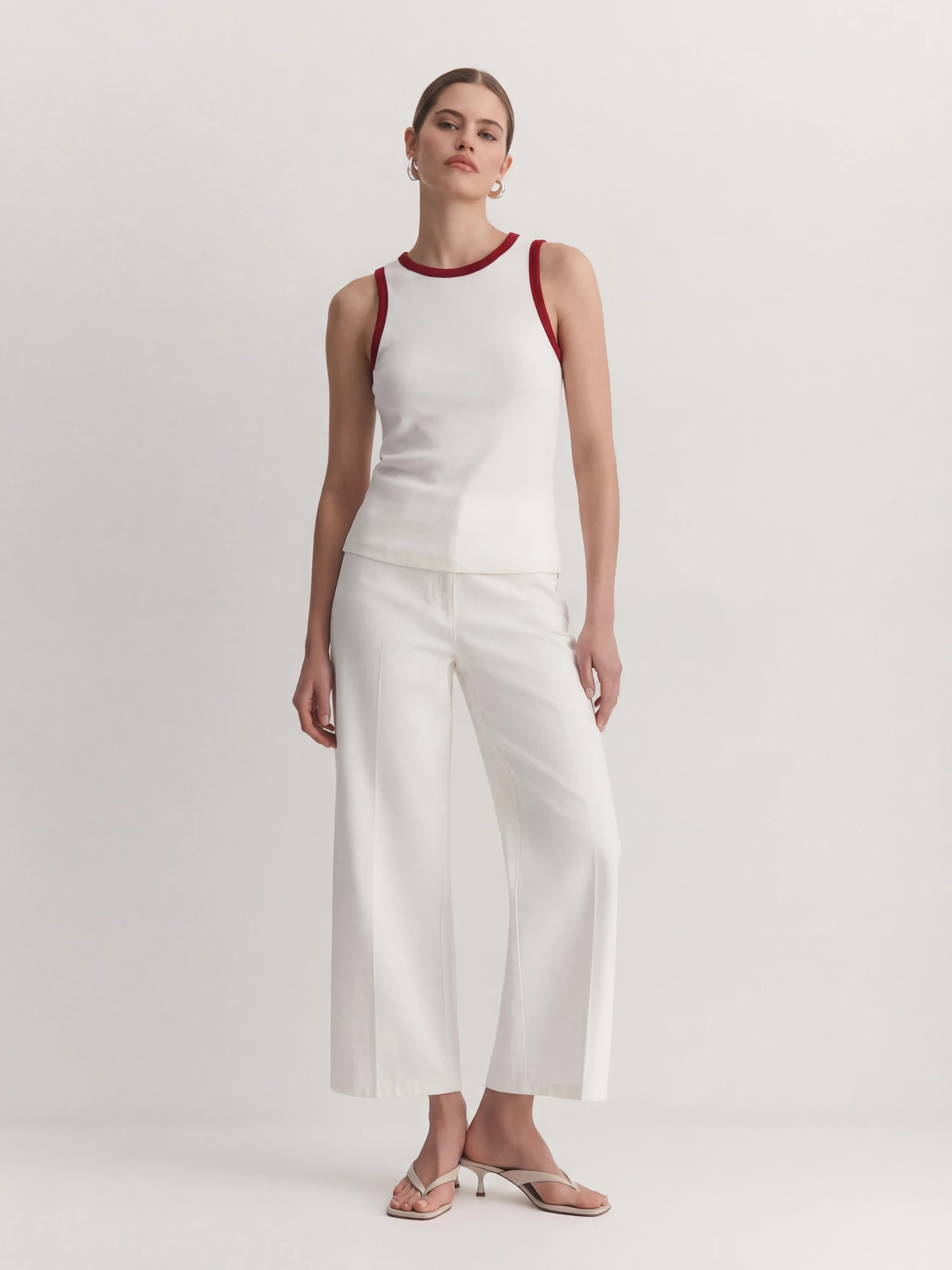Белый - универсальный цвет, который легко сочетается с другими оттенками, что делает топ незаменимым элементом гардероба. Контрастный бордовый кант добавляет элемент дизайна, делая модель интереснее.