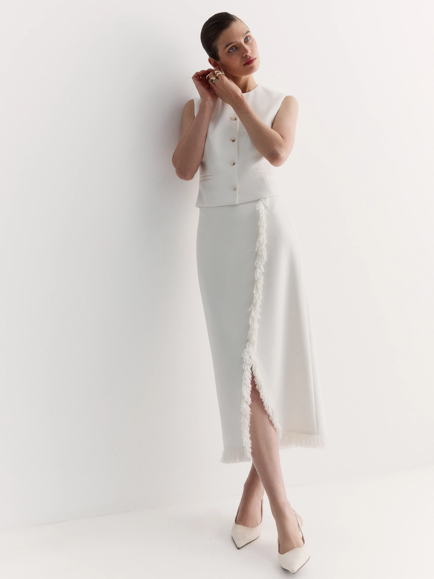 Элегантный белый жилет из турецкой поливискозной ткани – идеальный вариант для создания стильного многослойного образа. Модель с аккуратным круглым вырезом и вертикальными рельефами, которые подчеркивают фигуру, сохраняя комфортную посадку.