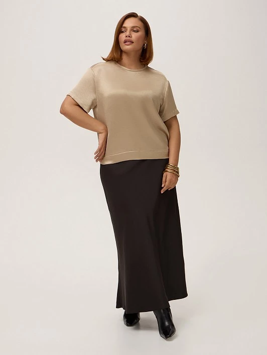 Выбрали для модели высокотехнологичный полиэстер с благородным золотым отливом и эффектом крэш. Такая жатая ткань не мнется, сохраняя форму весь день и не требуя особого ухода. Светло-бежевый с золотистым подтоном комплементарен к темным, светлым и ярким оттенкам.