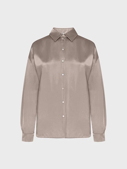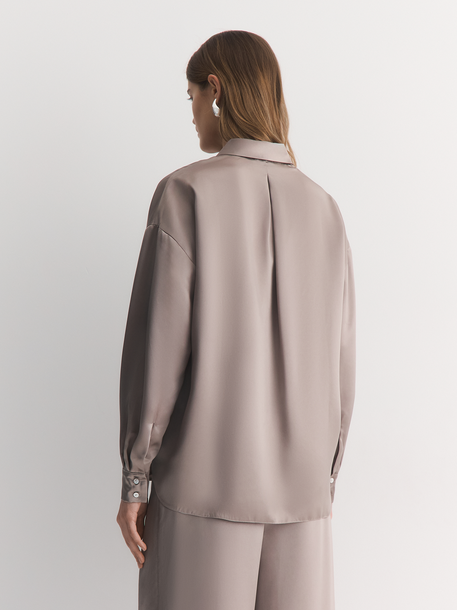 Шелковистый ацетат в атмосферном сером цвете красиво драпируется, создавая эффектные складки и подчеркивая женственность силуэта. Блуза легко комбинируется с различными аксессуарами и обувью, что делает ее незаменимой в любом гардеробе.
