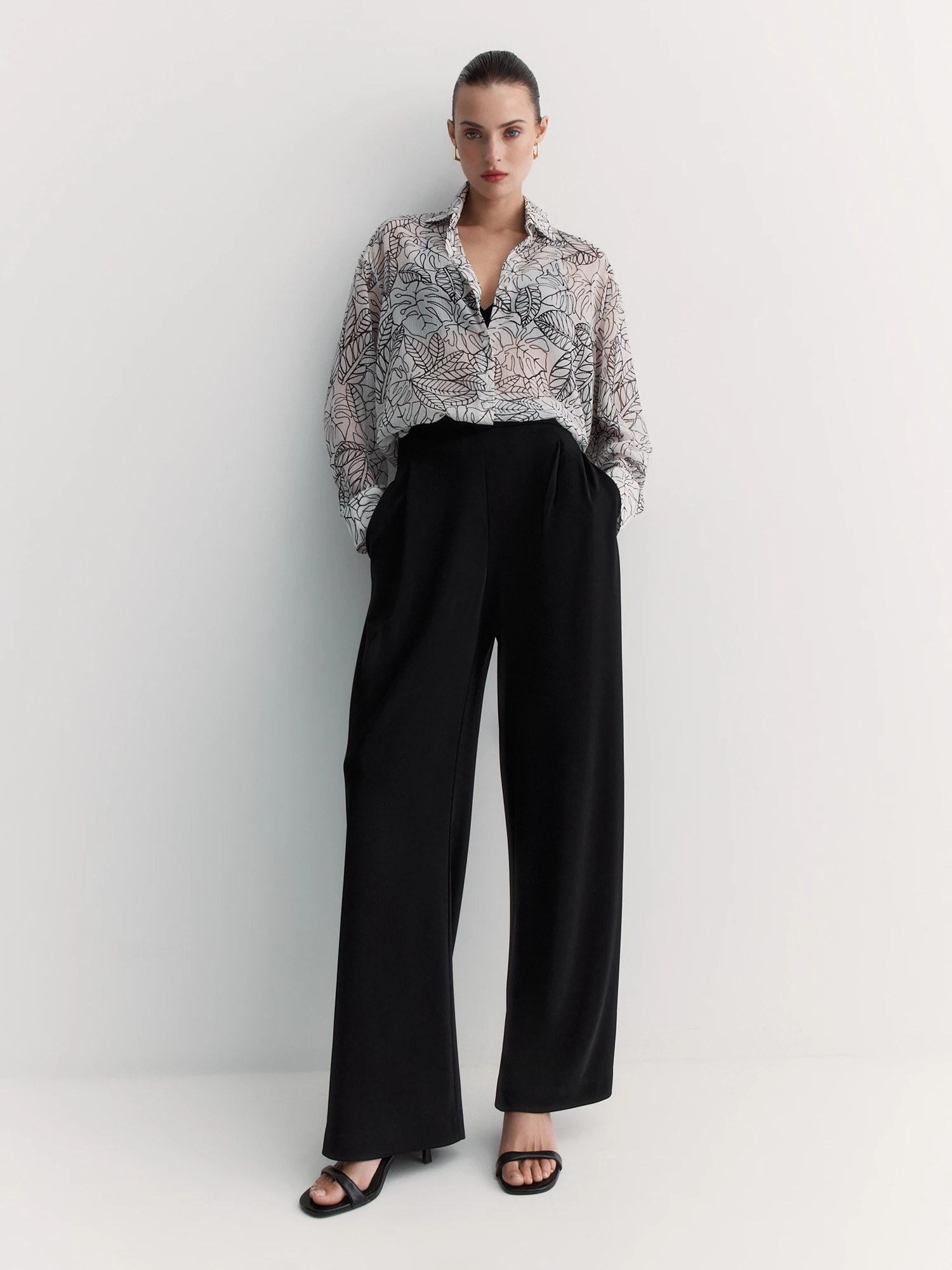 Блуза из лёгкого шифона создаёт воздушный силуэт. Такая ткань прекрасно драпируется, позволяя носить блузу навыпуск, под пояс или заправленной. Черно-белый растительный узор привлекает внимание.