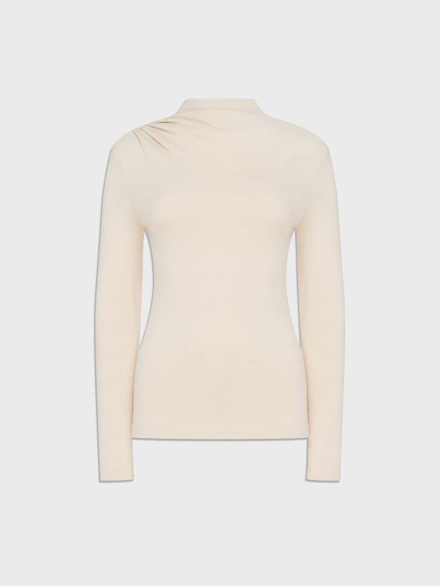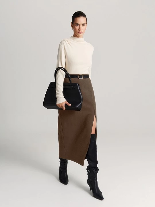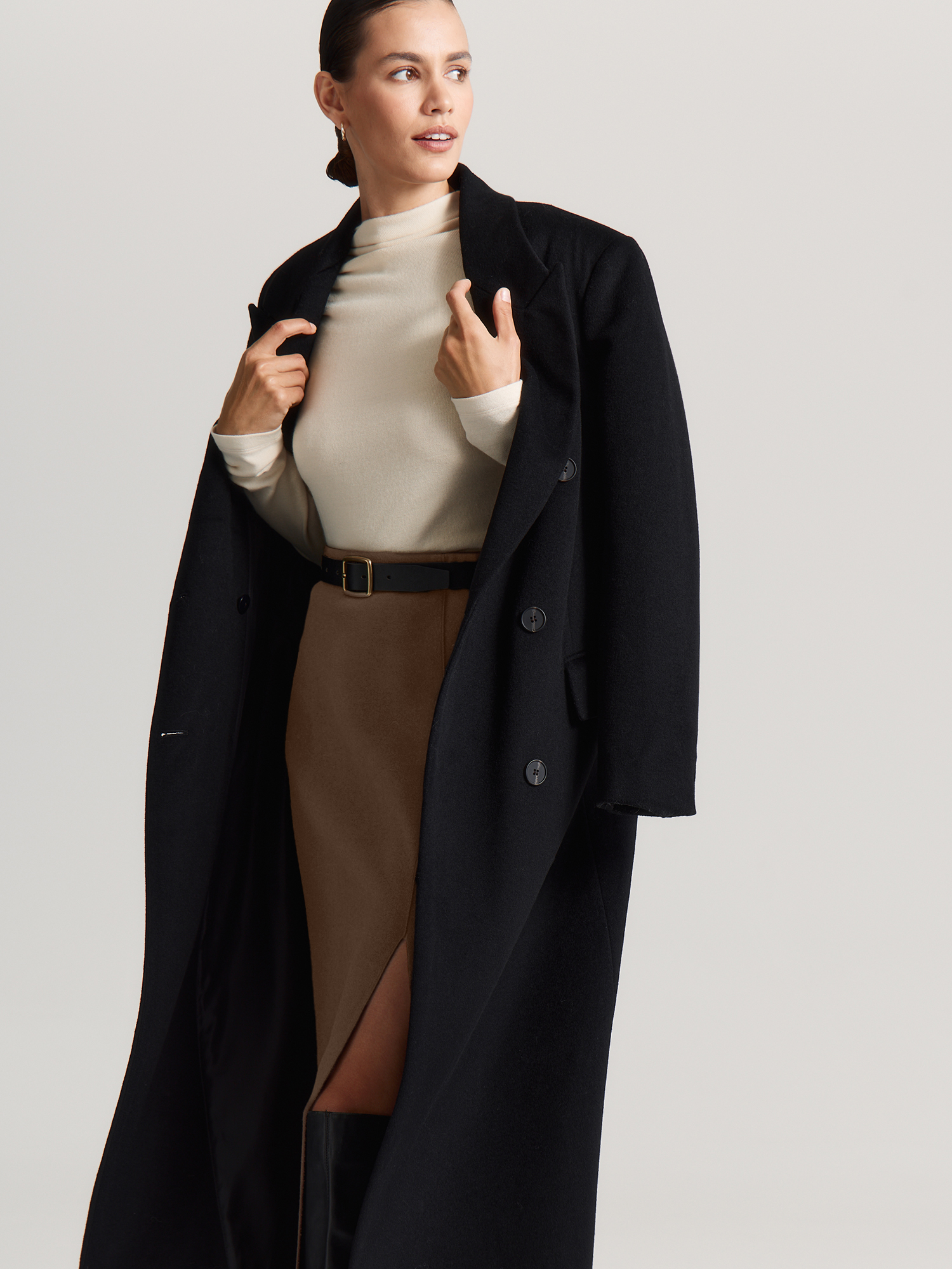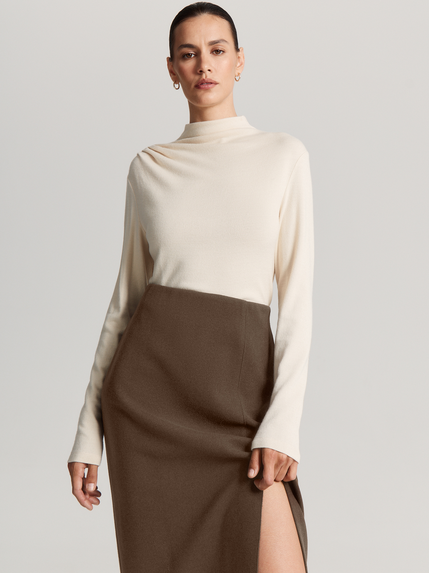 Небольшая стойка и длинные рукава делают модель комфортной для осенне-зимнего сезона, а складки на плече образуют изящную асимметричную драпировку на груди, добавляя модели визуального интереса.