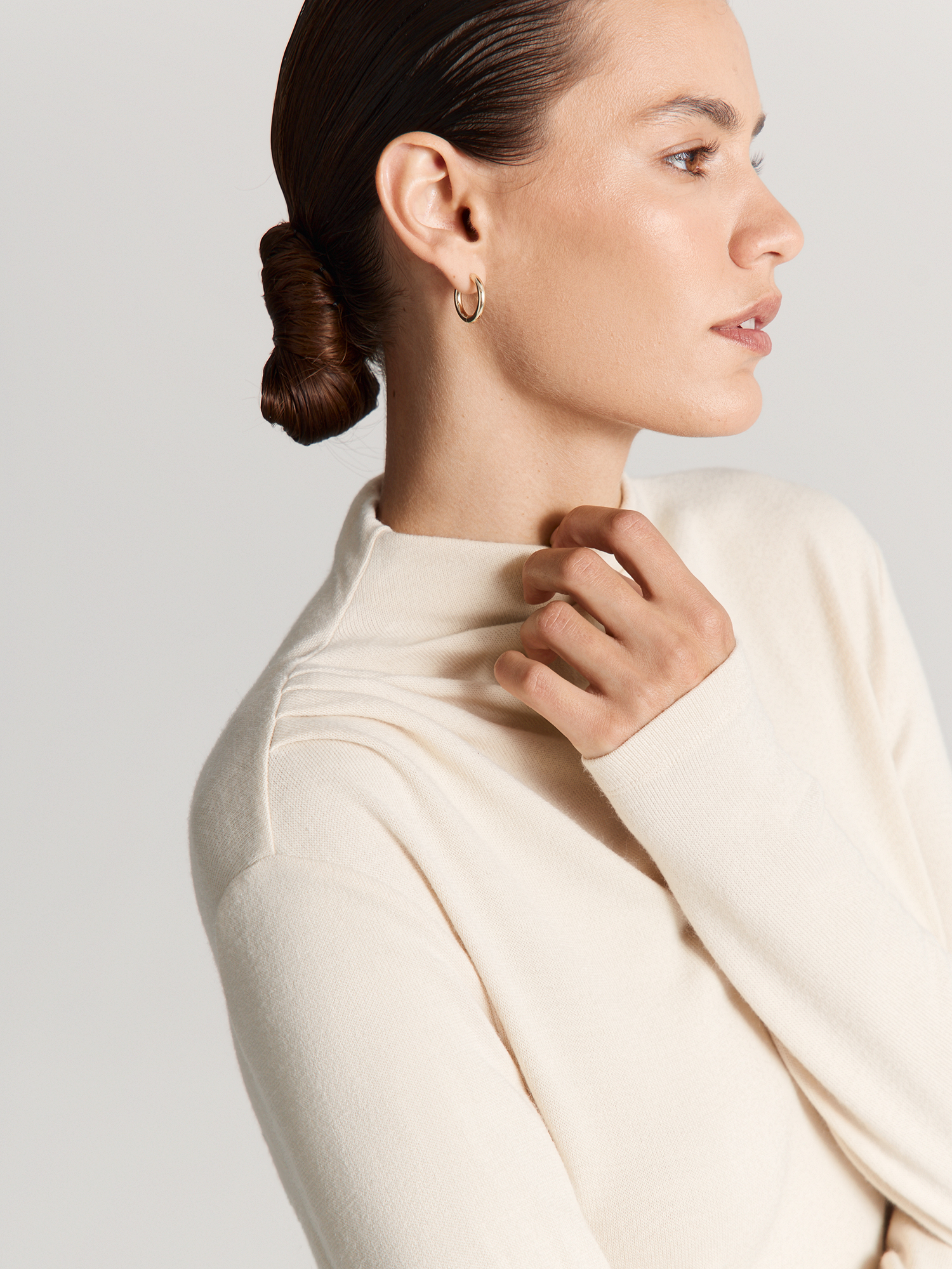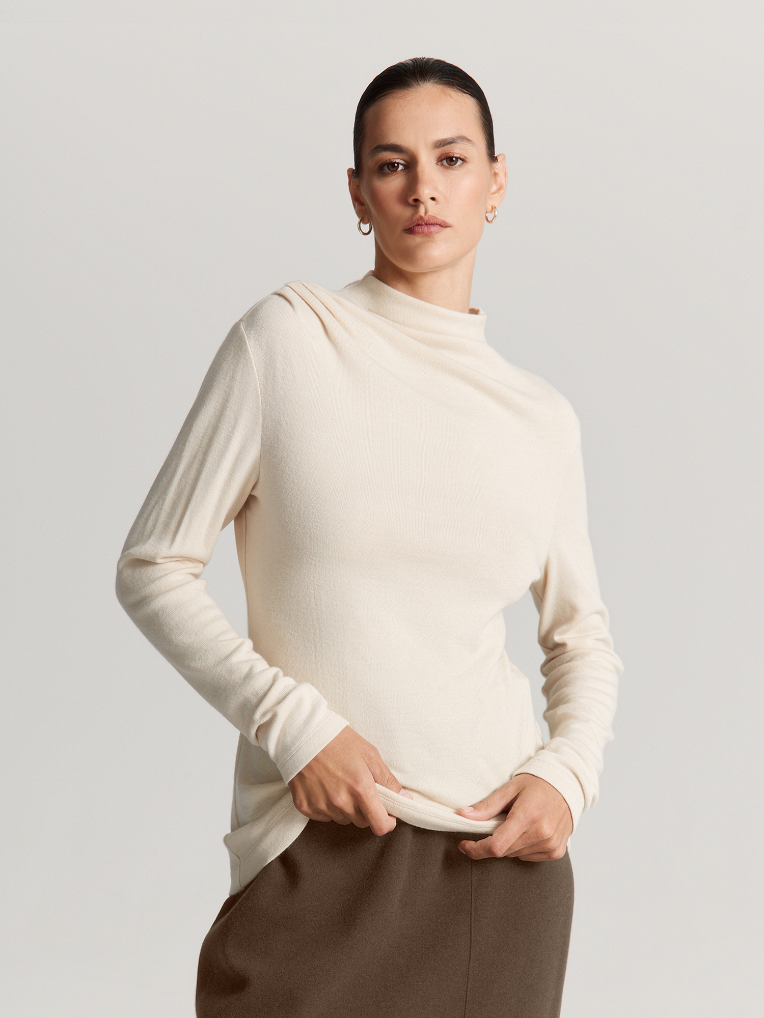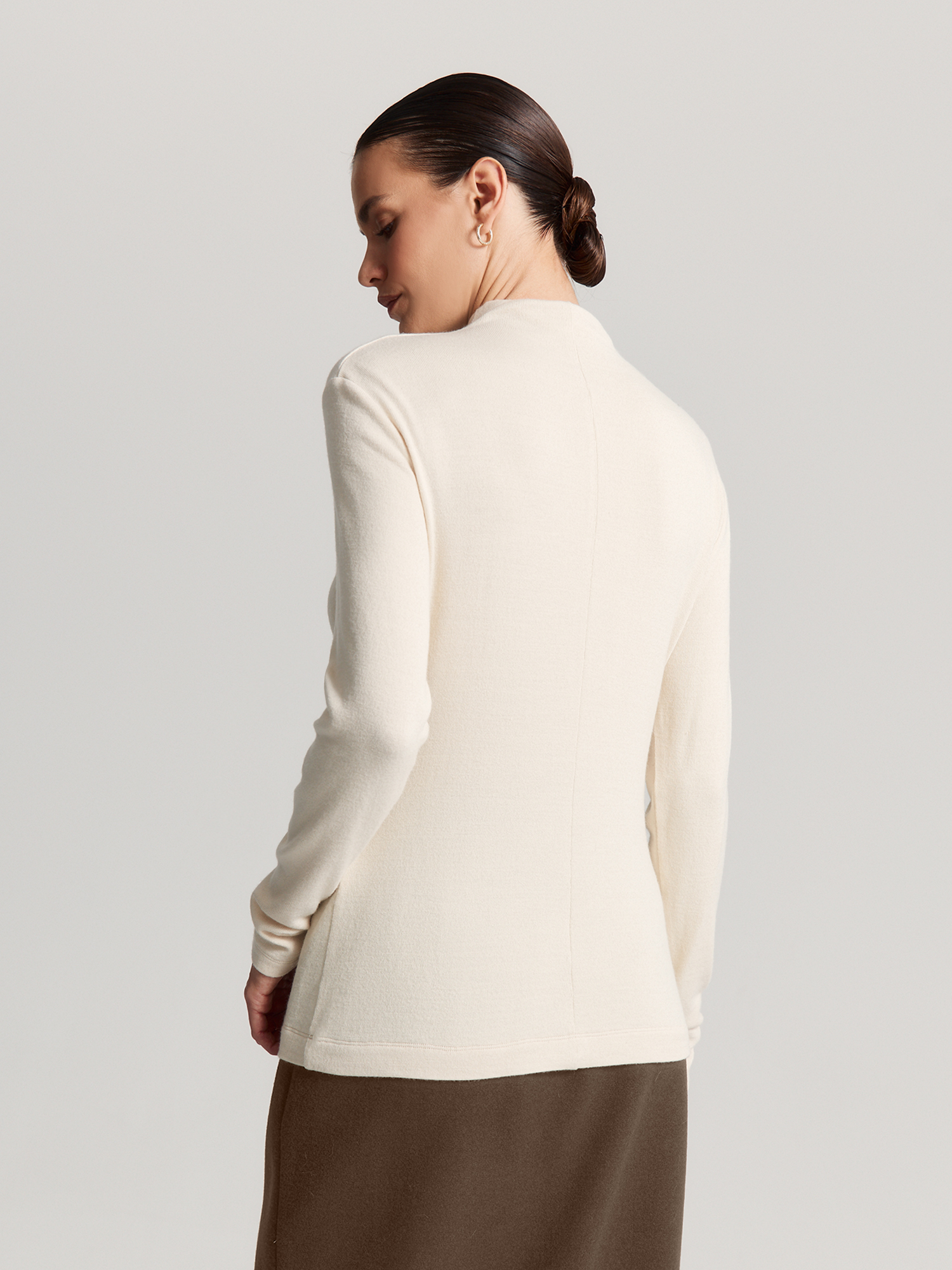 Трикотажная блуза с низкой цельнокроеной стойкой и длинными рукавами сшита из мягкой эластичной ткани. Согревающая овечья шерсть делает блузу теплой и уютной. Она хорошо тянется, удобно сидит и приятна на ощупь.