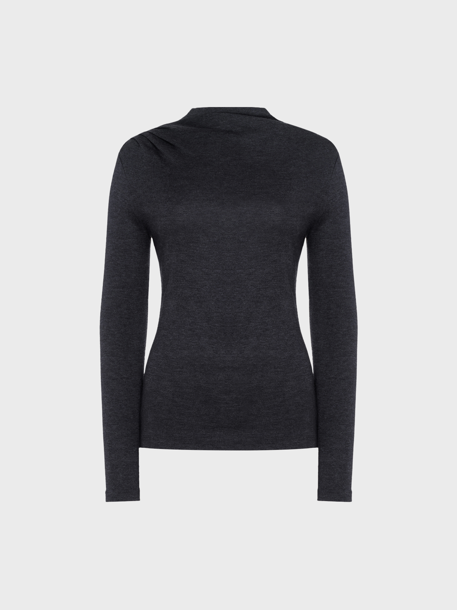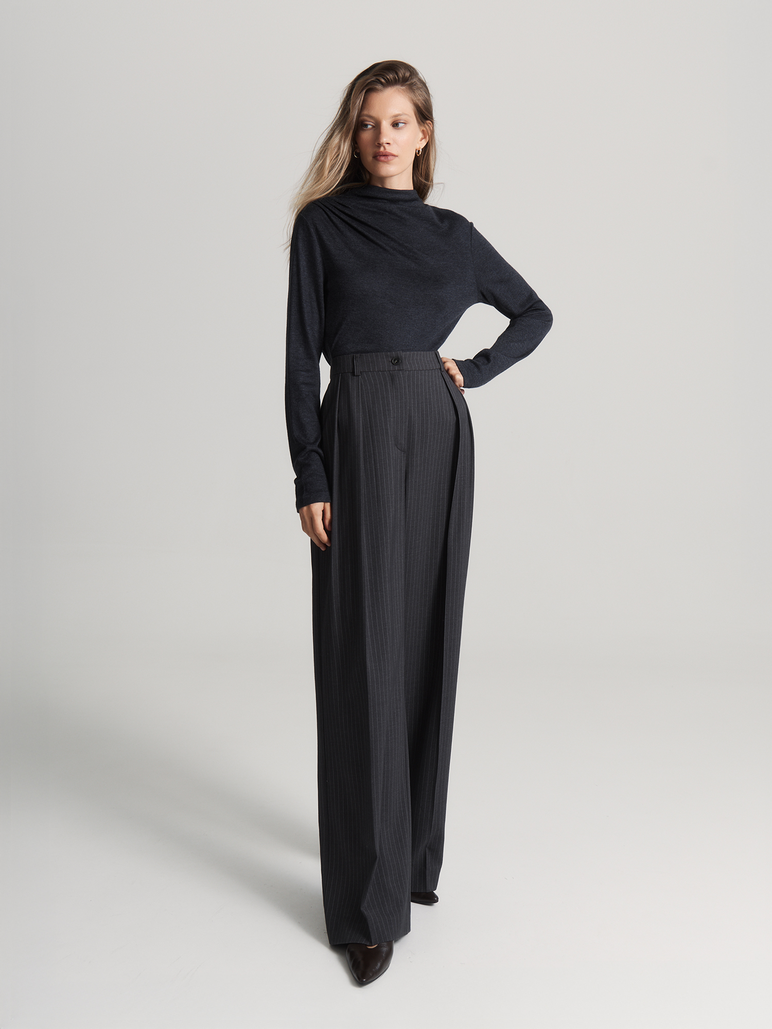 Небольшая стойка и длинные рукава делают модель комфортной для осенне-зимнего сезона, а складки на плече образуют изящную асимметричную драпировку на груди, добавляя модели визуального интереса.