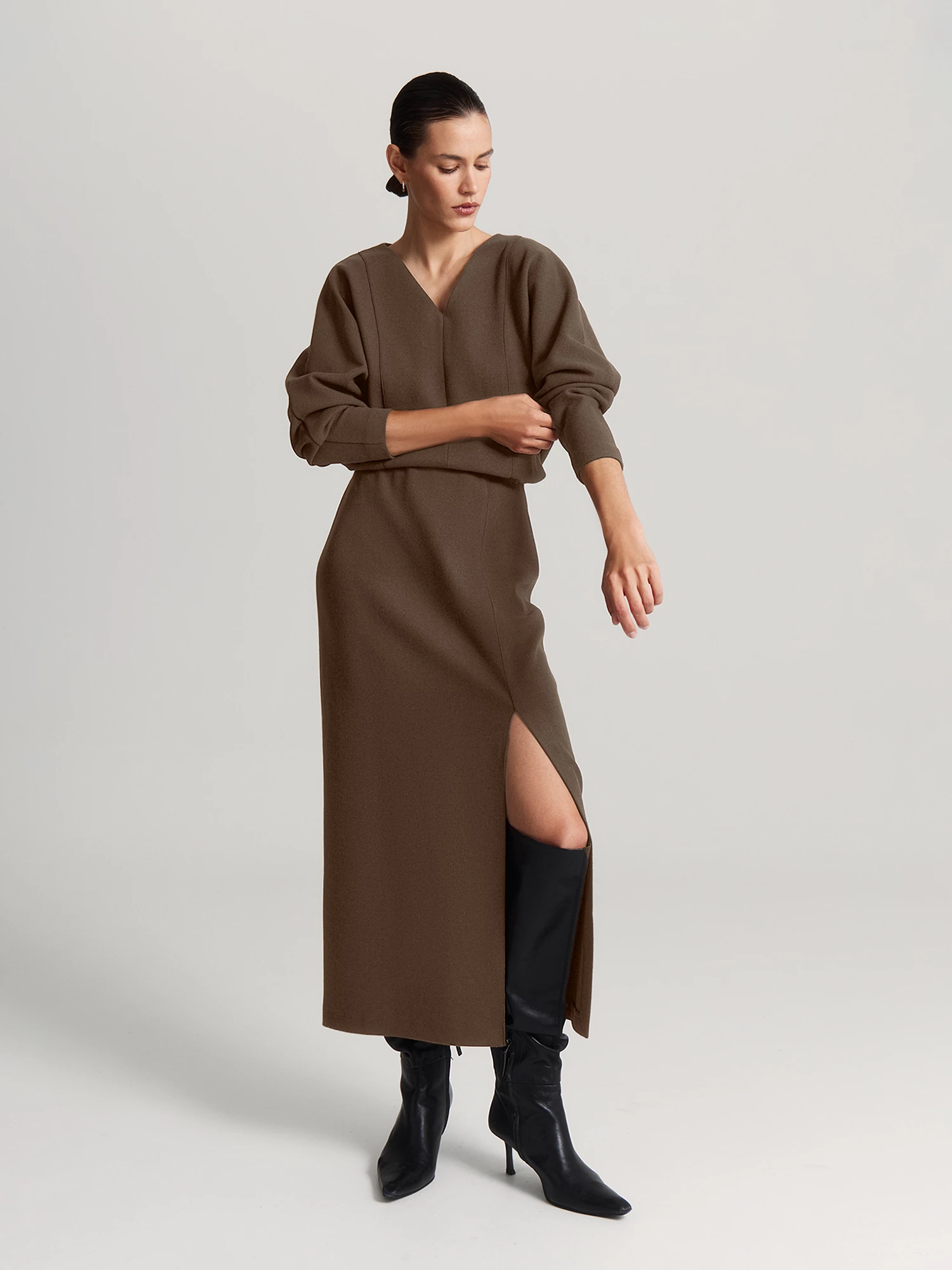 Насыщенный оттенок «шоколадный мартини» выглядит благородно и сочетается с юбкой SK0594K, брюками и джинсами коллекции.
