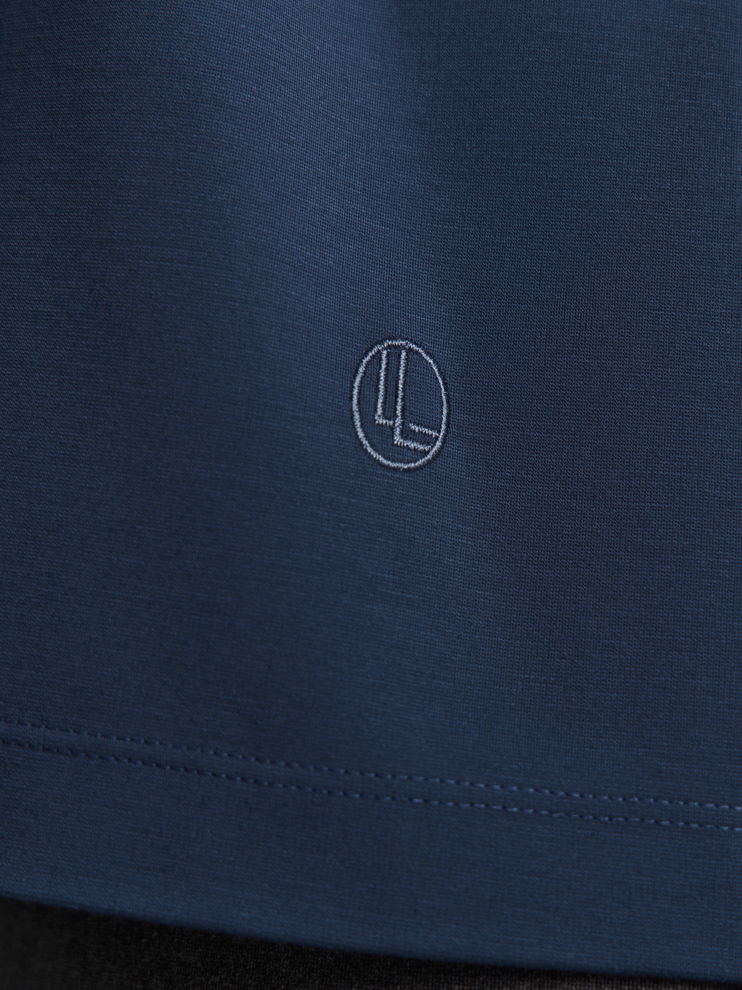 Модель прямого силуэта с коротким цельнокроеным рукавом и аккуратной круглой горловиной, обработанной бейкой, выглядит лаконично и стильно. Декор-вышивка в виде лого бренда как визуальная подпись дизайнеров.