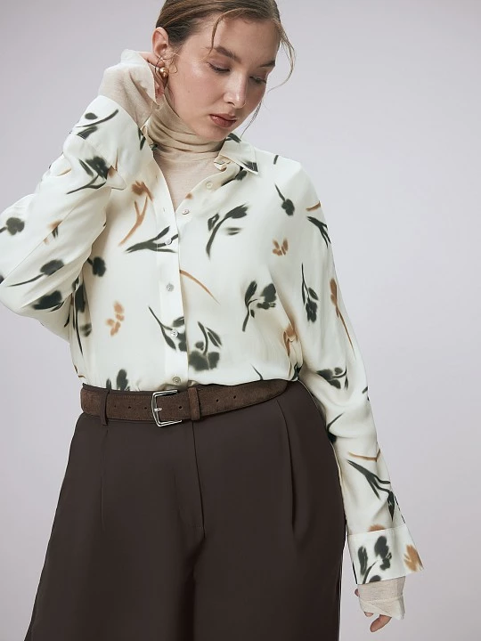 Блуза, изготовленная из высококачественной вискозы, представляет собой идеальный выбор для тех, кто ценит комфорт и стиль. Вискоза известна своей мягкостью и приятной текстурой, что делает блузу особенно комфортной в носке, особенно в теплую погоду. Легкий и струящийся материал создает эффектный силуэт, подчеркивая женственность и элегантность образа. Модель блузы выполнена в классическом рубашечном стиле, что придает ей аккуратный и стильный вид. Отложной воротник на отрезной стойке и застежка на пуговицы добавляют нотку строгости и формальности, что делает модель подходящей как для офисного, так и для повседневного стиля. Цельнокроеный рукав с широким манжетом обеспечивает свободу движений и комфорт, а прямой силуэт создает легкость и непринужденность. Одной из ключевых особенностей этой блузы являются высокие разрезы по бокам, которые не только обеспечивают комфортное прилегание по бедрам, но и расширяют возможности для стилизации. Вы можете экспериментировать с образом, оформляя блузу на запах, заправляя ее в юбку или брюки, или заправляя только передние полочки, создавая тем самым различные варианты луков. Завязывание концов блузы также добавит игривости и оригинальности в образ. Блуза представлена в нежном молочном цвете, который придает ей свежесть и легкость. Этот универсальный оттенок легко комбинируется с различными цветами и фактурами, что делает рубашку отличным дополнением к любому гардеробу. Акварельный цветочный принт, украшающий модель, добавляет романтичности и изысканности, делая блузу не только стильной, но и уникальной. Таким образом, блузка рубашечного кроя из вискозы — это не просто элемент одежды, а универсальный аксессуар, который поможет создать множество стильных образов для различных случаев, от деловых встреч до романтических вечеров.
