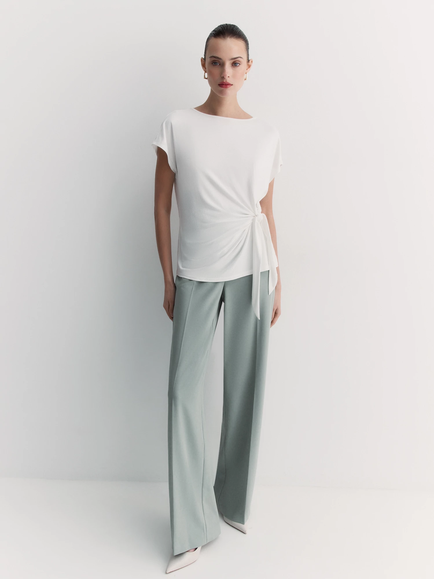 Цельнокроеный короткий рукав и элегантный вырез-лодочка создают лаконичный силуэт. Фиксирующий асимметричный узел добавляет модели оригинальности и становится её изюминкой.