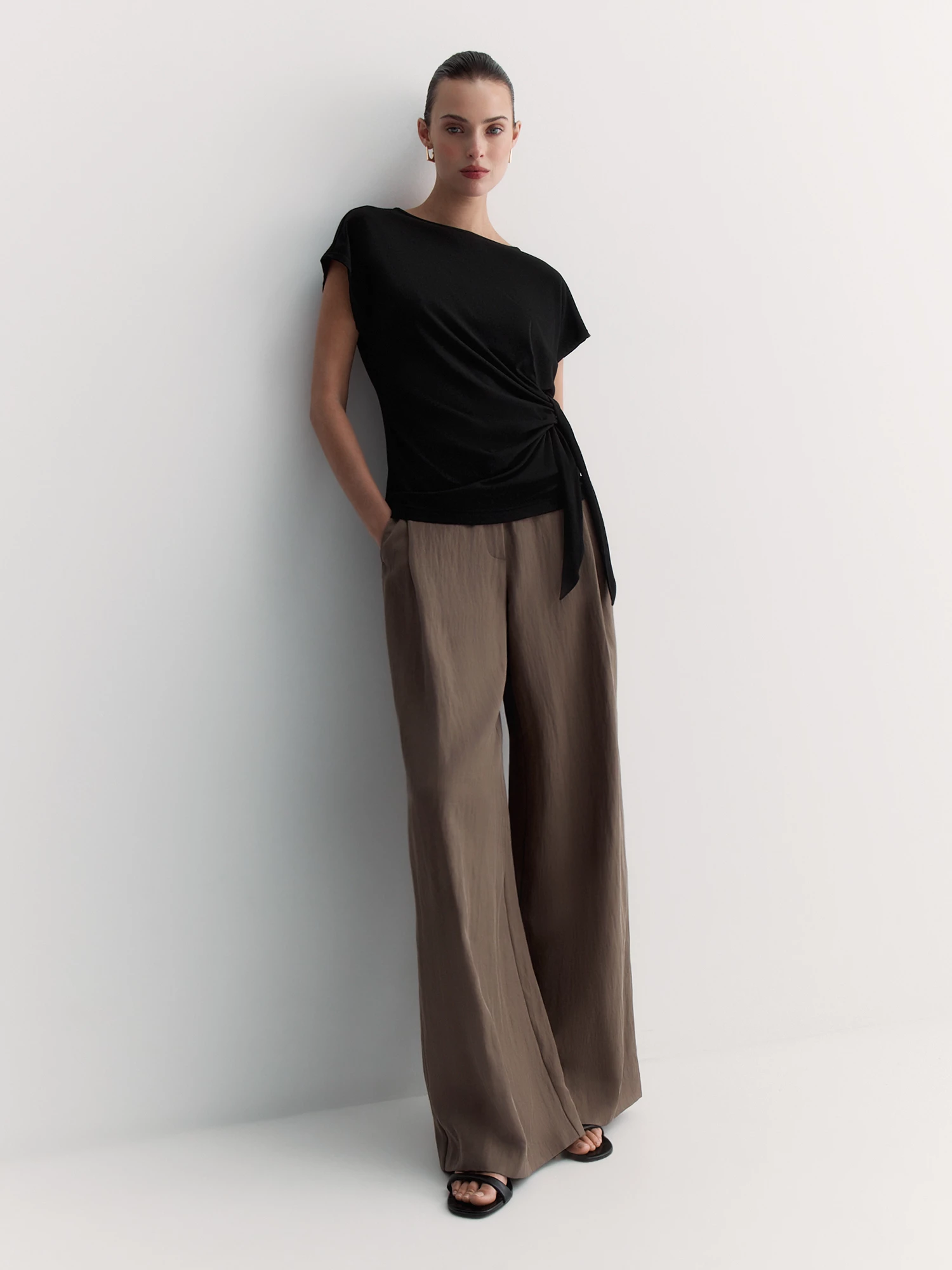 Цельнокроеный короткий рукав и элегантный вырез-лодочка создают лаконичный силуэт. Фиксирующий асимметричный узел добавляет модели оригинальности и становится её изюминкой.