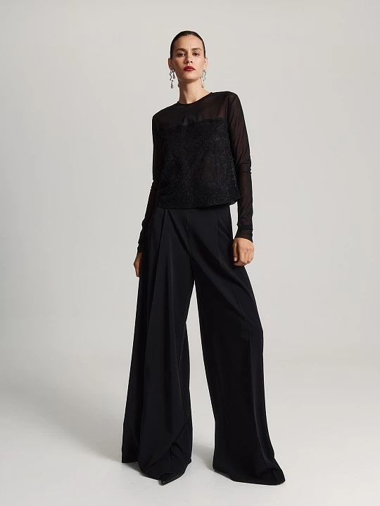 Укороченная блуза из мягкой и густой сетки нежно облегает фигуру. Полупрозрачная основа модели комплементарна к телу и выгодно оттеняет фактурное кружево с фестонным краем.