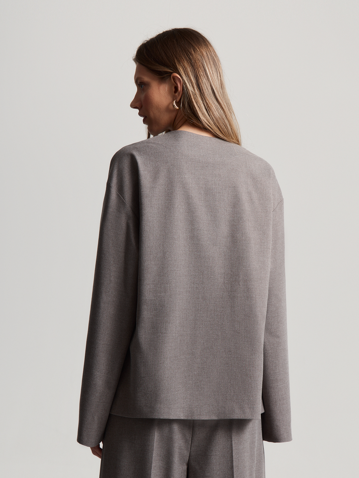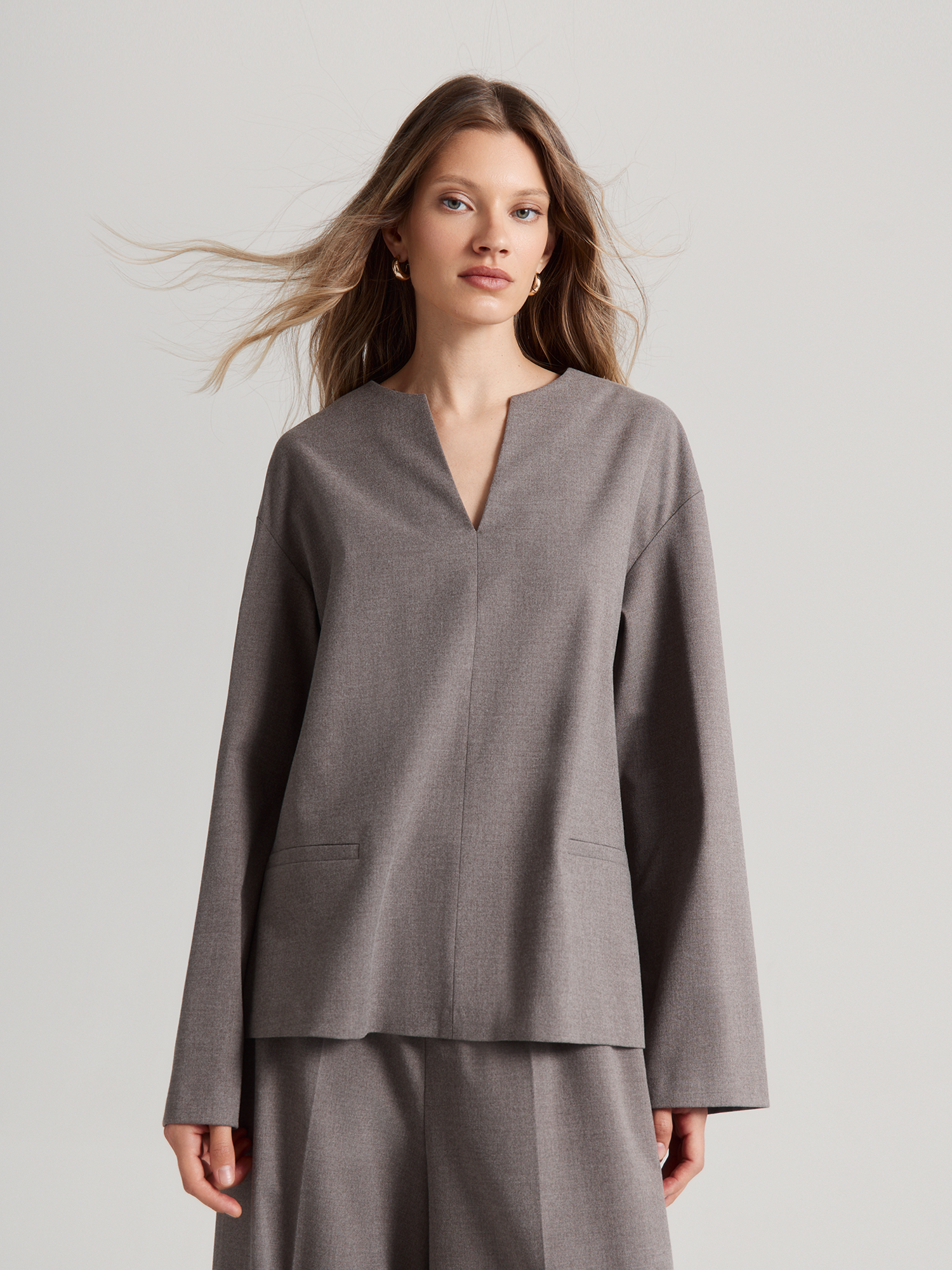 Блуза прямого силуэта с длинным рукавом сшита из качественной костюмной ткани. Поливискозное полотно мало сминаемо, приятно к телу, долговечно и прекрасно драпируется.