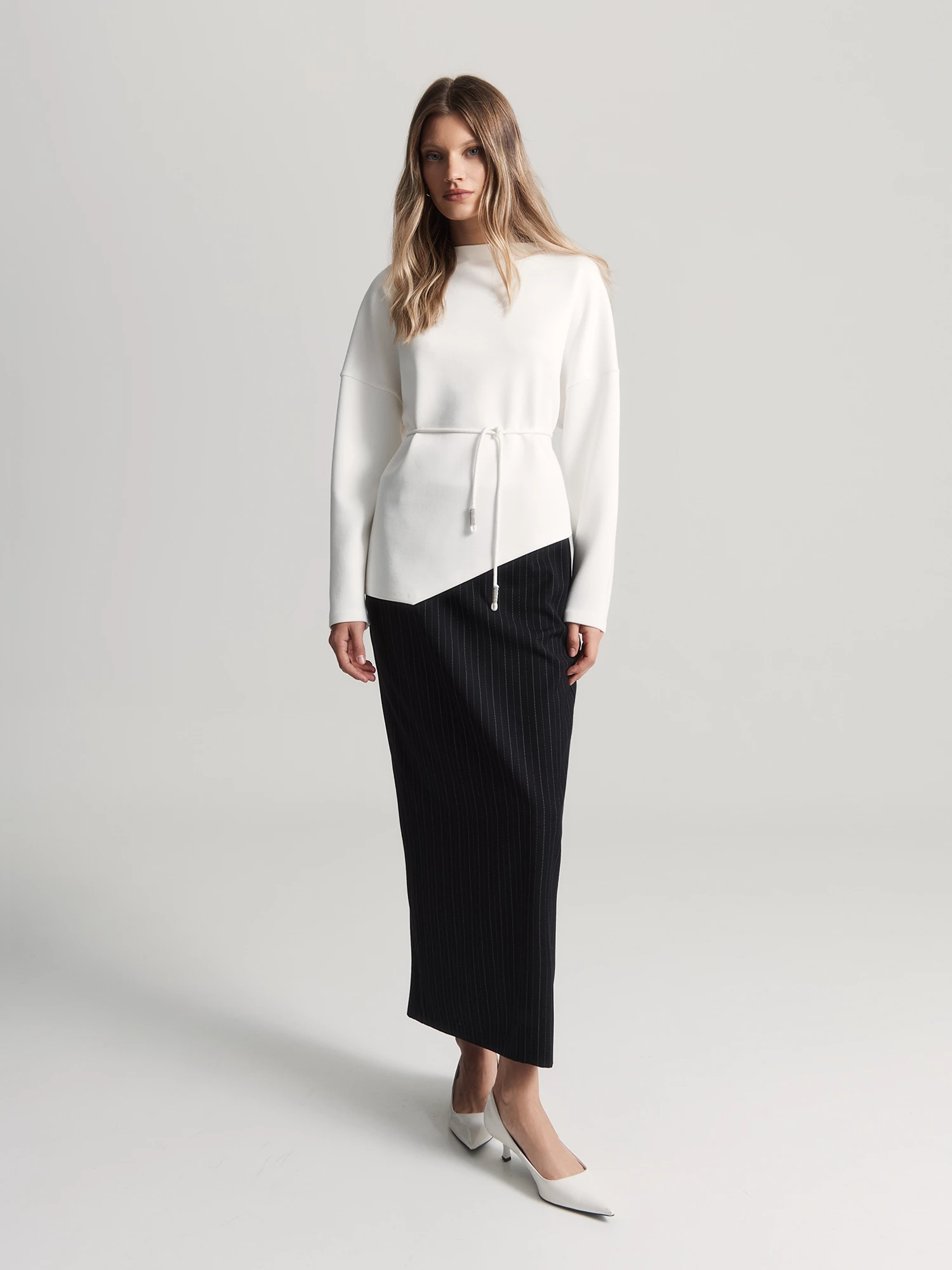 Модель с невысокой цельнокроеной стойкой и асимметричным низом выглядит необычно и стильно. Длинные рукава со спущенным плечом и пояс, декорированный монилью, добавляют образу изящества.
