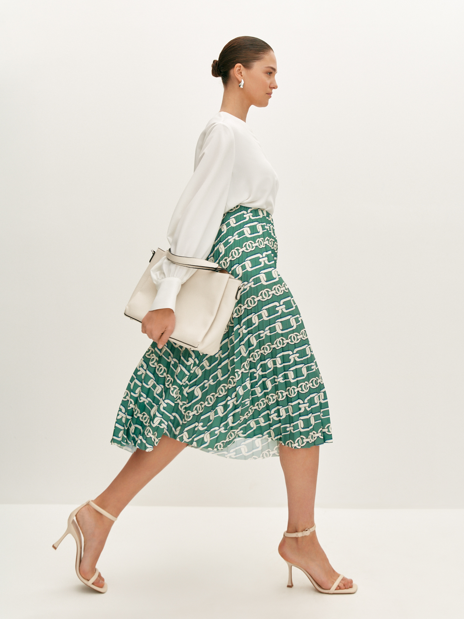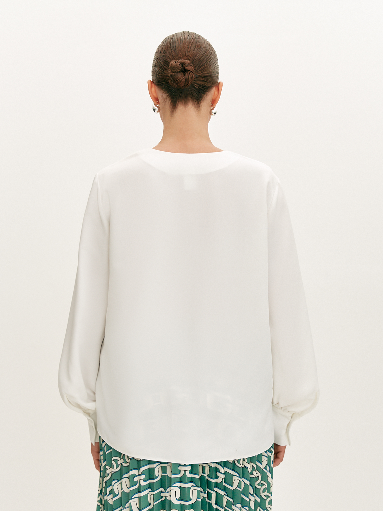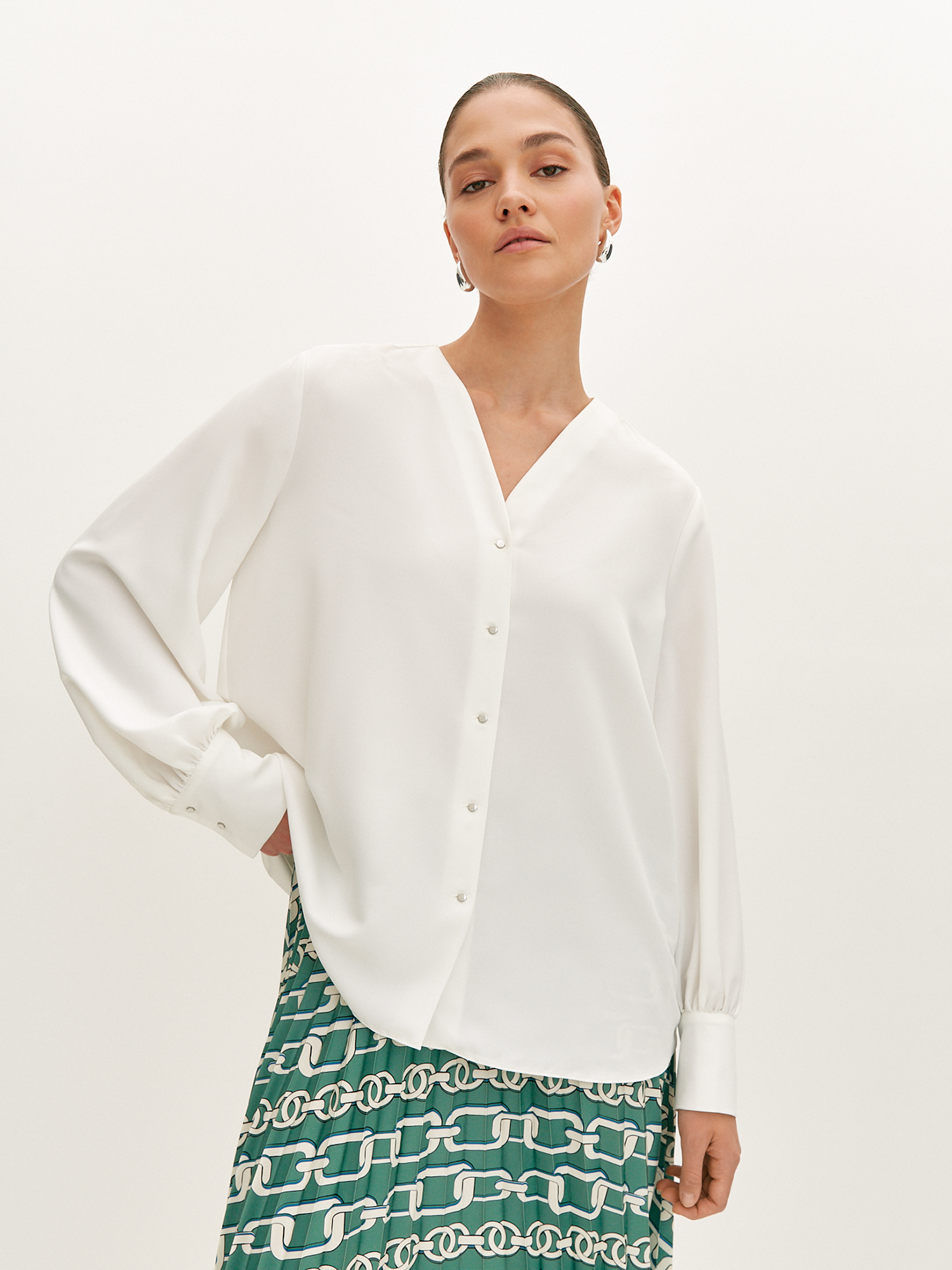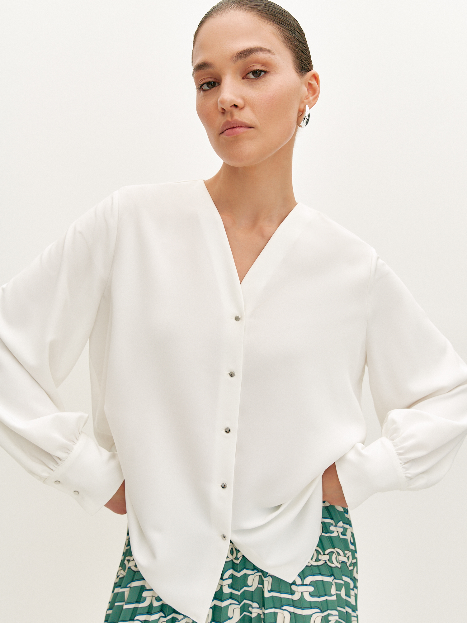 Молочная элегантная блуза с рукавом с пышной сборкой. Трендовая модель с объемными рукавами придает образу легкость и невесомость, а V-образный вырез визуально удлиняет шею. Прочный, износостойкий материал легок в уходе, и надолго станет самостоятельной базовой вещью в вашем гардеробе.