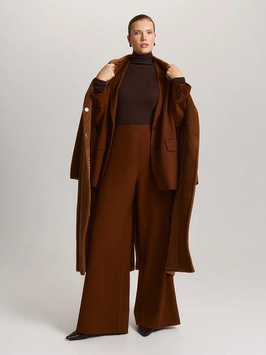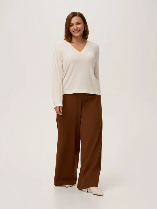 Блузка из мягкого кроеного трикотажа с эффектом ручной вязки — воплощение уютной элегантности и современного комфорта, созданное для тех, кто ценит в одежде гармонию природной мягкости и стильного дизайна. Нежный молочный цвет придает образу теплую изысканность, делая блузу универсальной основой как для повседневных ансамблей, так и для торжественных выходов. Эффект вязки придает трикотажу особую текстуру, создавая иллюзию только что связанного вручную изделия. Втачной длинный рукав обеспечивает идеальную посадку, мягко облегая руки, а V-образный вырез, отделанный золотистой тесьмой "мониль", становится изысканным акцентом, добавляющим образу ноту праздничного блеска. Прямой силуэт без вытачек создает лаконичный, но при этом женственный образ, который подчеркивает естественную красоту фигуры, не стесняя движений. Вискозный трикотаж — это идеальный баланс практичности и комфорта. Полиэстер обеспечивает износостойкость и сохранение формы, вискоза дарит невероятную мягкость и приятные тактильные ощущения, а спандекс добавляет эластичность, гарантируя идеальную посадку.