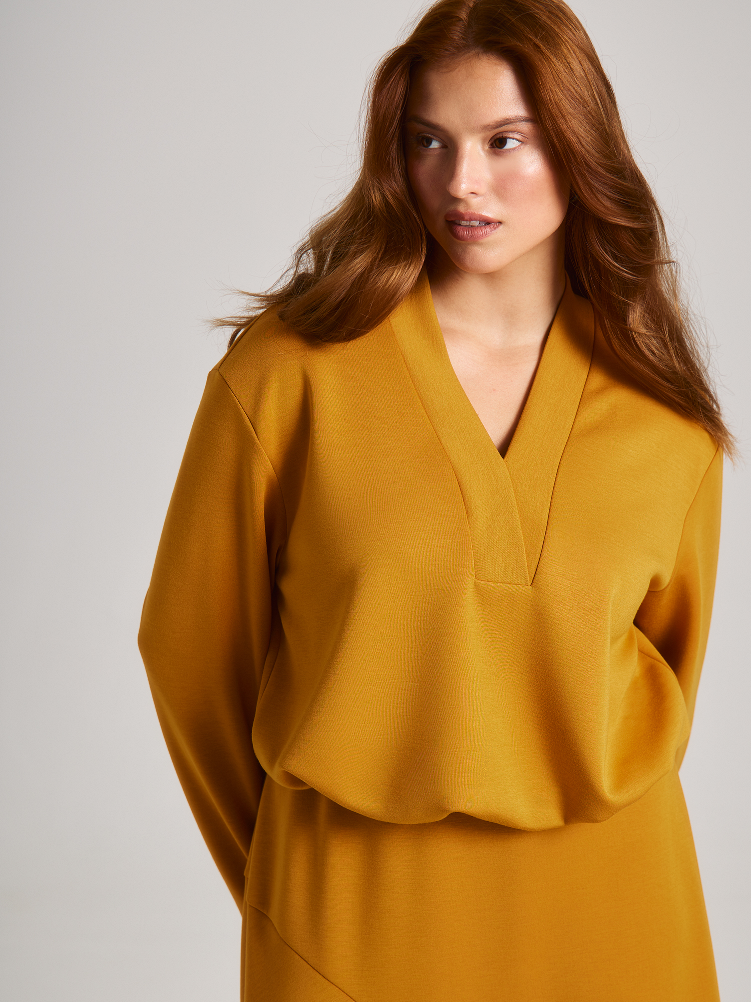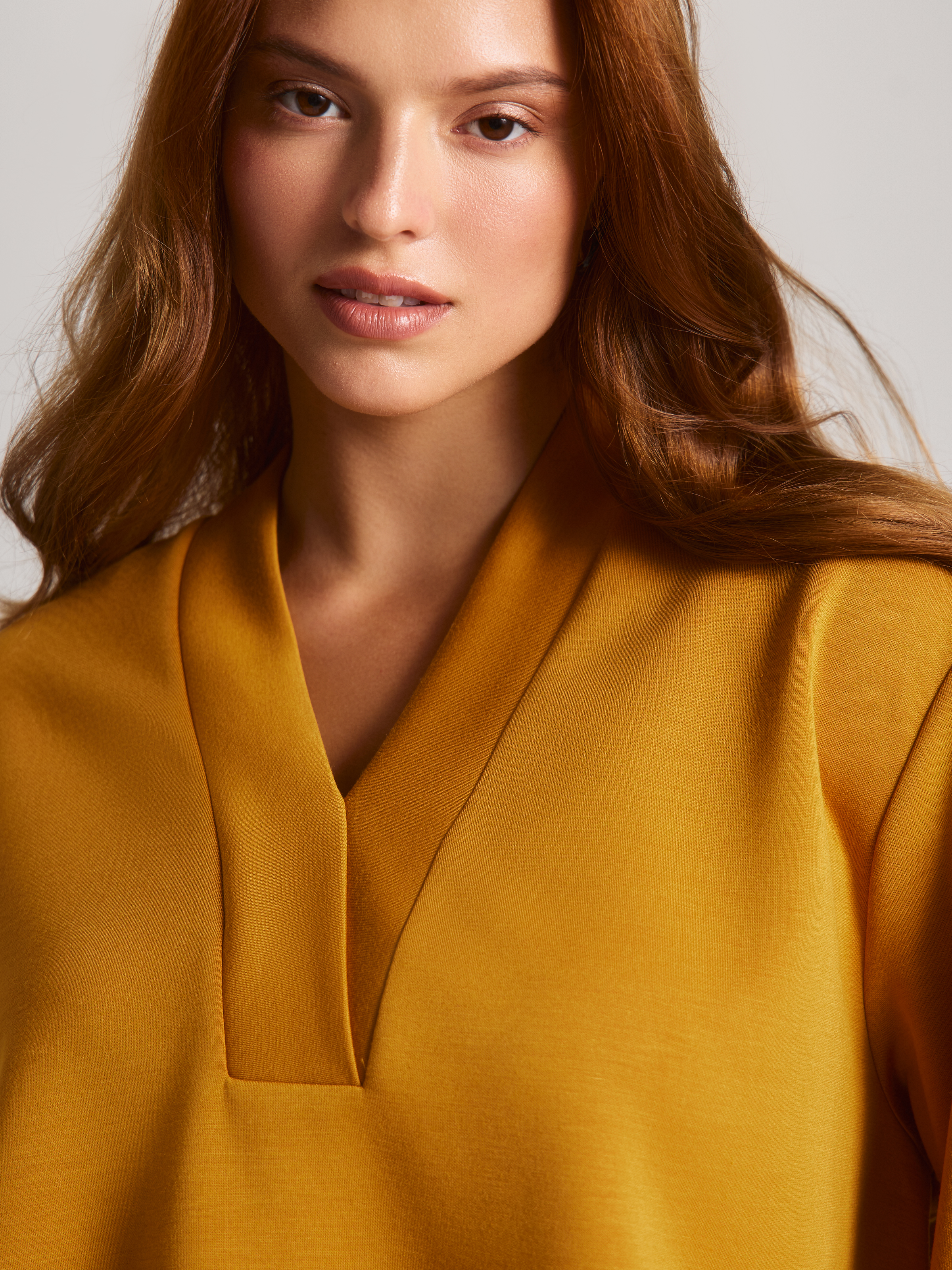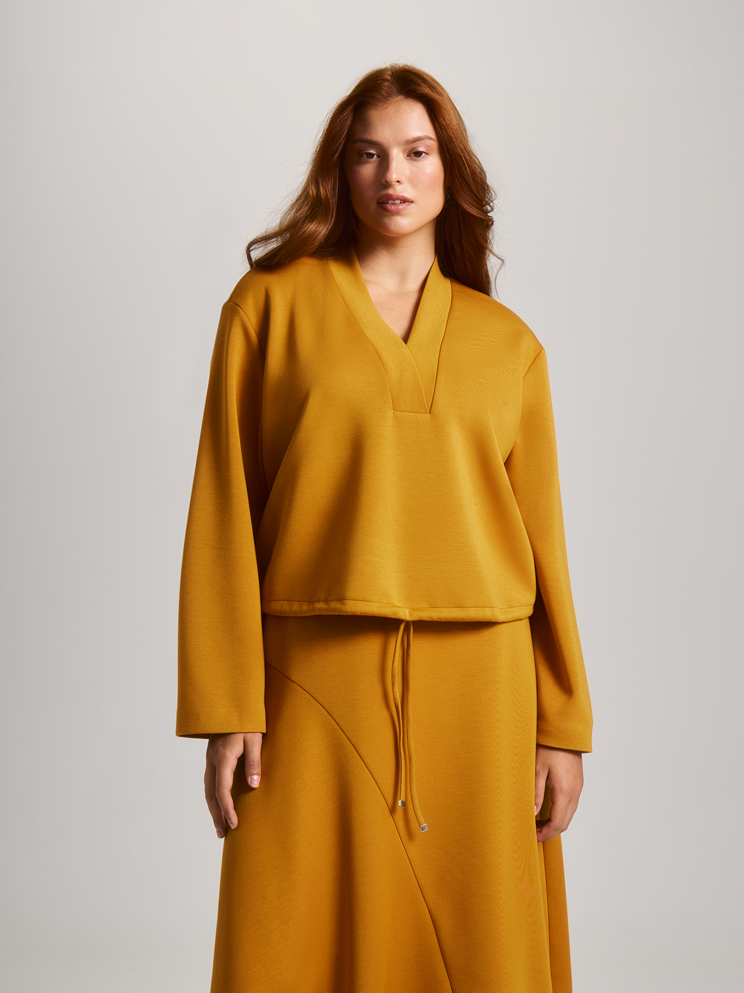Блузка прямого силуэта со спущенным плечом — воплощение современной элегантности, где каждая деталь создана для вашего комфорта и стильного самовыражения. Свободный крой со спущенной линией плеча дарит непревзойденную легкость движений, создавая тот самый эффект непринужденной утонченности, который так ценится в современной моде. V-образный вырез с аккуратной бейкой мягко обрамляет зону декольте, добавляя образу женственности, в то время как кулиса по низу позволяет регулировать степень прилегания, создавая различные стилистические вариации — от свободного силуэта до более собранного варианта. Теплый природный тон оттенка "золото инков" оживляет образ благородными переливами, делая его по-настоящему уникальным. Ткань, состоящая из полиэстера, модала и спандекса, сочетает в себе лучшие качества волокон: прочность и износостойкость полиэстера, мягкость и дышащие свойства модала, а также идеальную эластичность, которую обеспечивает спандекс. Этот состав дарит коже невероятно приятные тактильные ощущения, сохраняя форму и практически не сминаясь. Блуза прекрасно сочетается с юбкой SK0568K, представляя собой готовое стилевое решение, которое дополнит как повседневные, так и более нарядные образы.