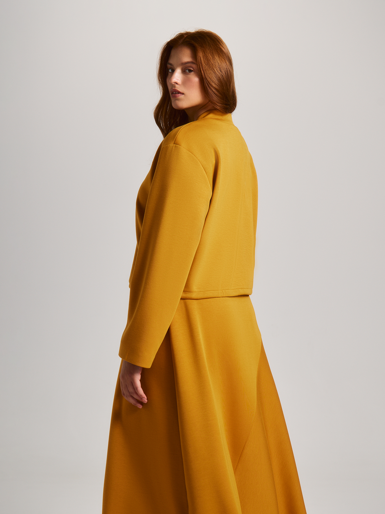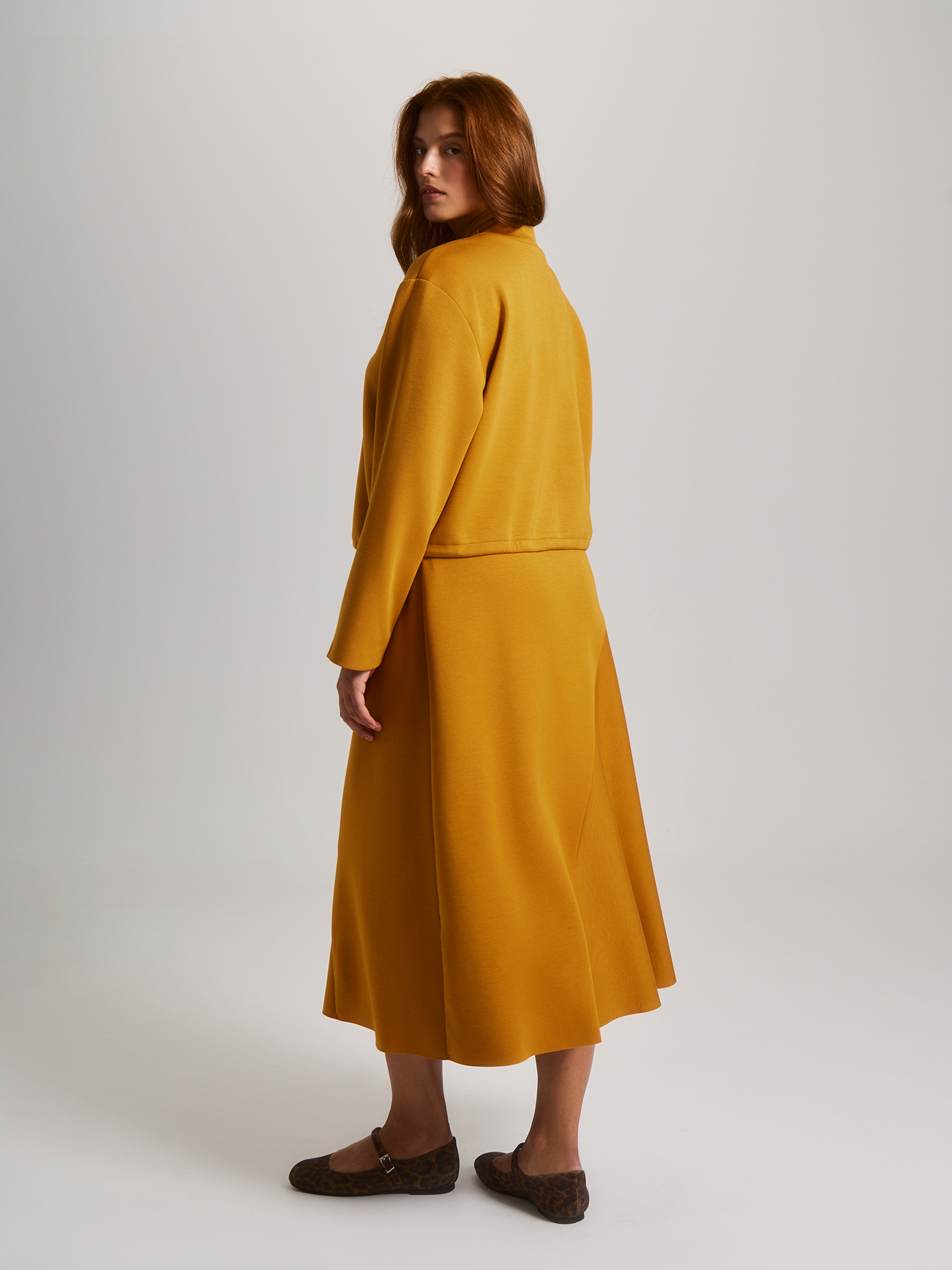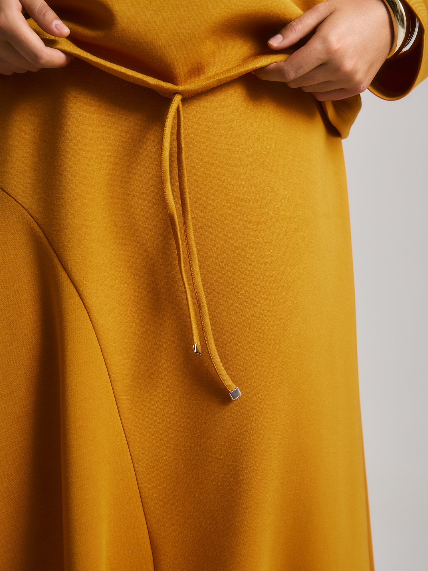 Блузка прямого силуэта со спущенным плечом — воплощение современной элегантности, где каждая деталь создана для вашего комфорта и стильного самовыражения. Свободный крой со спущенной линией плеча дарит непревзойденную легкость движений, создавая тот самый эффект непринужденной утонченности, который так ценится в современной моде. V-образный вырез с аккуратной бейкой мягко обрамляет зону декольте, добавляя образу женственности, в то время как кулиса по низу позволяет регулировать степень прилегания, создавая различные стилистические вариации — от свободного силуэта до более собранного варианта. Теплый природный тон оттенка "золото инков" оживляет образ благородными переливами, делая его по-настоящему уникальным. Ткань, состоящая из полиэстера, модала и спандекса, сочетает в себе лучшие качества волокон: прочность и износостойкость полиэстера, мягкость и дышащие свойства модала, а также идеальную эластичность, которую обеспечивает спандекс. Этот состав дарит коже невероятно приятные тактильные ощущения, сохраняя форму и практически не сминаясь. Блуза прекрасно сочетается с юбкой SK0568K, представляя собой готовое стилевое решение, которое дополнит как повседневные, так и более нарядные образы.