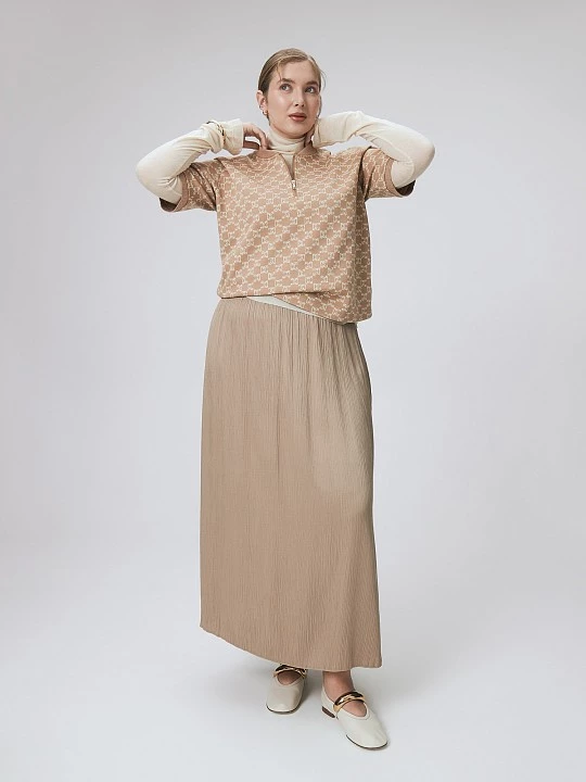 Авторский принт с оригинальными геометрическими формами, разработанный специально для костюма из трикотажного полотна, делает образ по-настоящему эксклюзивным. Создали блузу для костюма недлинной, с втачным коротким рукавом и небольшим вырезом, меняющим форму с помощью молнии. Такой крой привлекает внимание к дизайнерскому принту, делает модель собранной и расширяет ее стилистические особенности. Особые детали блузы - подвязы по горловине и манжетам, выполненные на японской плосковязальной машине Shima Seiki, добавляющие модели индивидуальность и стилистическую направленность спорт шик. Вискозный трикотаж насыщенного песочного оттенка с узором в актуальном молочном хорошо держит форму, долговечен, тактильно приятен и хорошо дышит. Для завершения образа стилисты рекомендуют дополнить блузу юбкой с декоративным запахом из такой же ткани.