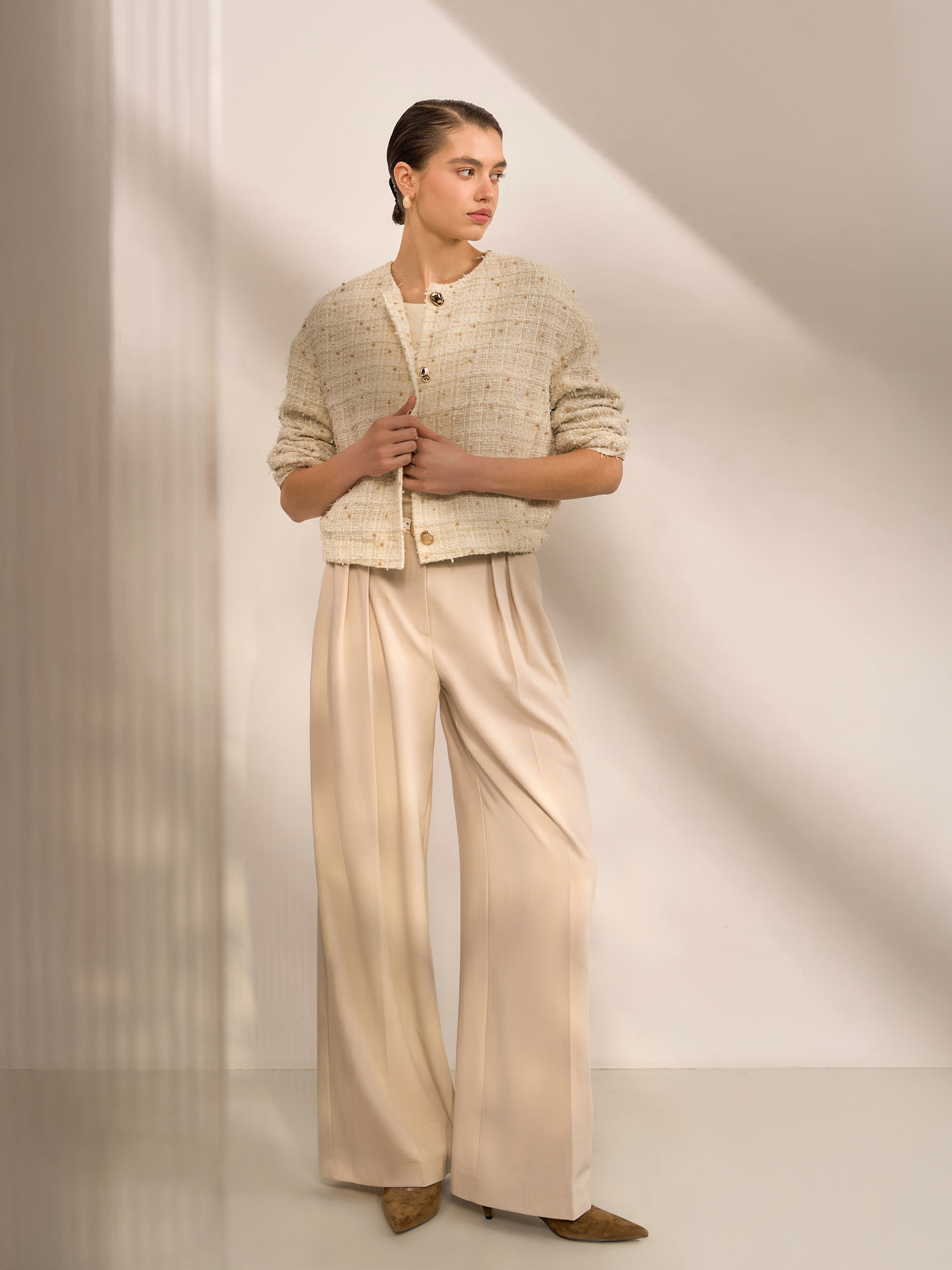 Уникальный бомбер из твида – идеальный вариант для тех, кто ценит стиль и комфорт. Модель с круглым вырезом и благородными гербовыми пуговицами выглядит сдержанно и элегантно.