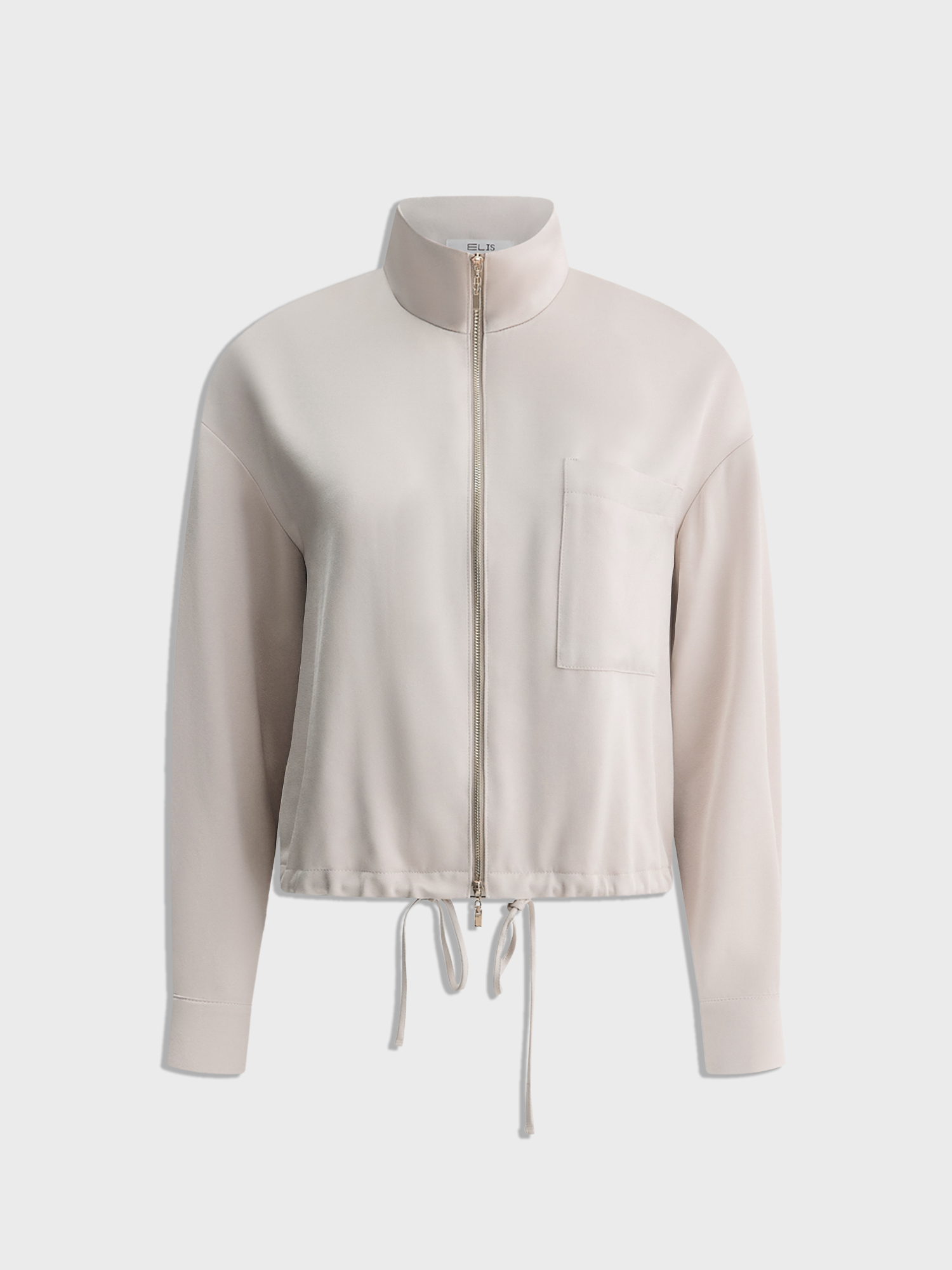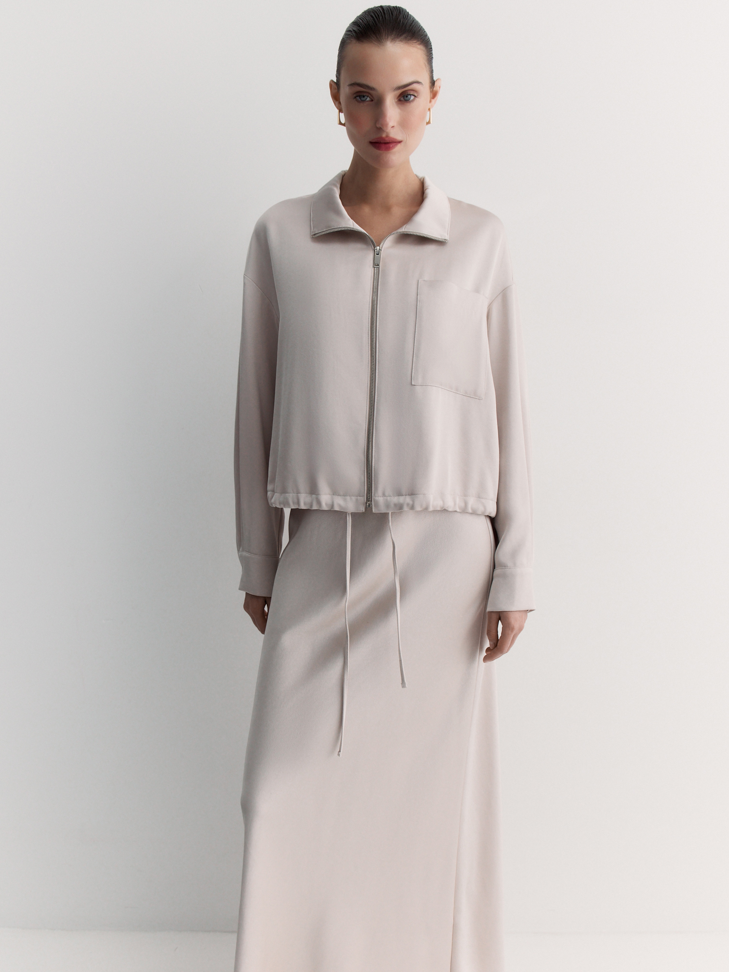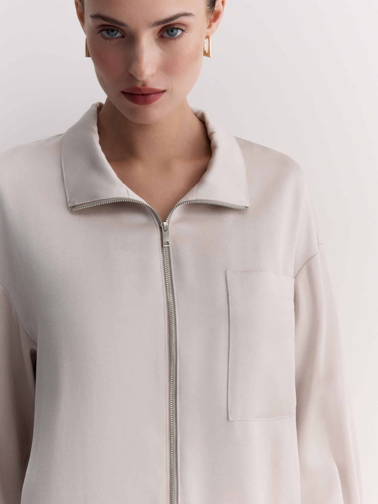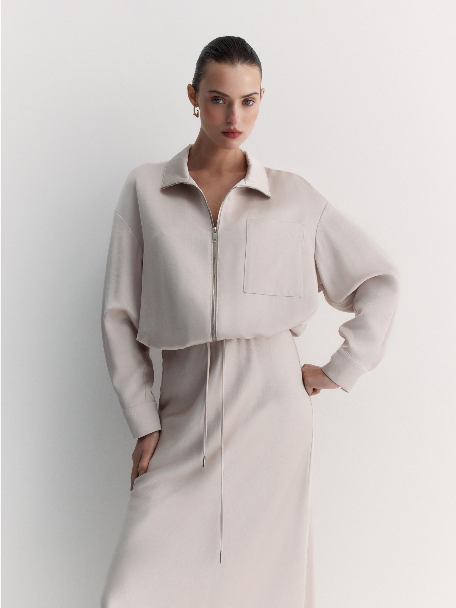 Воротник-стойка и двухзамковая молния обеспечивают удобство, а нагрудный карман добавляет практичности. Длинные рукава со спущенным плечом и манжетами на пуговицах создают расслабленный силуэт. Кулиска со шнуром по низу позволяет регулировать посадку.