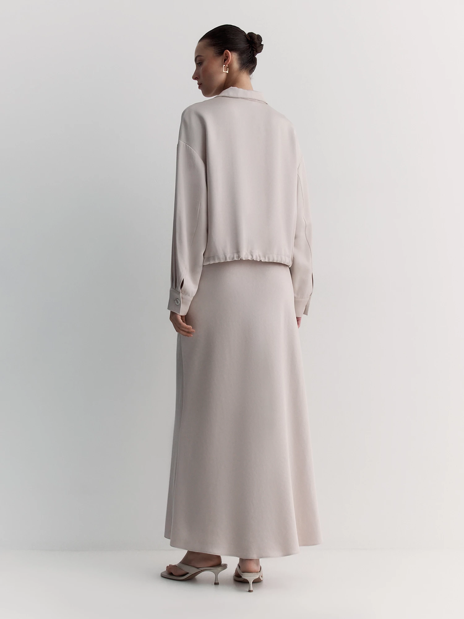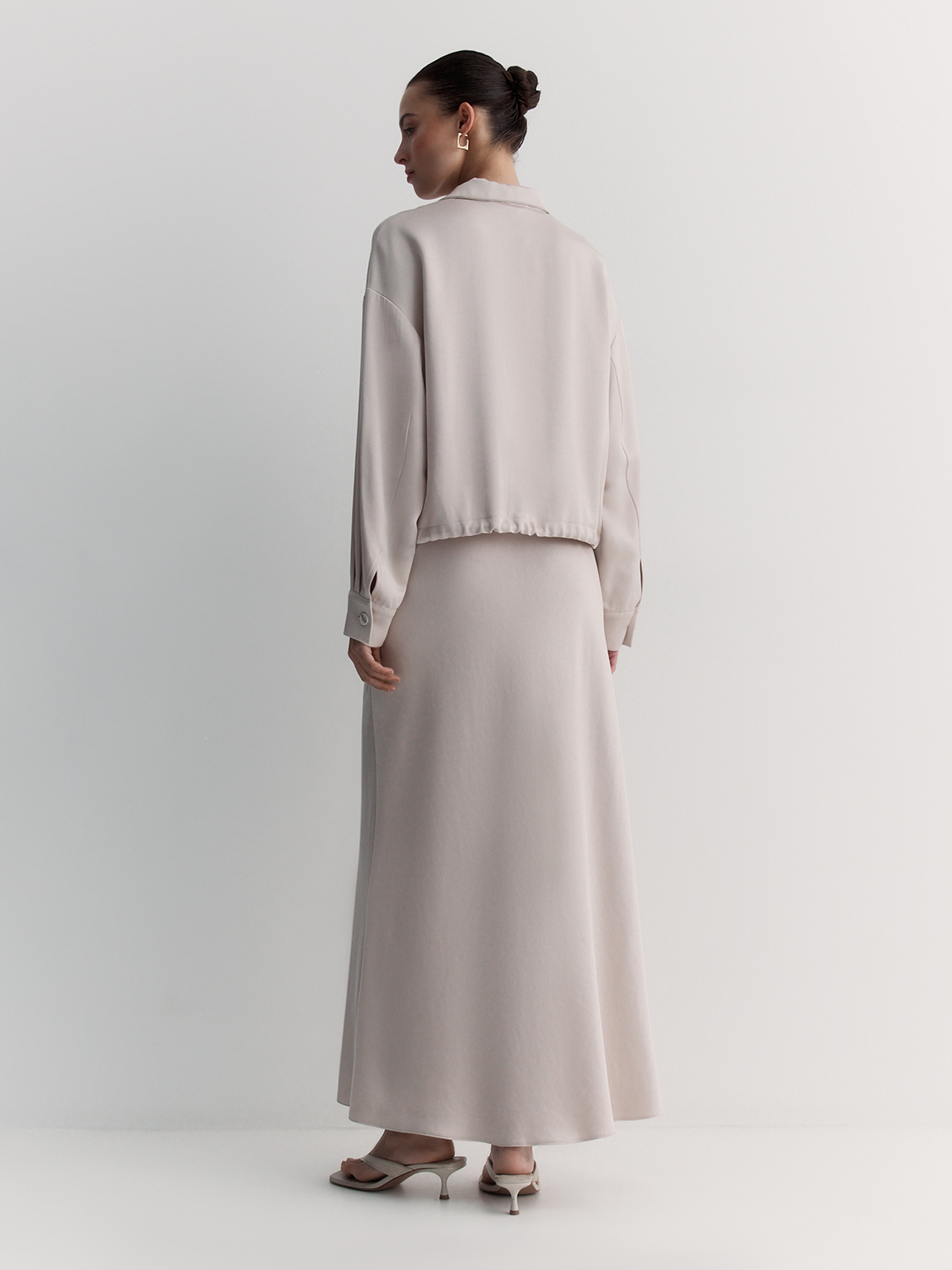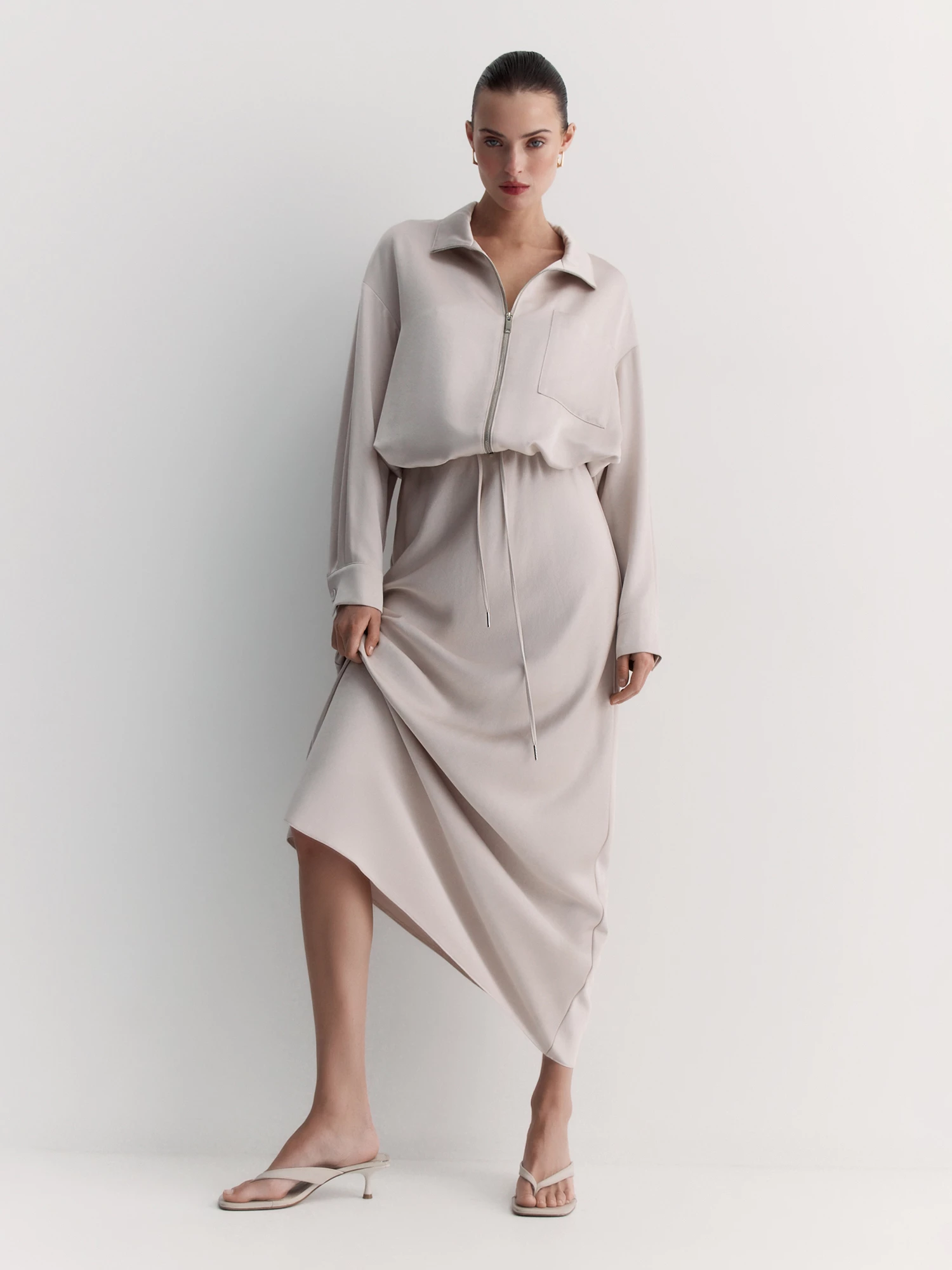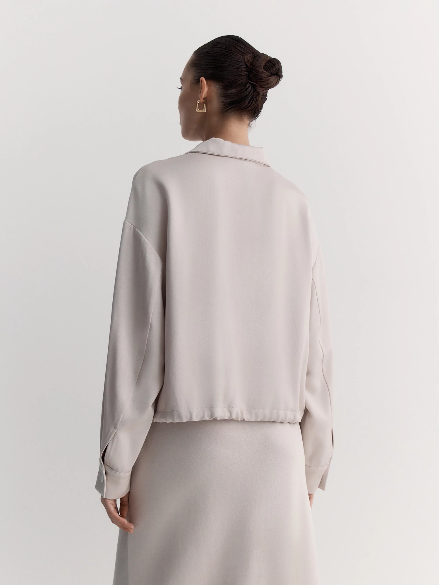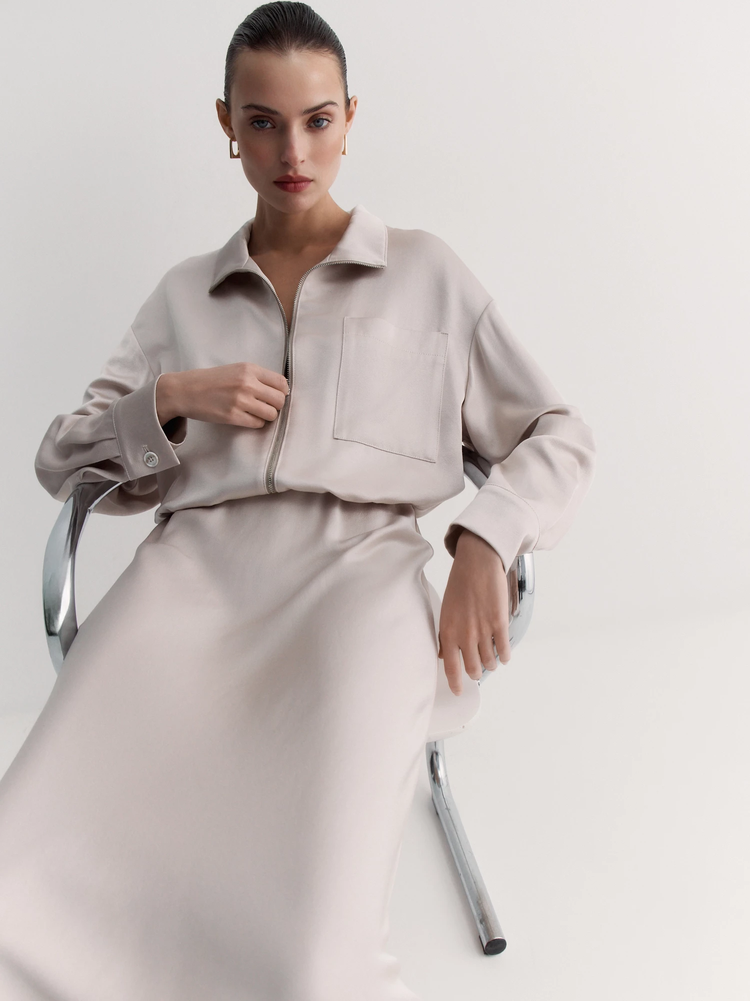 Воротник-стойка и двухзамковая молния обеспечивают удобство, а нагрудный карман добавляет практичности. Длинные рукава со спущенным плечом и манжетами на пуговицах создают расслабленный силуэт. Кулиска со шнуром по низу позволяет регулировать посадку.
