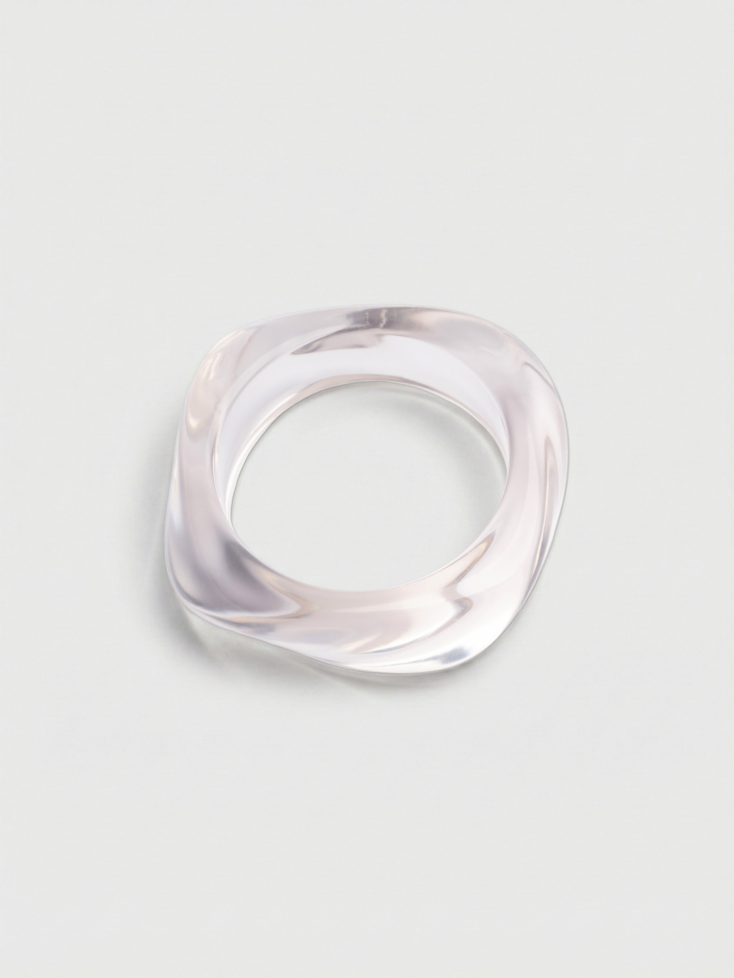 Браслет из прозрачного пластика сохраняет чёткую форму и не деформируется. Украшение подчеркивает хрупкость запястья и добавляет образу структурный акцент.