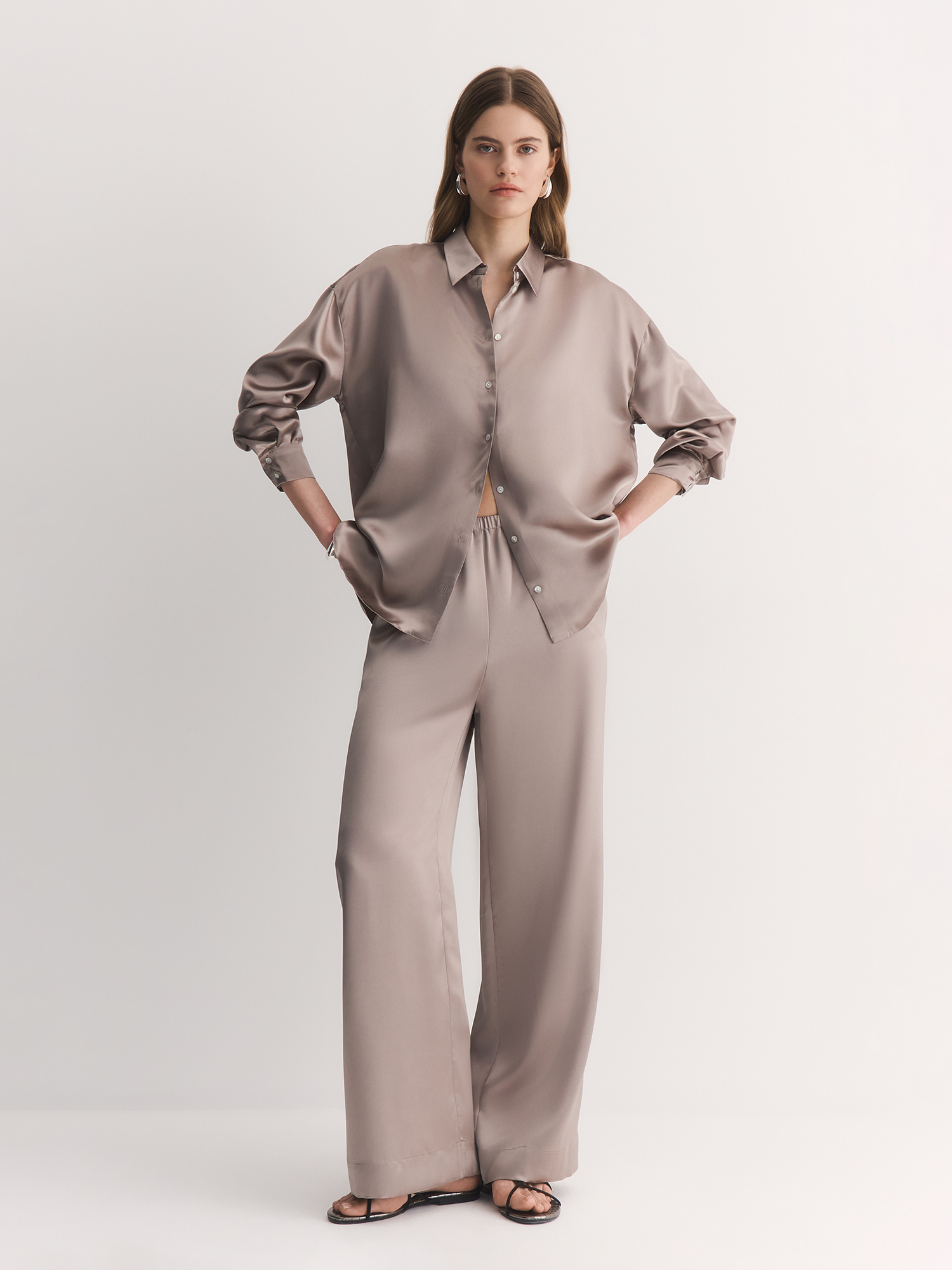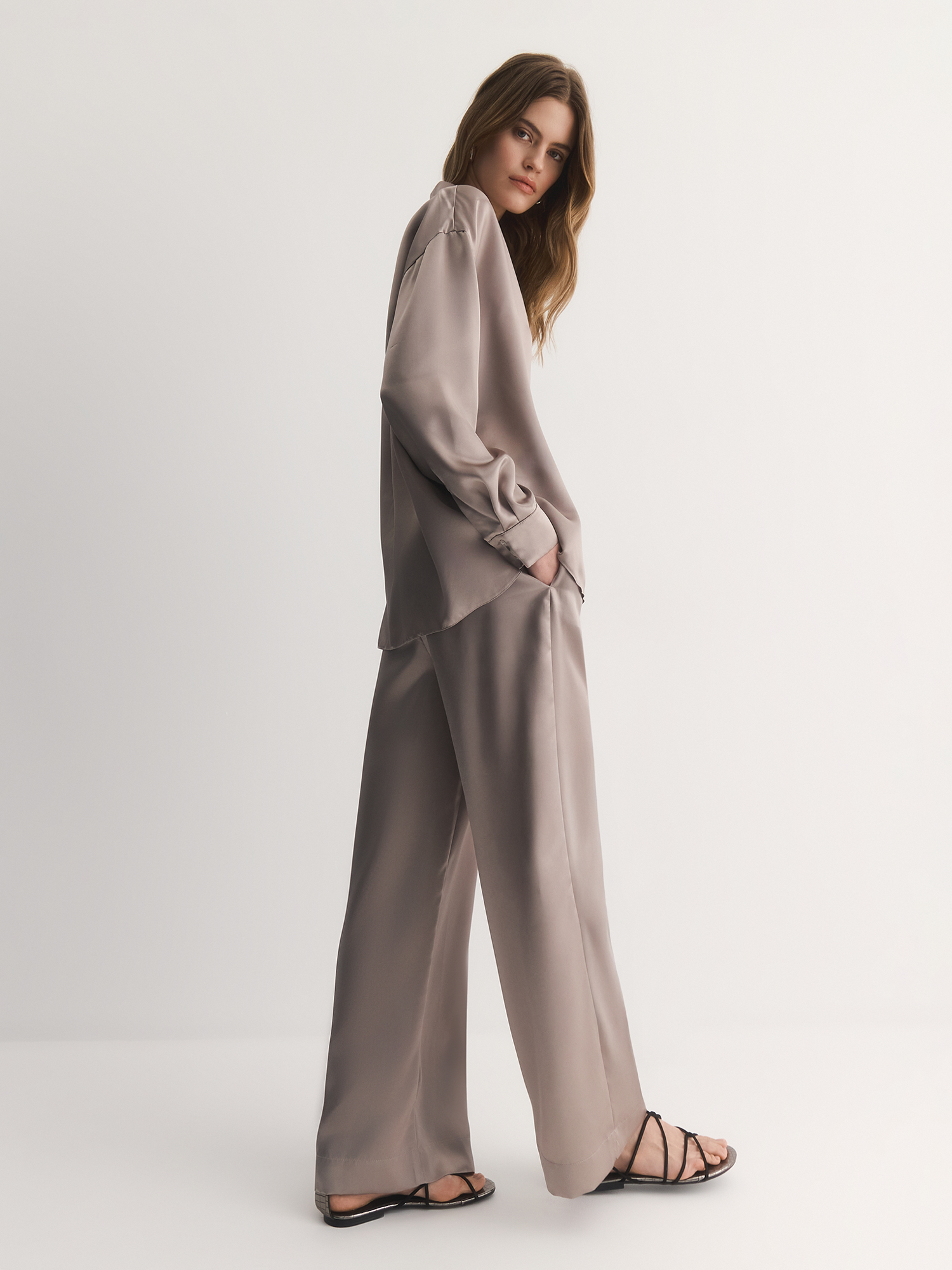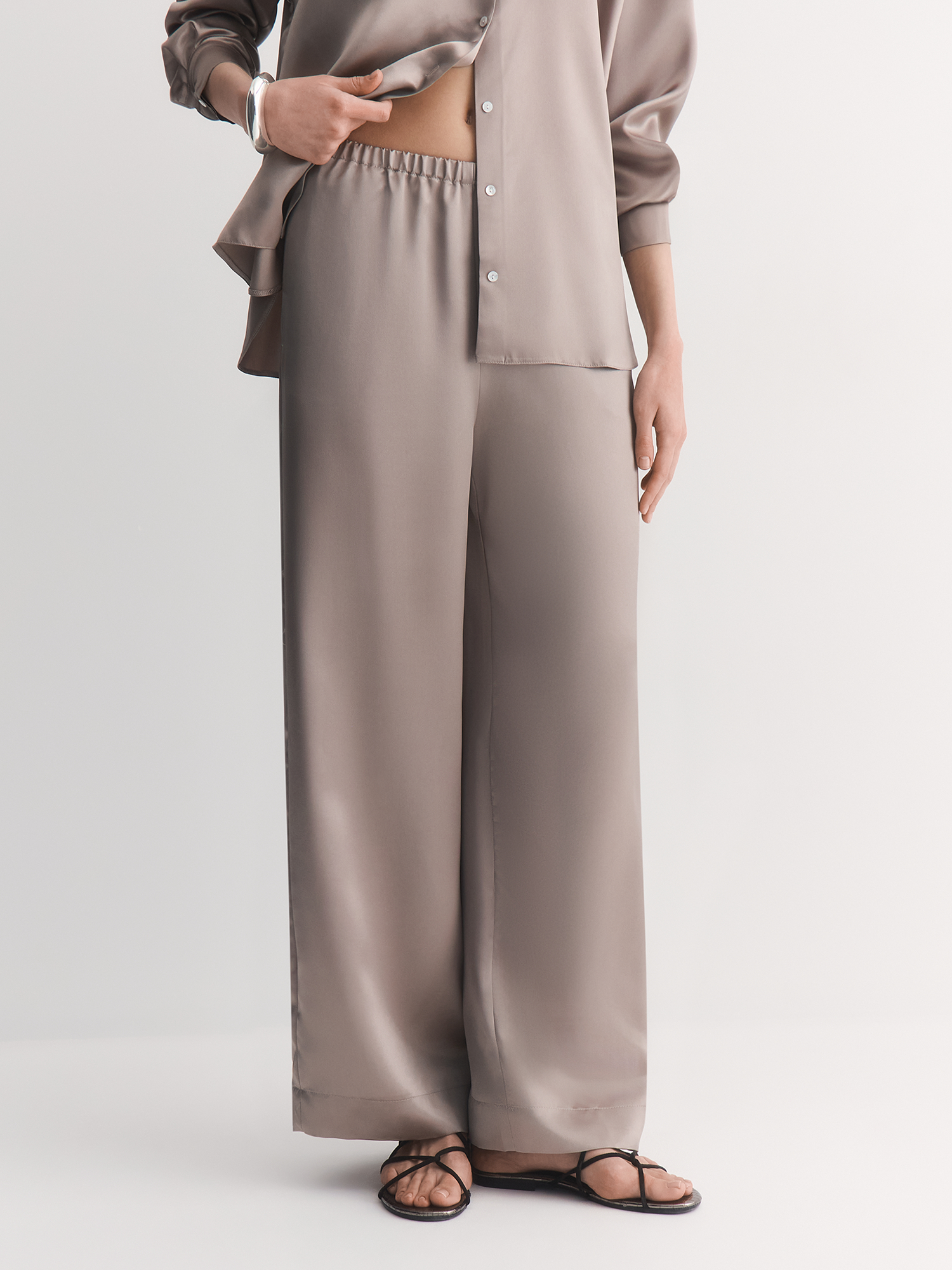 Струящиеся брюки с атласным блеском представляют собой стильный и универсальный элемент гардероба, который можно носить как самостоятельно, так и в сочетании с блузой в пижамном стиле.