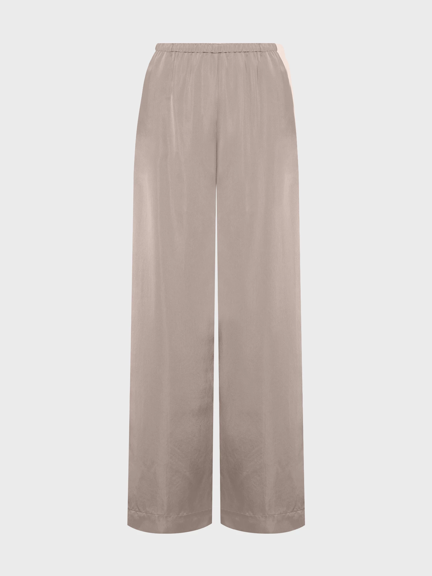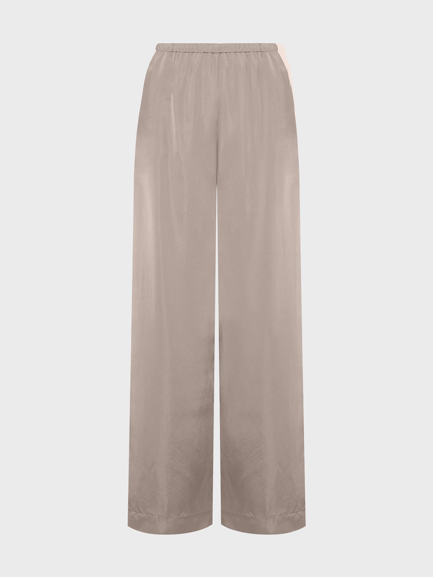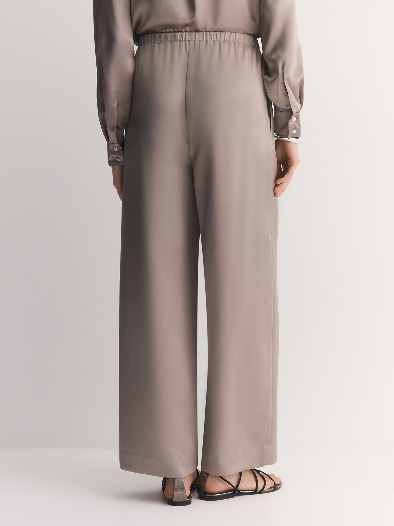 Струящиеся брюки с атласным блеском представляют собой стильный и универсальный элемент гардероба, который можно носить как самостоятельно, так и в сочетании с блузой в пижамном стиле.