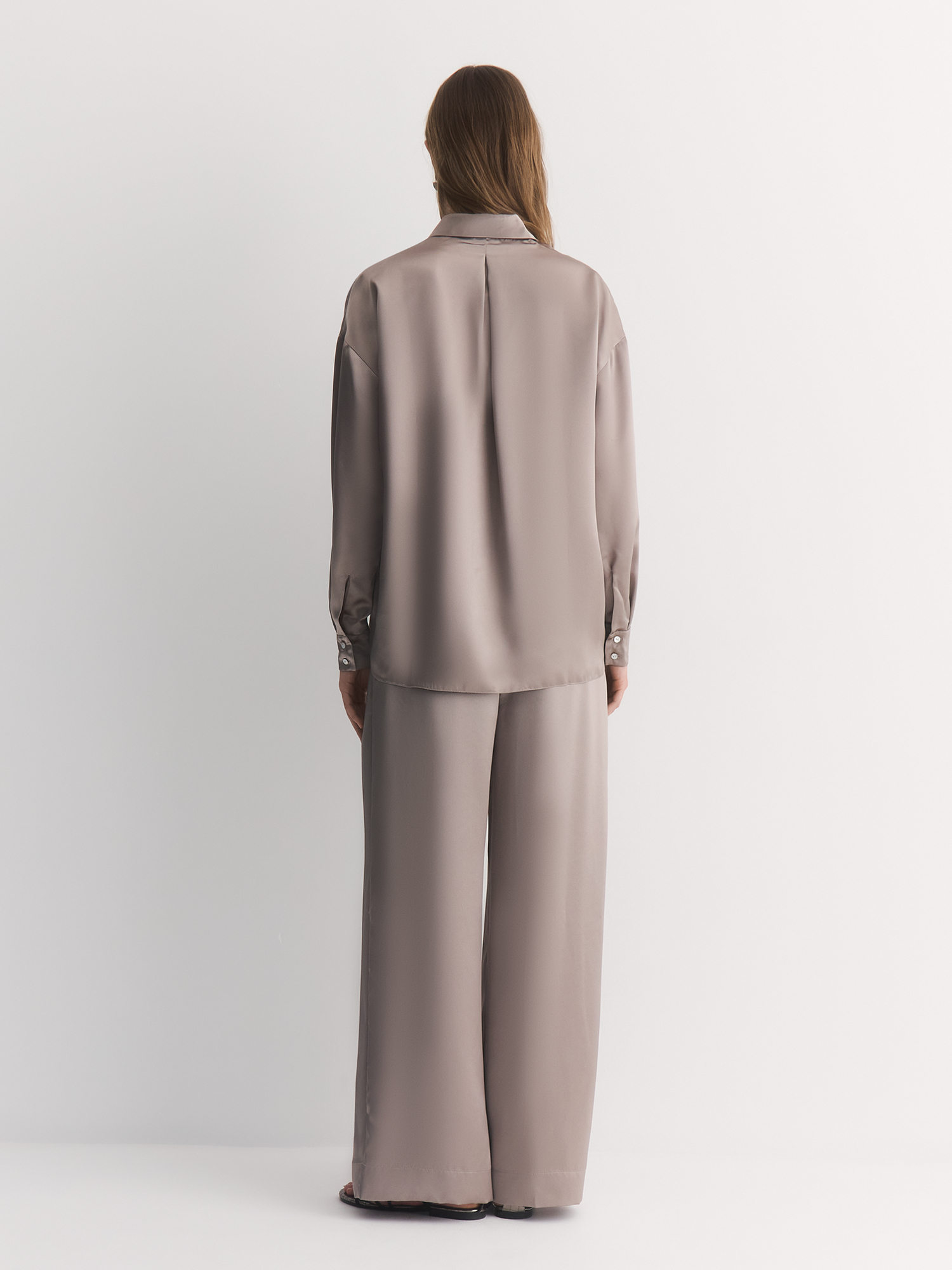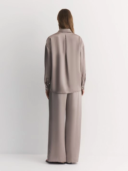 Брюки и блуза в пижамном стиле образуют стильный комплект в атмосферном сером цвете, который позволяет создавать разнообразные образы, подчеркивающие индивидуальность и вкус.