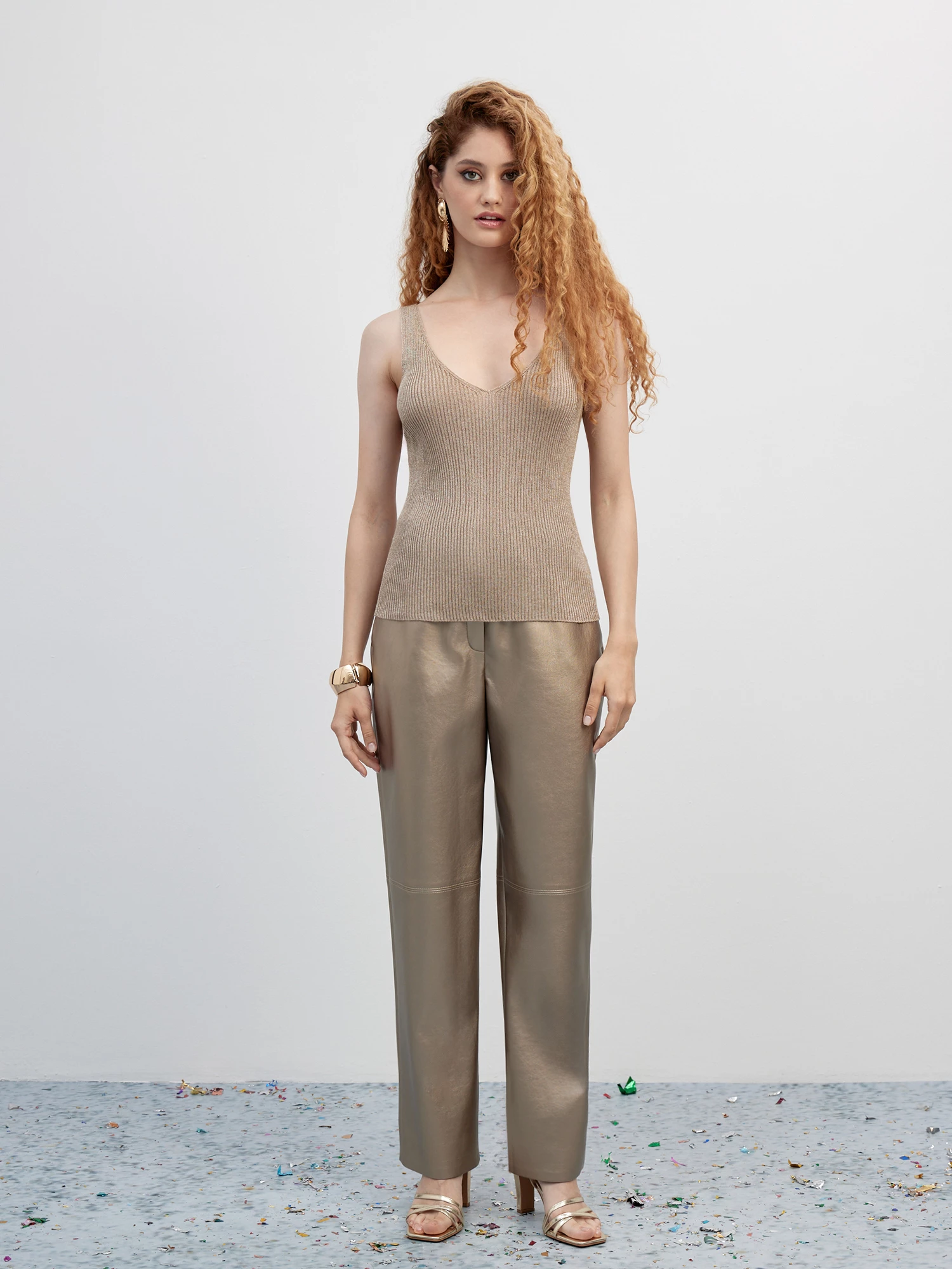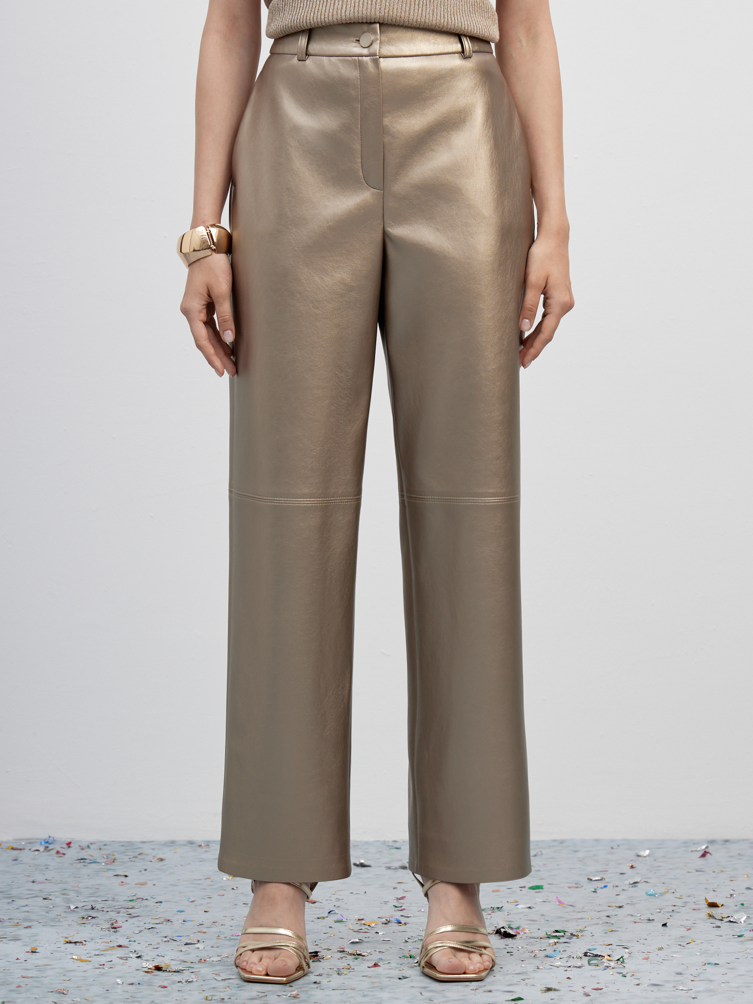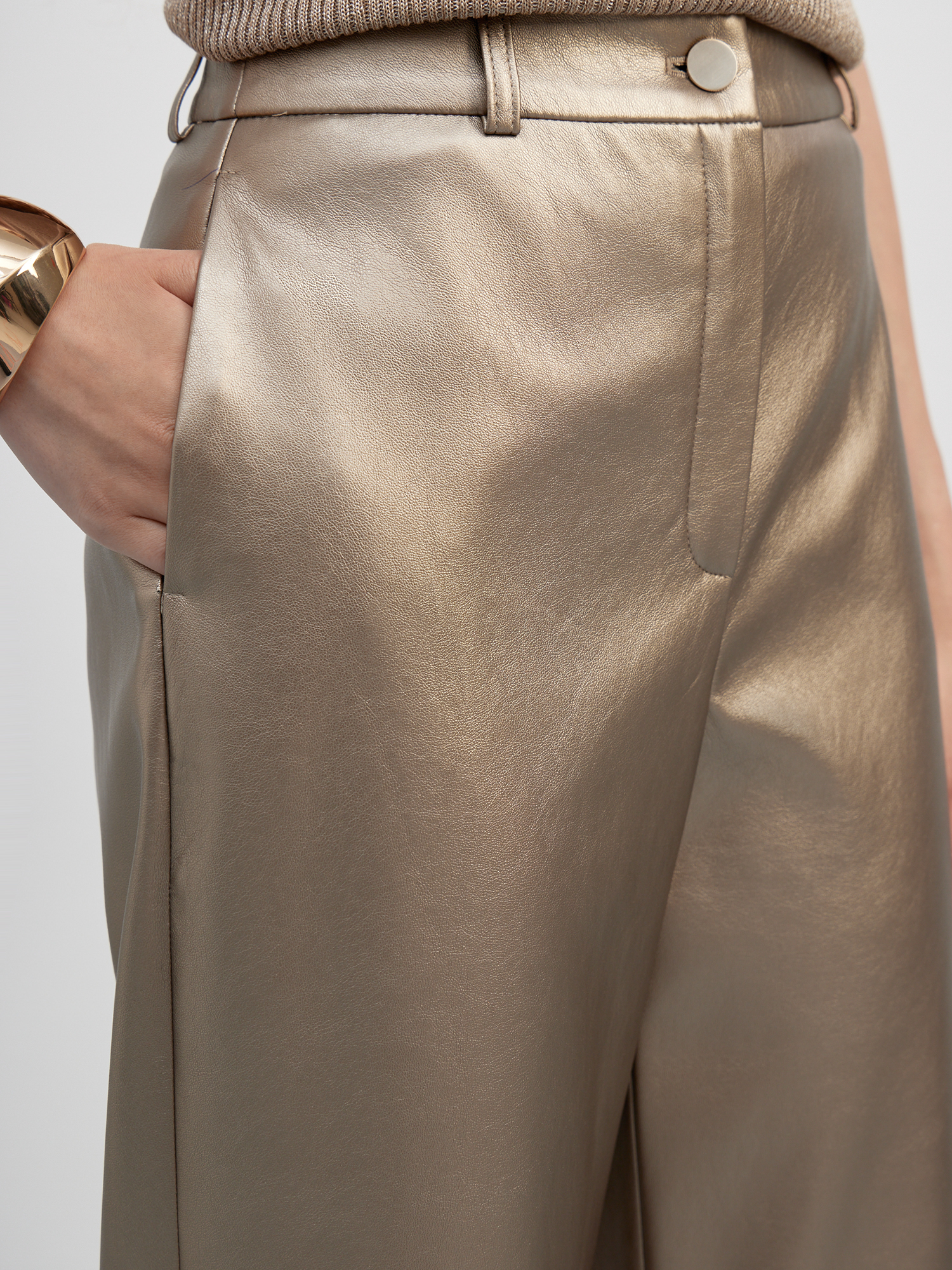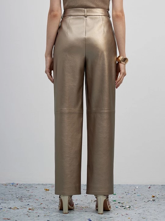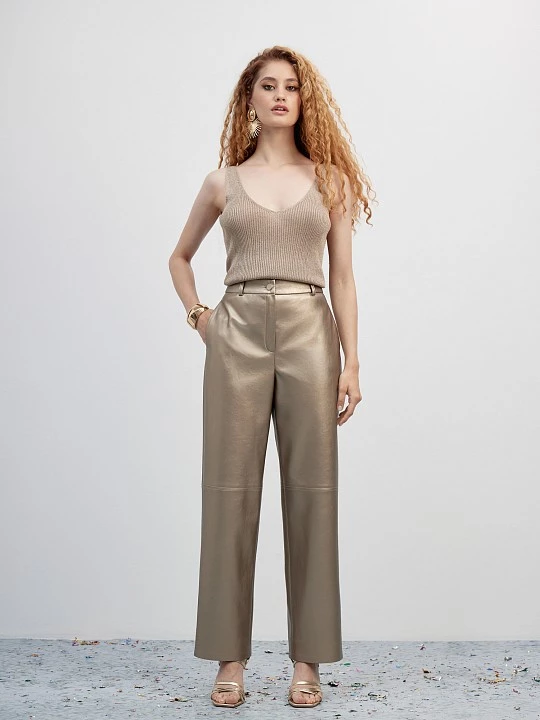Эффектные прямые брюки из экокожи золотистого-бежевого цвета с деликатным матовым блеском. Гладкая поверхность устойчива к образованию трещин и заломов и отлично подходит для холодного времени года. Брюки дополнили поясом со шлевками и вытачками по спинке, обеспечив хорошую посадку на талии и в бедрах, а также боковыми карманами и рельефными строчками по линии колен, делая модель стильной альтернативой джинсам для яркого образа.