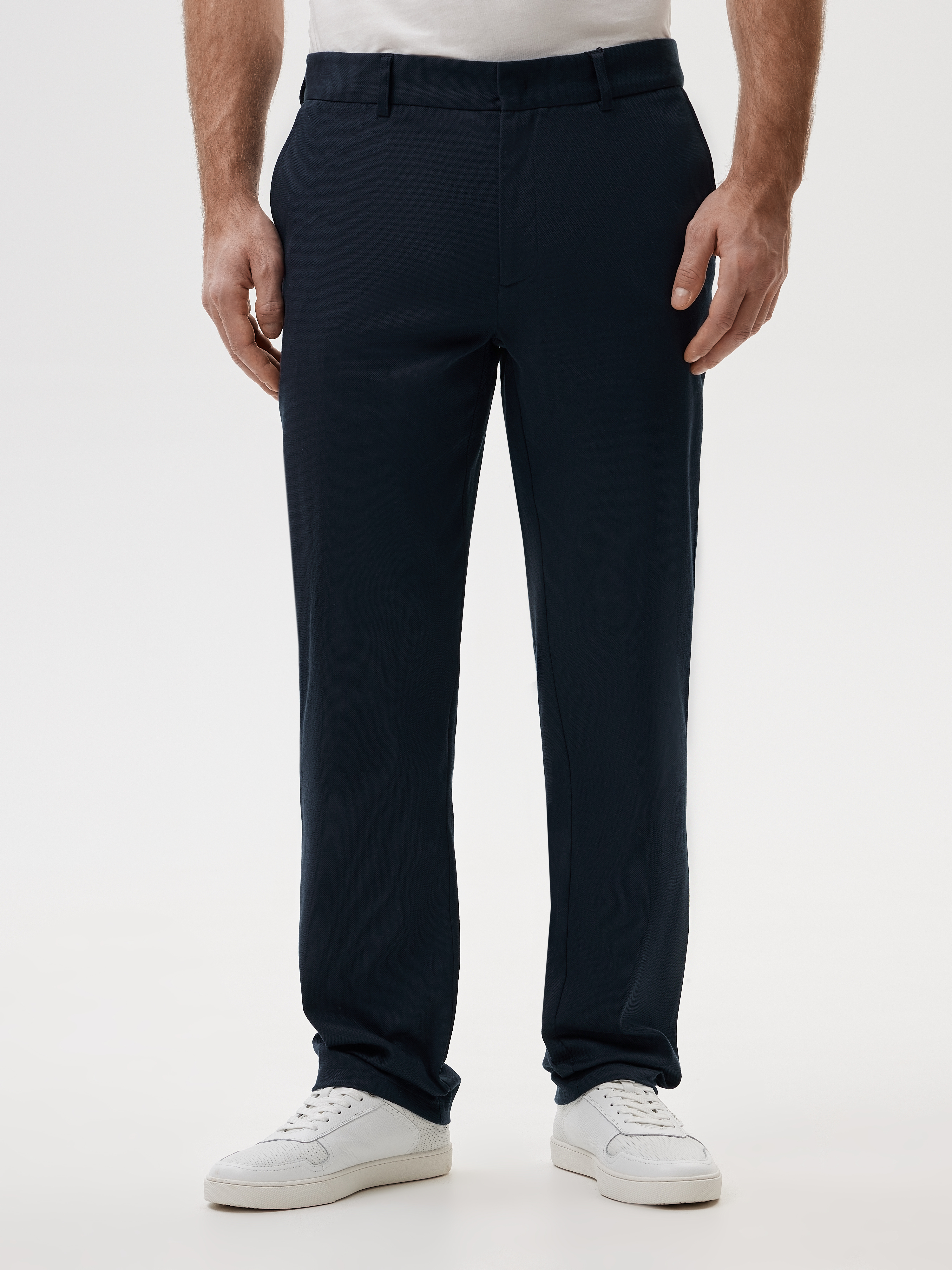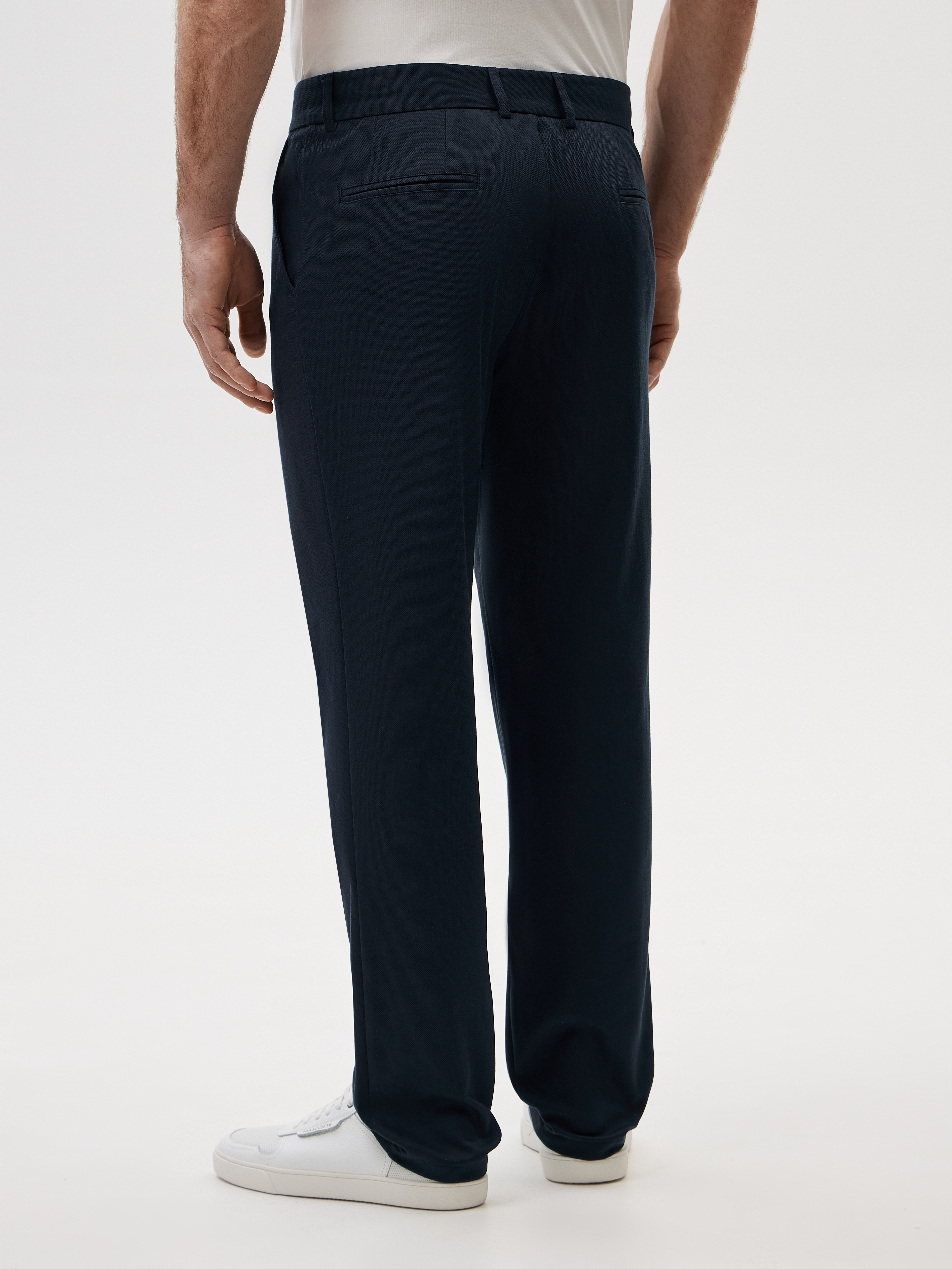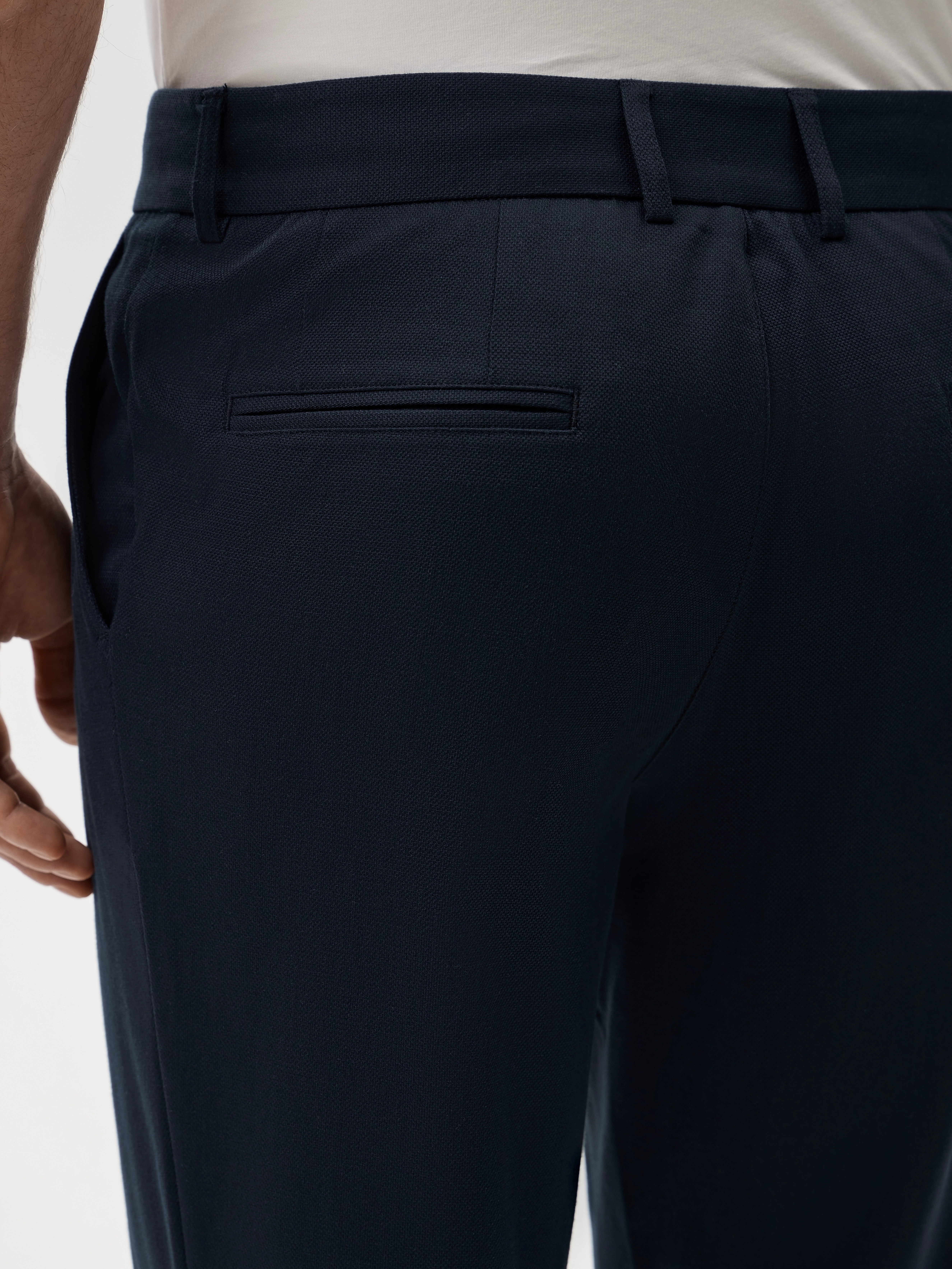 Комфортные брюки классического темно-синего оттенка. Выполнены из приятного фактурного материала на основе органического хлопка, а эластичные волокна в составе ткани обеспечивают идеальную посадку на любую фигуру. Модель полуприлегающего силуэта, с притачным поясом со шлёвками под ремень и прорезными боковыми карманами. С брюками можно создать интересные образы в стиле smart casual, сочетая их с базовыми футболками или джемперами.