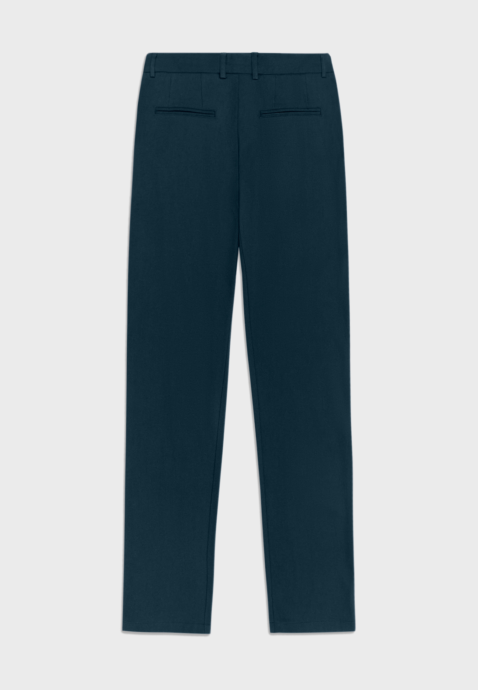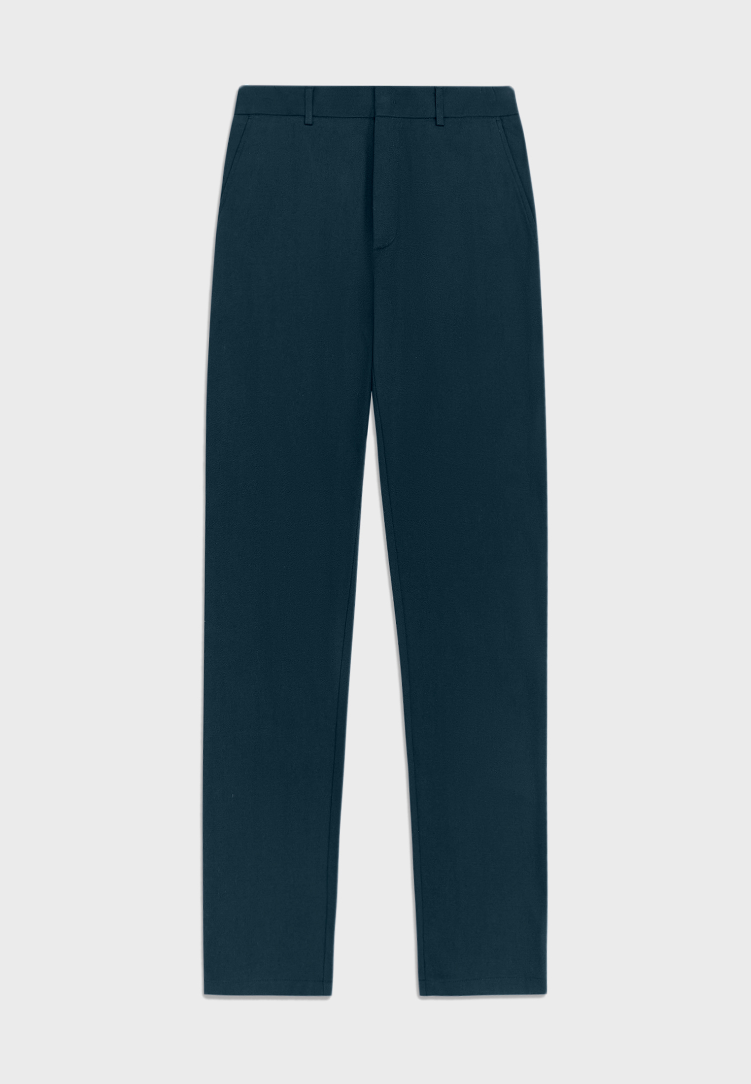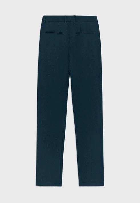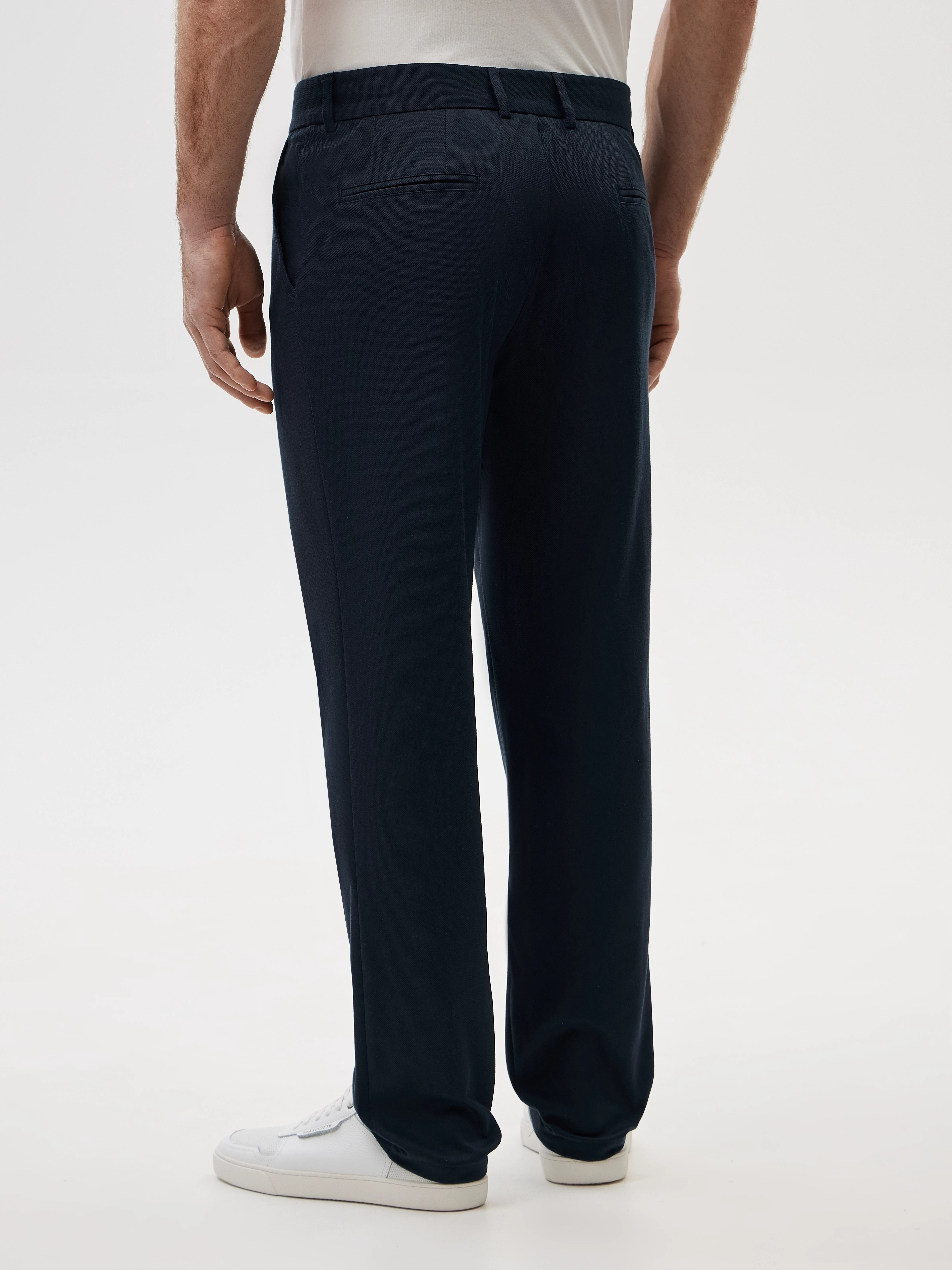 Комфортные брюки классического темно-синего оттенка. Выполнены из приятного фактурного материала на основе органического хлопка, а эластичные волокна в составе ткани обеспечивают идеальную посадку на любую фигуру. Модель полуприлегающего силуэта, с притачным поясом со шлёвками под ремень и прорезными боковыми карманами. С брюками можно создать интересные образы в стиле smart casual, сочетая их с базовыми футболками или джемперами.