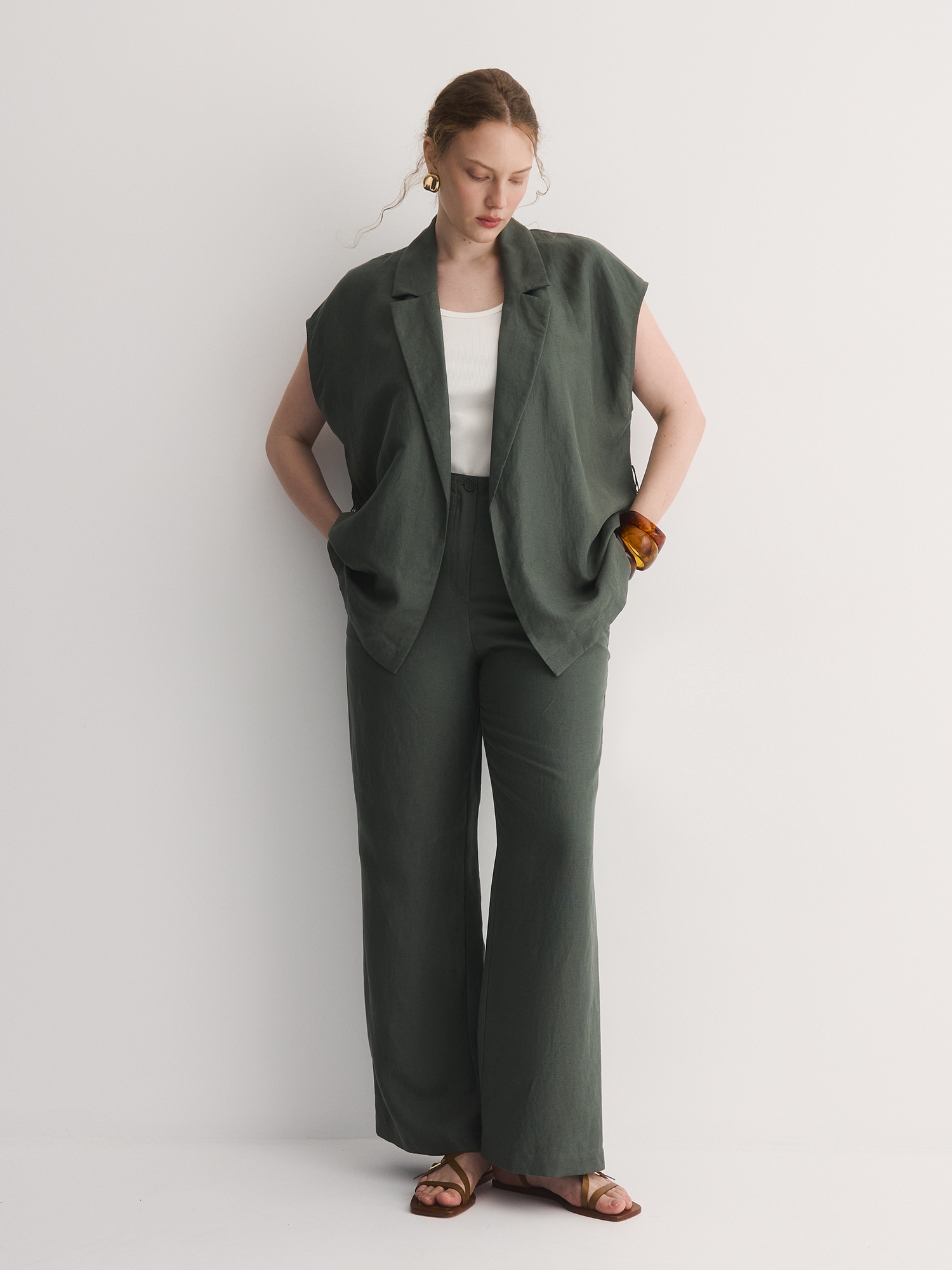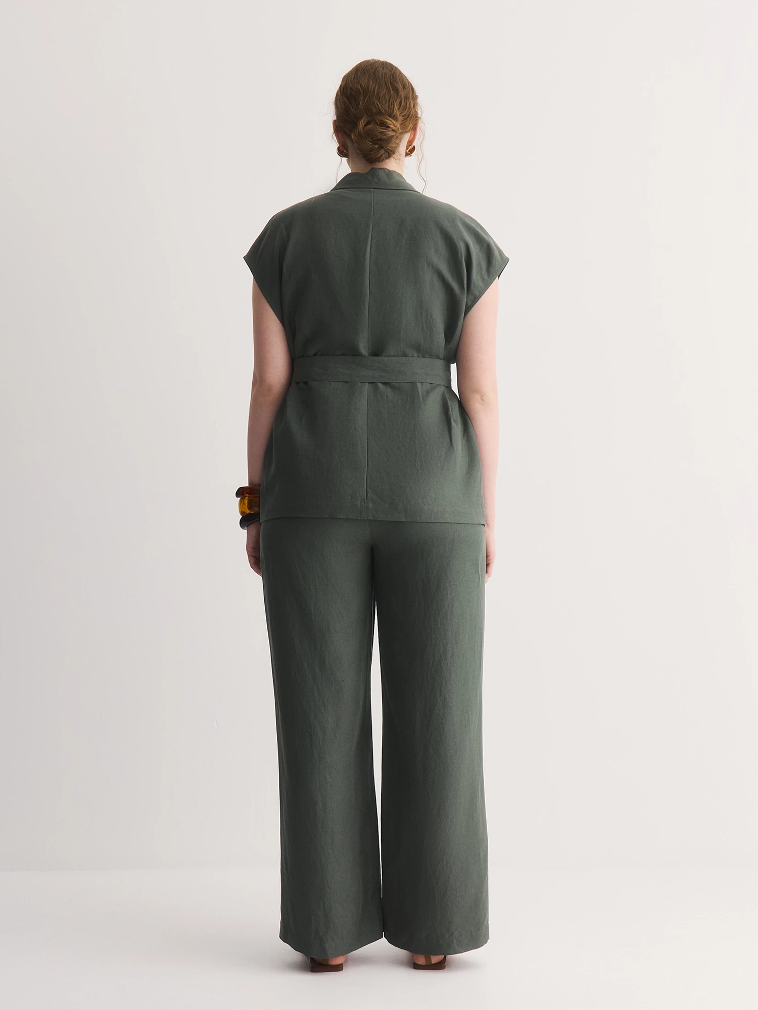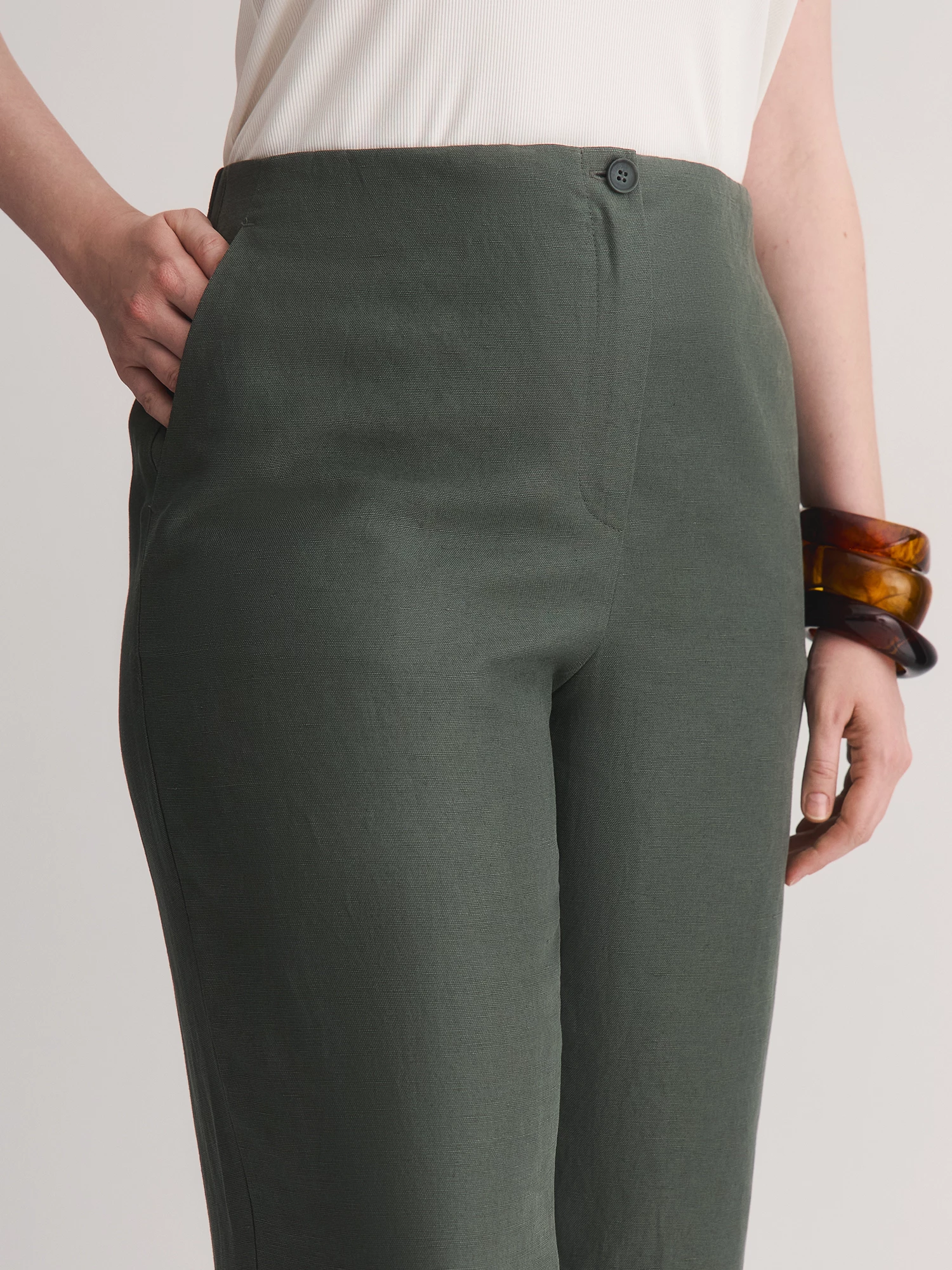 Прямые свободные брюки – идеальный баланс комфорта и стиля. Сшитые из смеси льна и лиоцелла, они мягкие, дышащие и приятные к телу, поддерживают комфортную температуру.