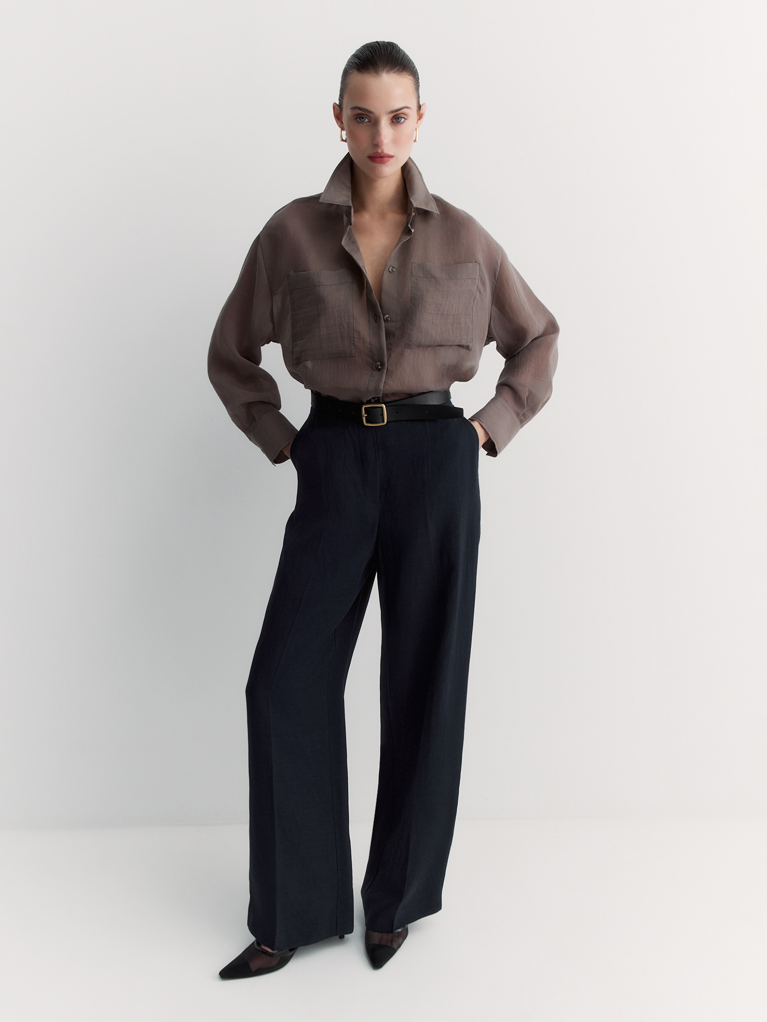 Модель с притачным поясом без шлёвок создаёт лаконичный и аккуратный силуэт. Декоративный гульфик и незаметные боковые карманы добавляют брюкам стильные детали, а боковая застёжка на потайную молнию обеспечивает удобство. Отсутствие стрелок делает образ более современным.
