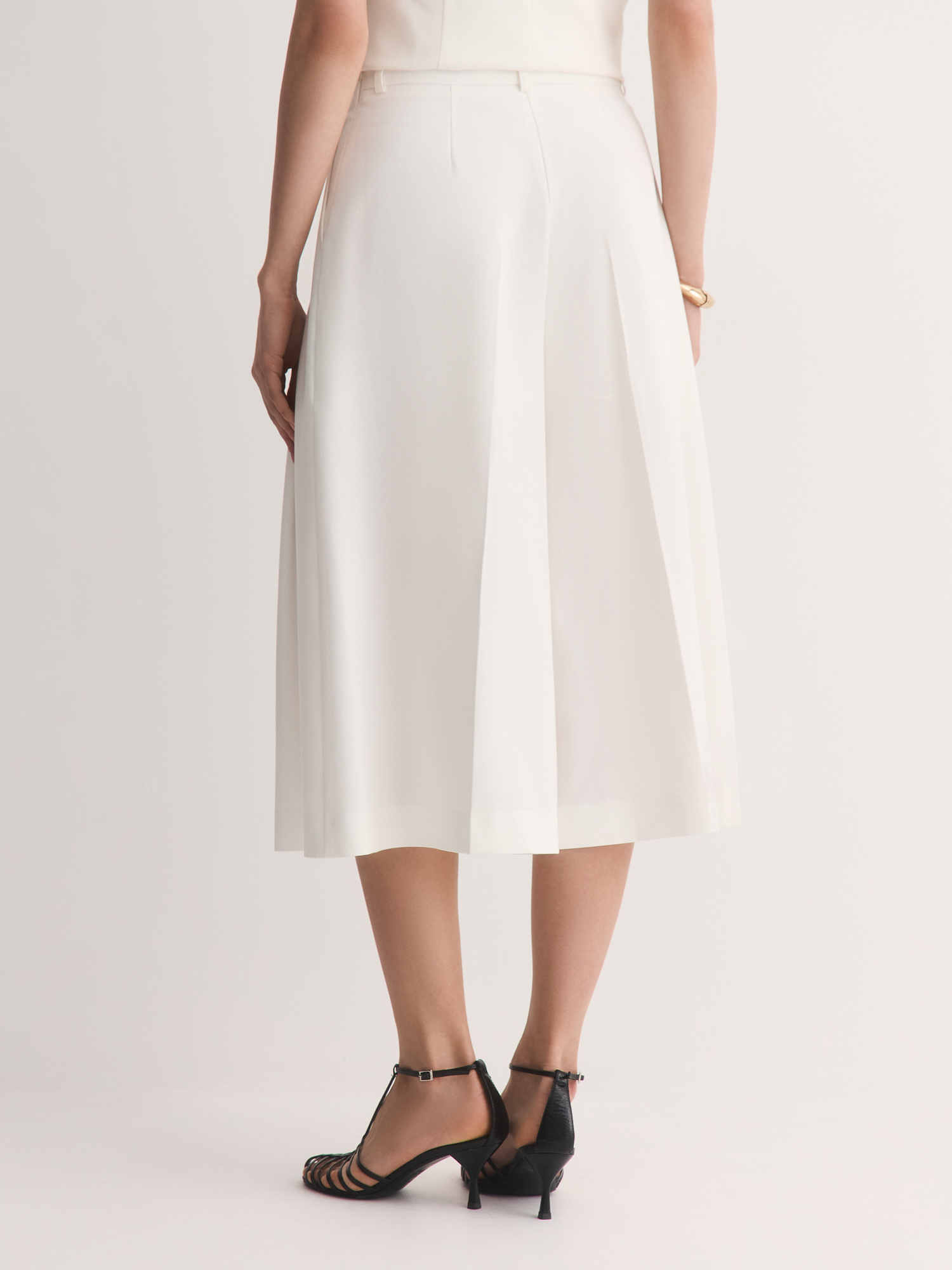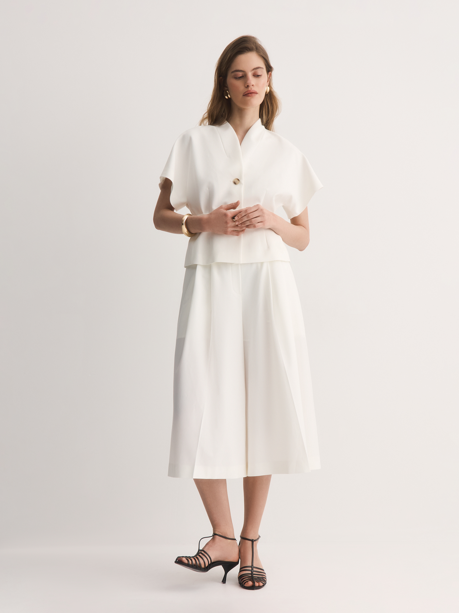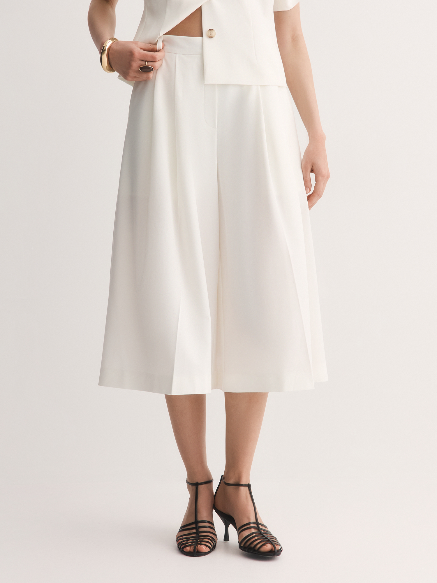 Белые кюлоты с аккуратными складками – свежий взгляд на классический силуэт. Сшитые из костюмной смесовой ткани с шелковистым лиоцеллом, они приятны к телу, хорошо дышат и сохраняют форму весь день.