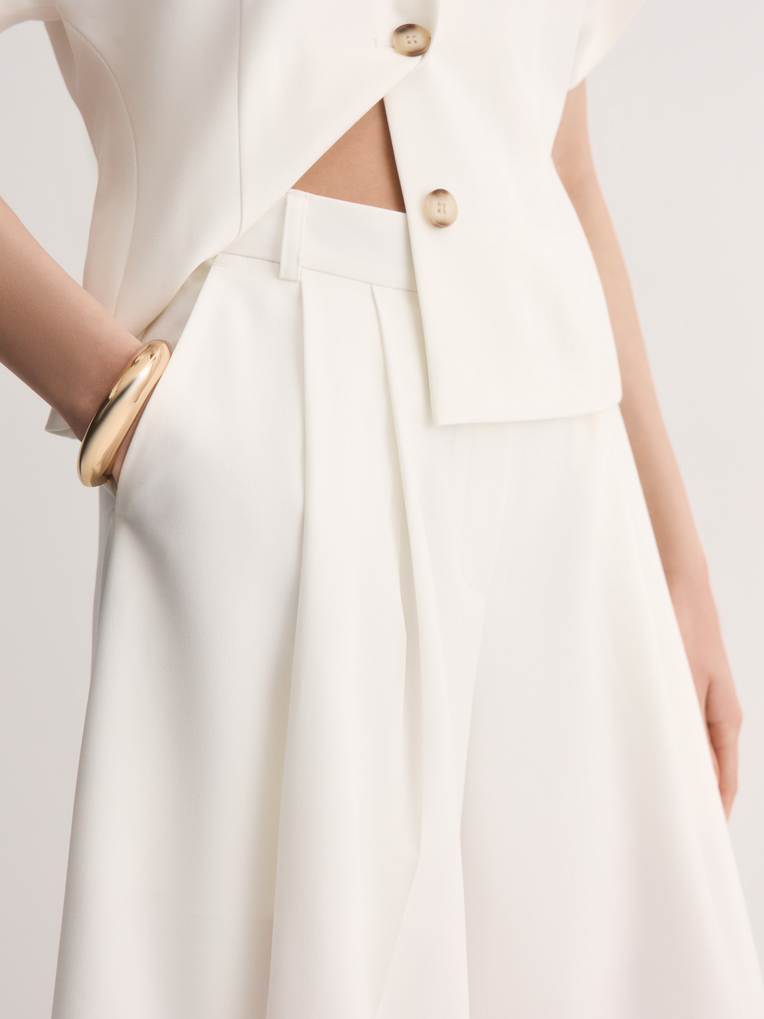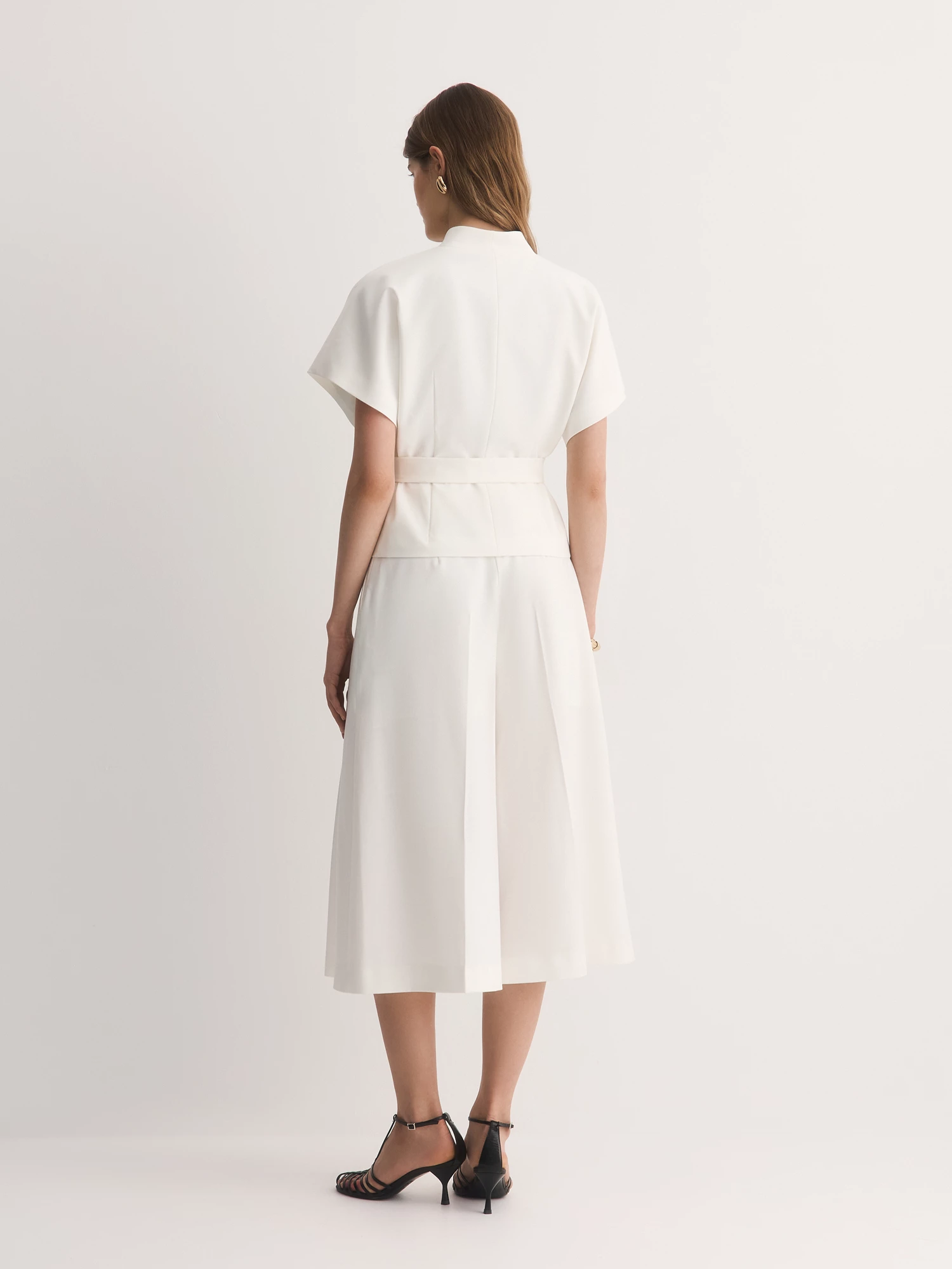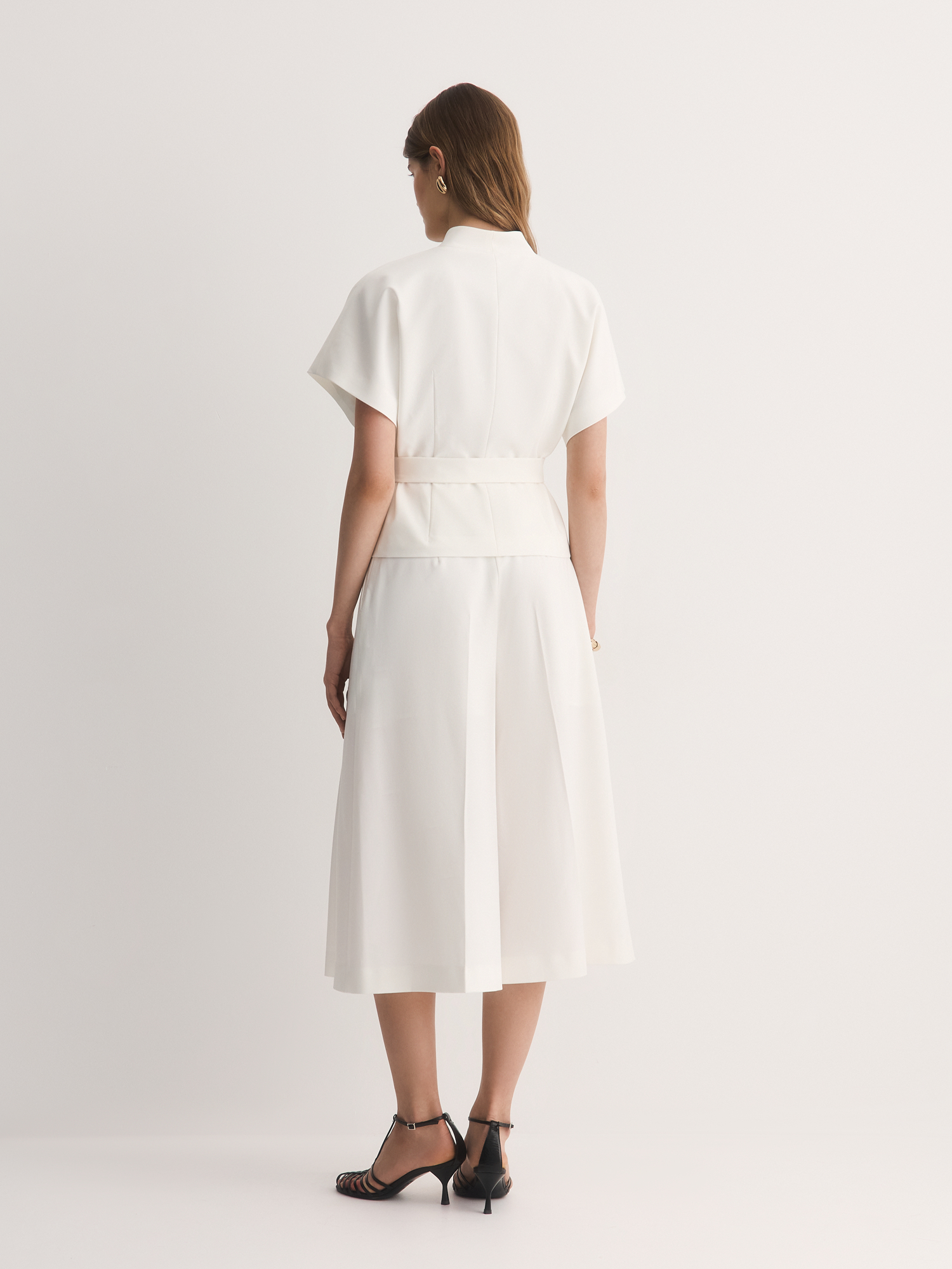 Белые кюлоты с аккуратными складками – свежий взгляд на классический силуэт. Сшитые из костюмной смесовой ткани с шелковистым лиоцеллом, они приятны к телу, хорошо дышат и сохраняют форму весь день.