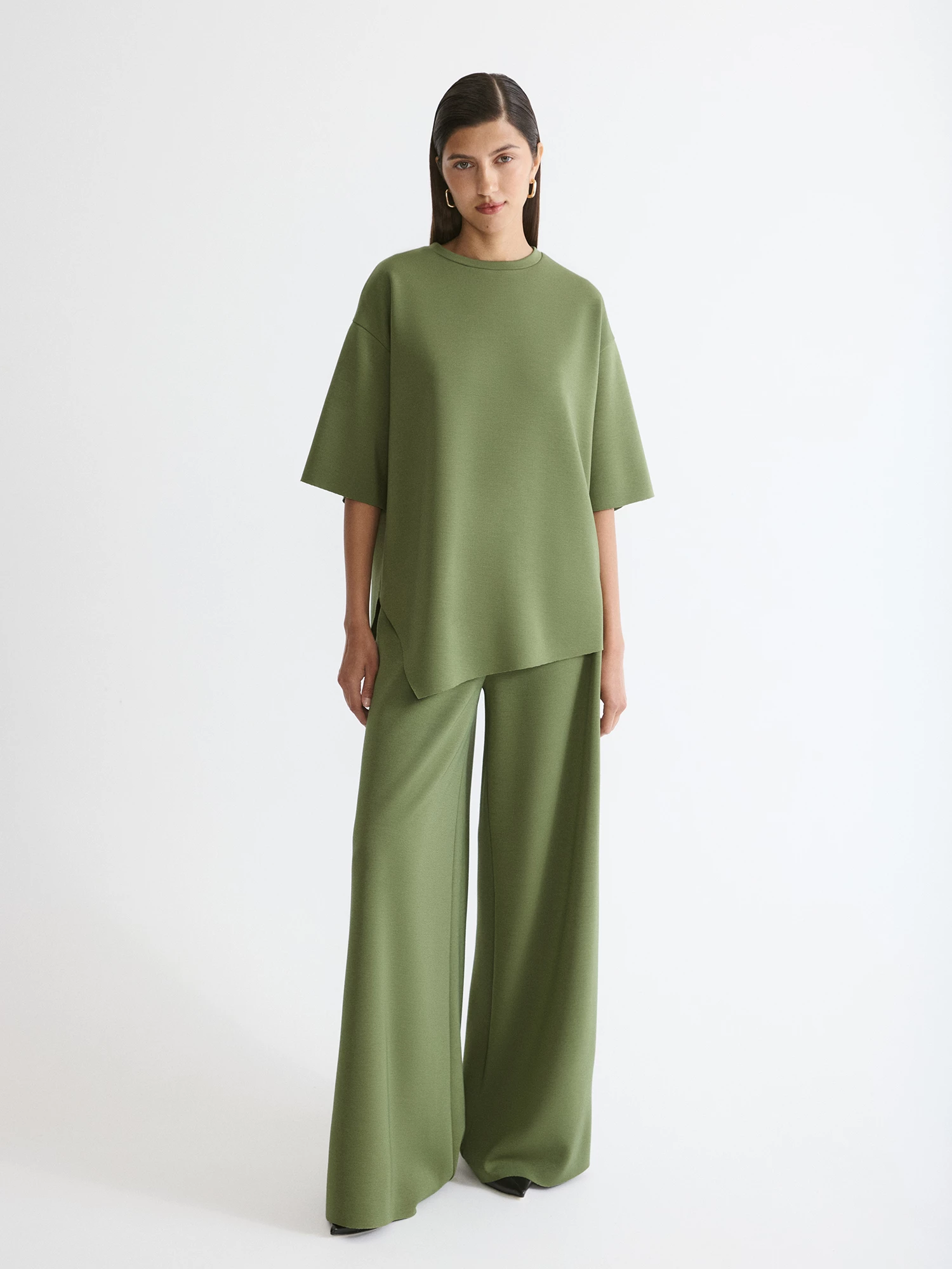 Широкие брюки в благородном оливковом оттенке незаменимы для повседневной носки. Модель выполнена без притачного пояса, на резинке по талии с изнаночной стороны.