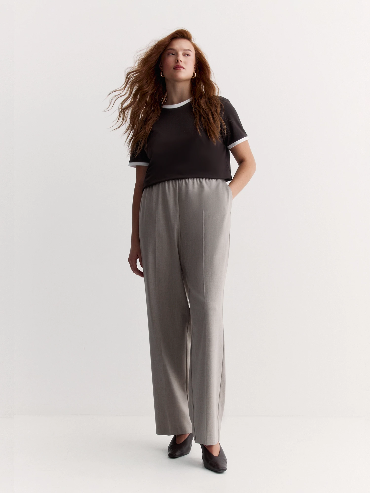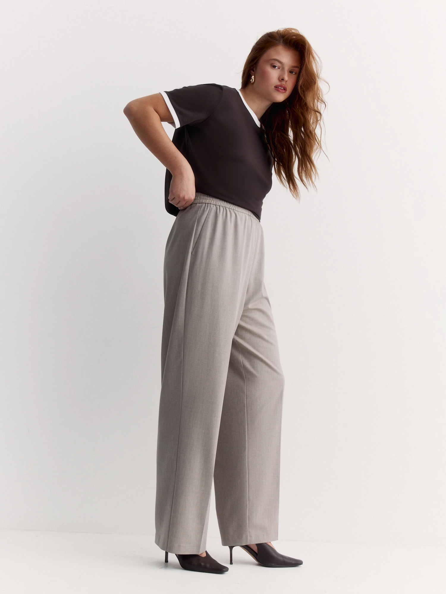 Прямой силуэт с заутюженными стрелками делает их аккуратными и стильными, а косые боковые карманы добавляют практичности. Резинка по всему поясу обеспечивает комфорт в течение всего дня – никаких застёжек, только свобода движений.