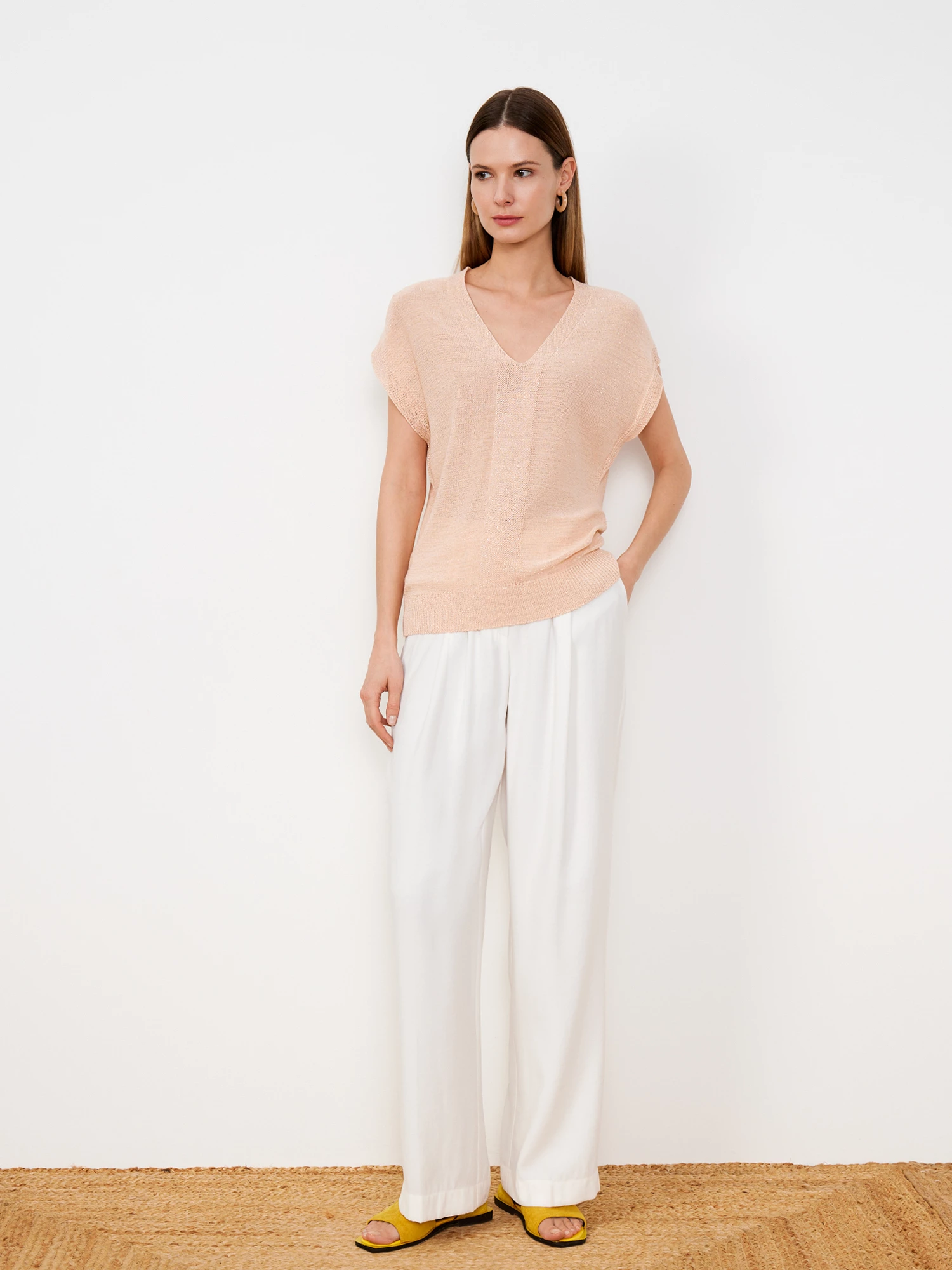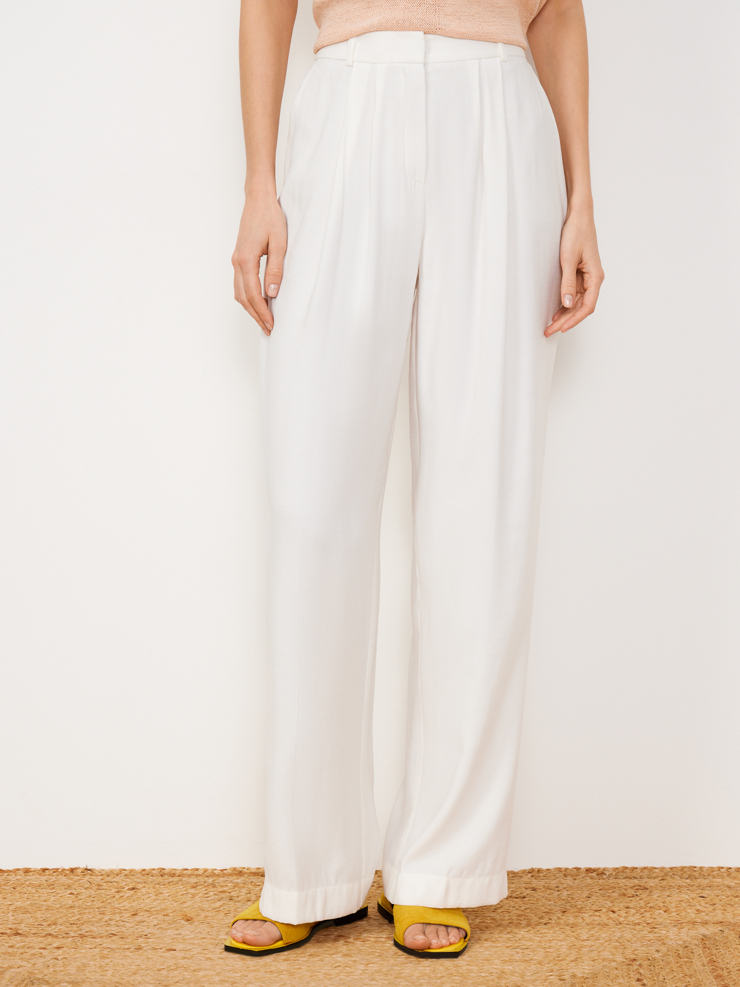 Брюки деликатного молочного оттенка выполнены из невесомого вискозного полотна премиального качества. Модель прямого кроя, с притачным поясом со шлёвками под ремень, косыми карманами и лёгкими защипами спереди. Составят однотонной тотал-лук с жилетом из того же материала.