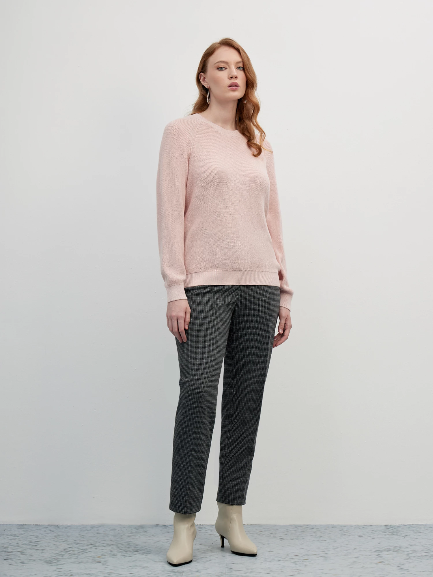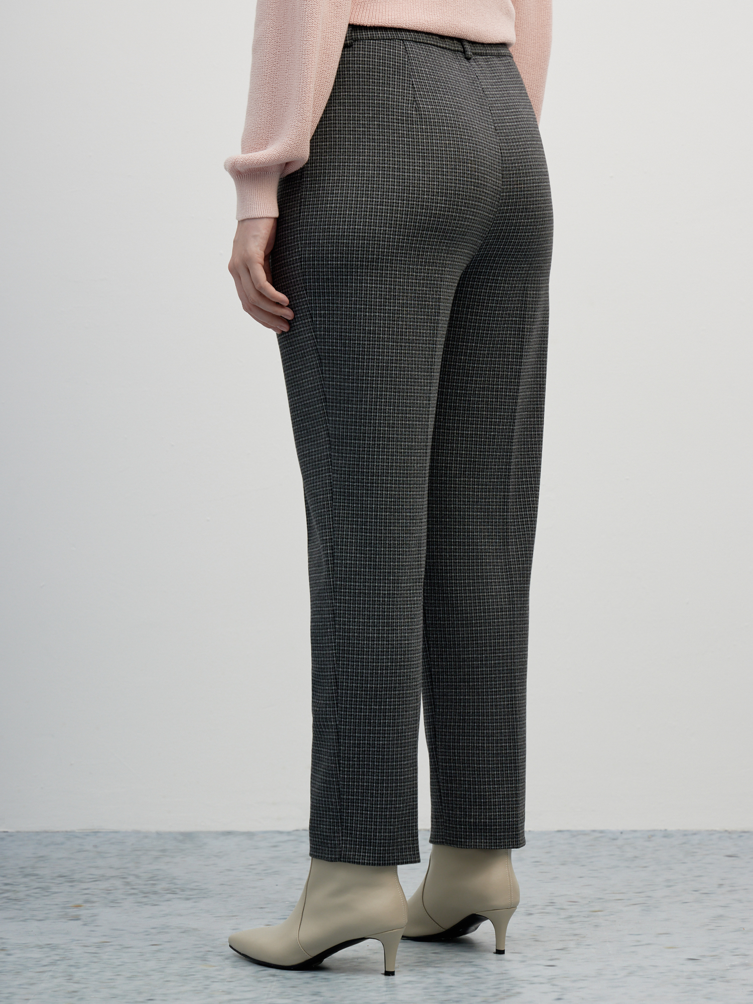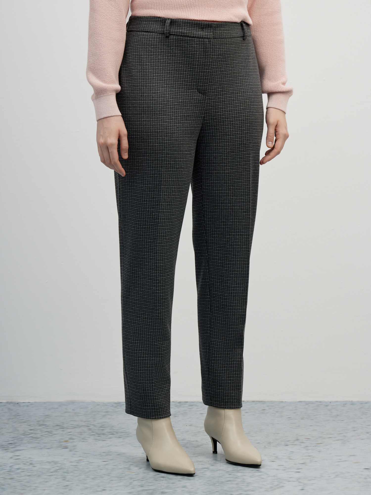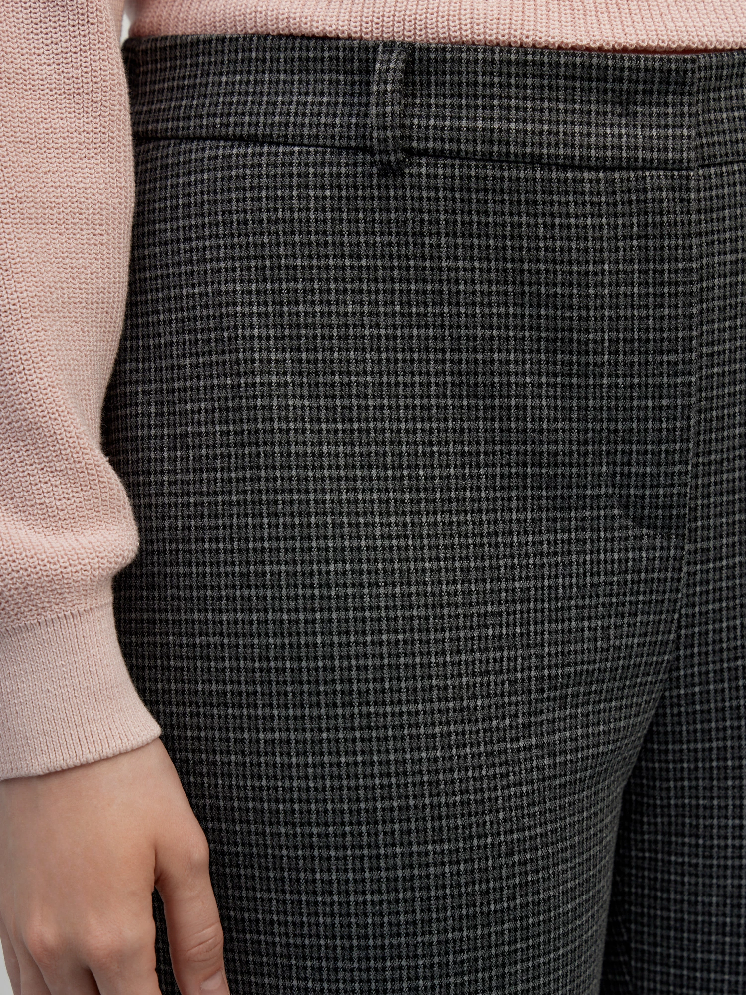 Зауженные брюки средней посадки с мелким клетчатым узором темно-серого цвета – стильная база для офиса, деловых встреч и просто для жизни. Заутюженные стрелки визуально вытягивают силуэт, а пояс со шлевками под ремень и резинка по спинке обеспечат комфортную посадку на талии. Выполнена модель из плотного костюмного трикотажа, гладкий и эластичный материал обеспечивает максимальный комфорт и не деформируется со временем.