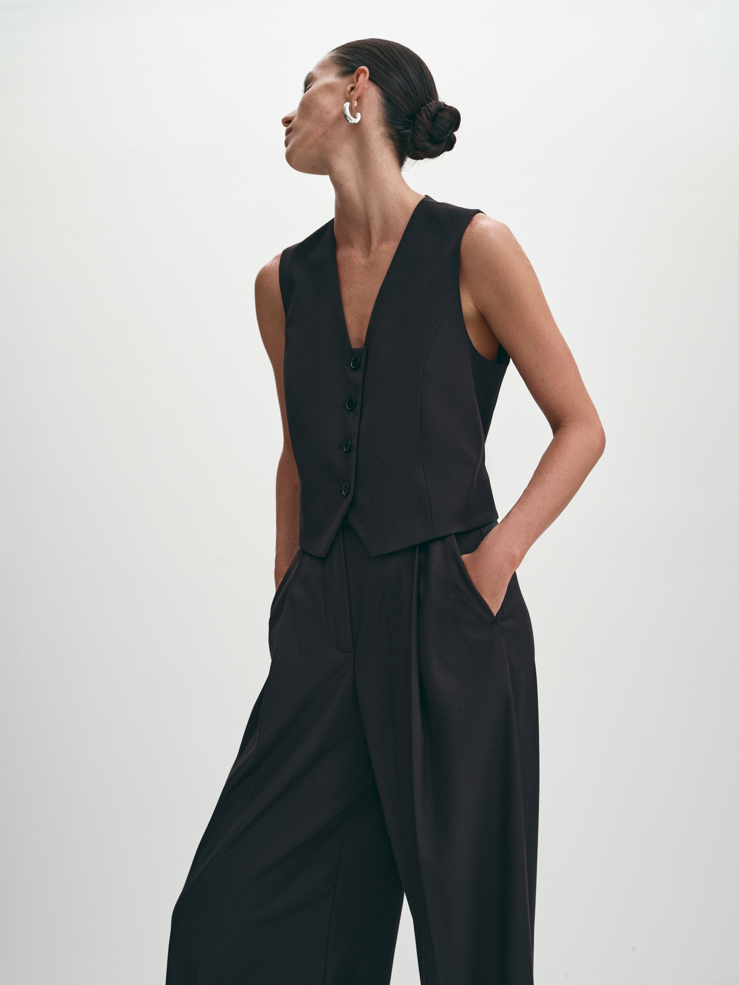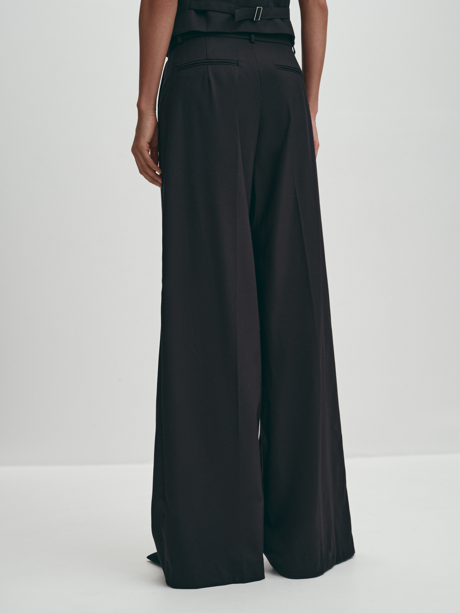 Длинные брюки палаццо с высокой посадкой. Модель с притачным поясом, косыми боковыми и декоративными задними карманами "в рамку". Брюки со стрелками, образованными из складок. Такой крой возможен благодаря хорошей плотности костюмной вискозной ткани. Классические брюки в стильном черном подходят для офиса, школы, прогулки, праздника. Базовый топ и однобортный удлиненный жакет увеличенного силуэта завершат костюм.