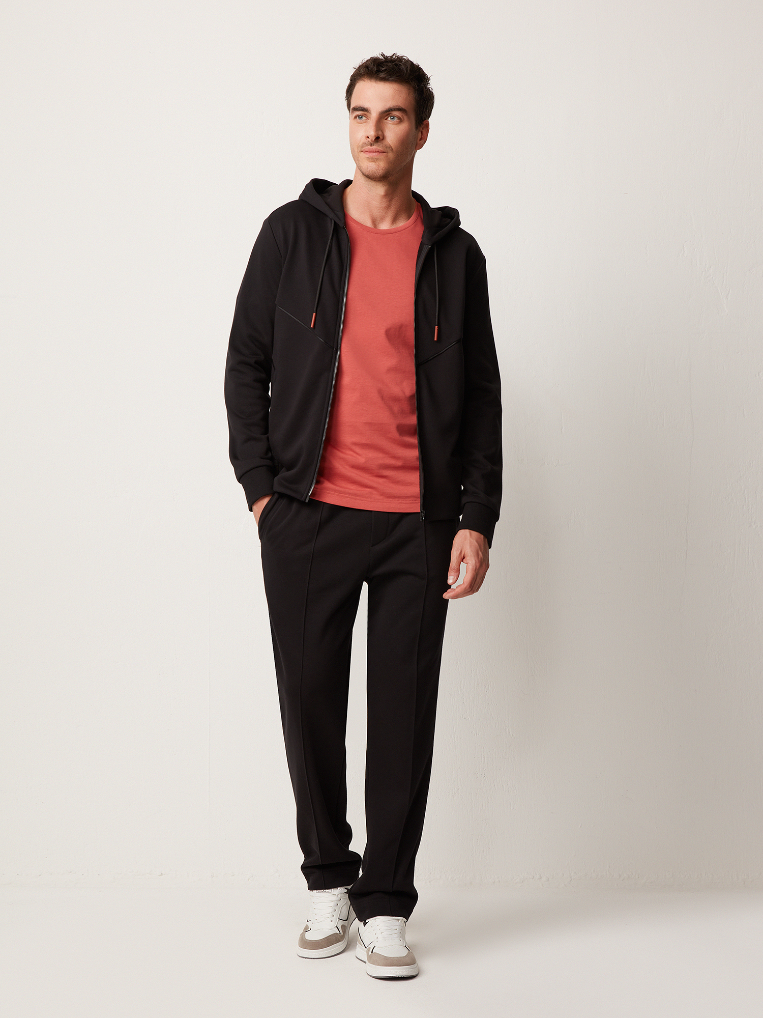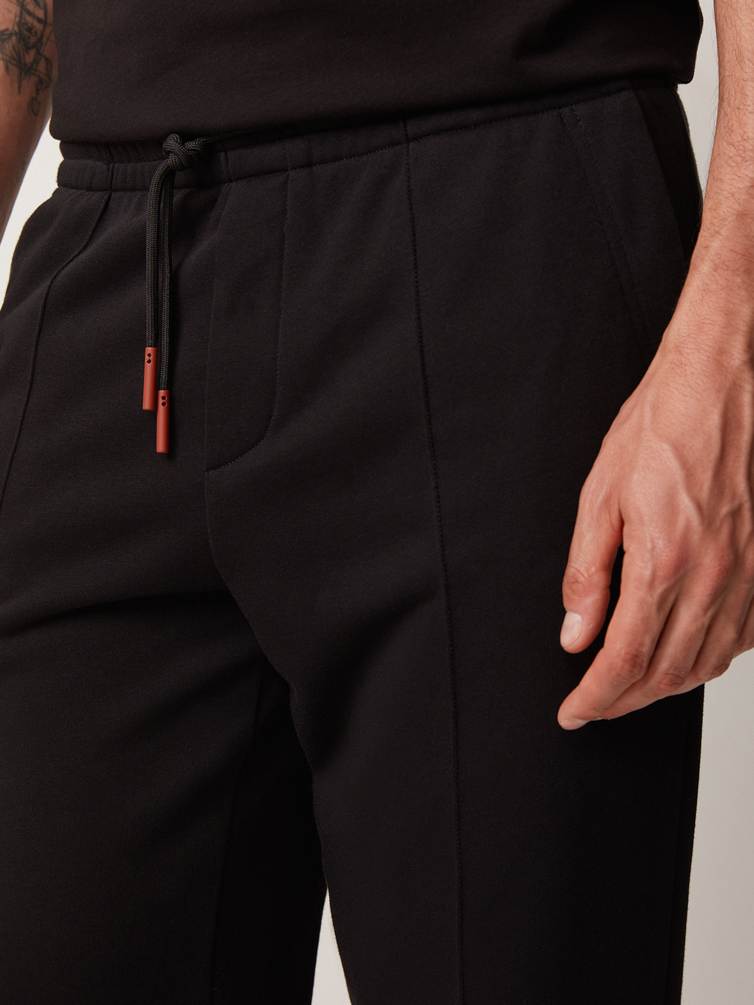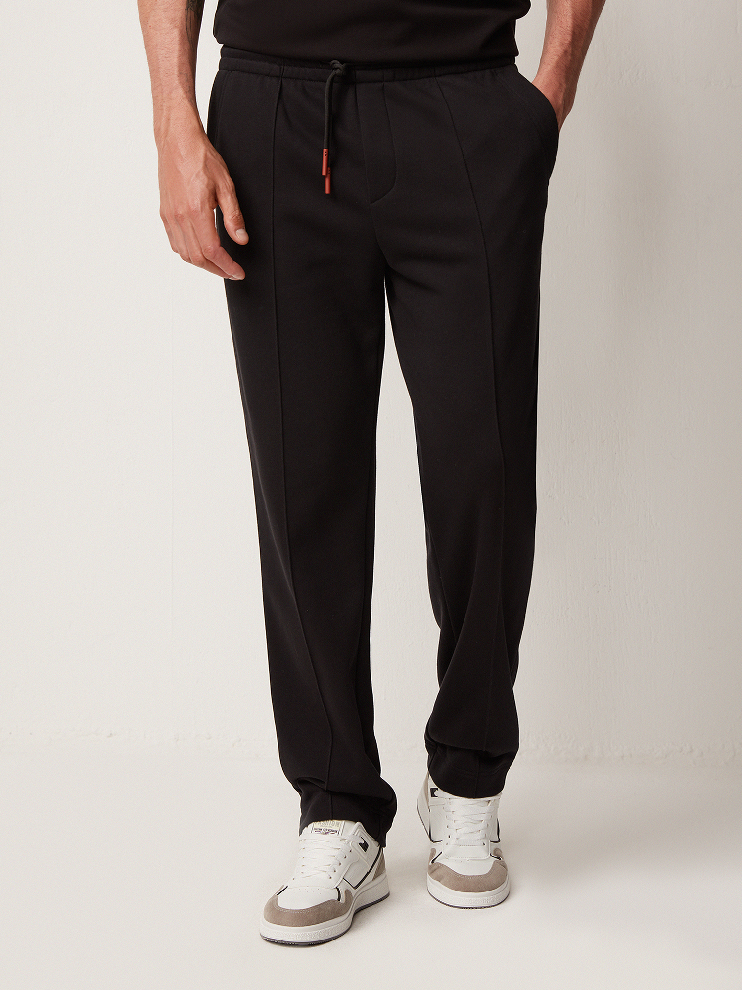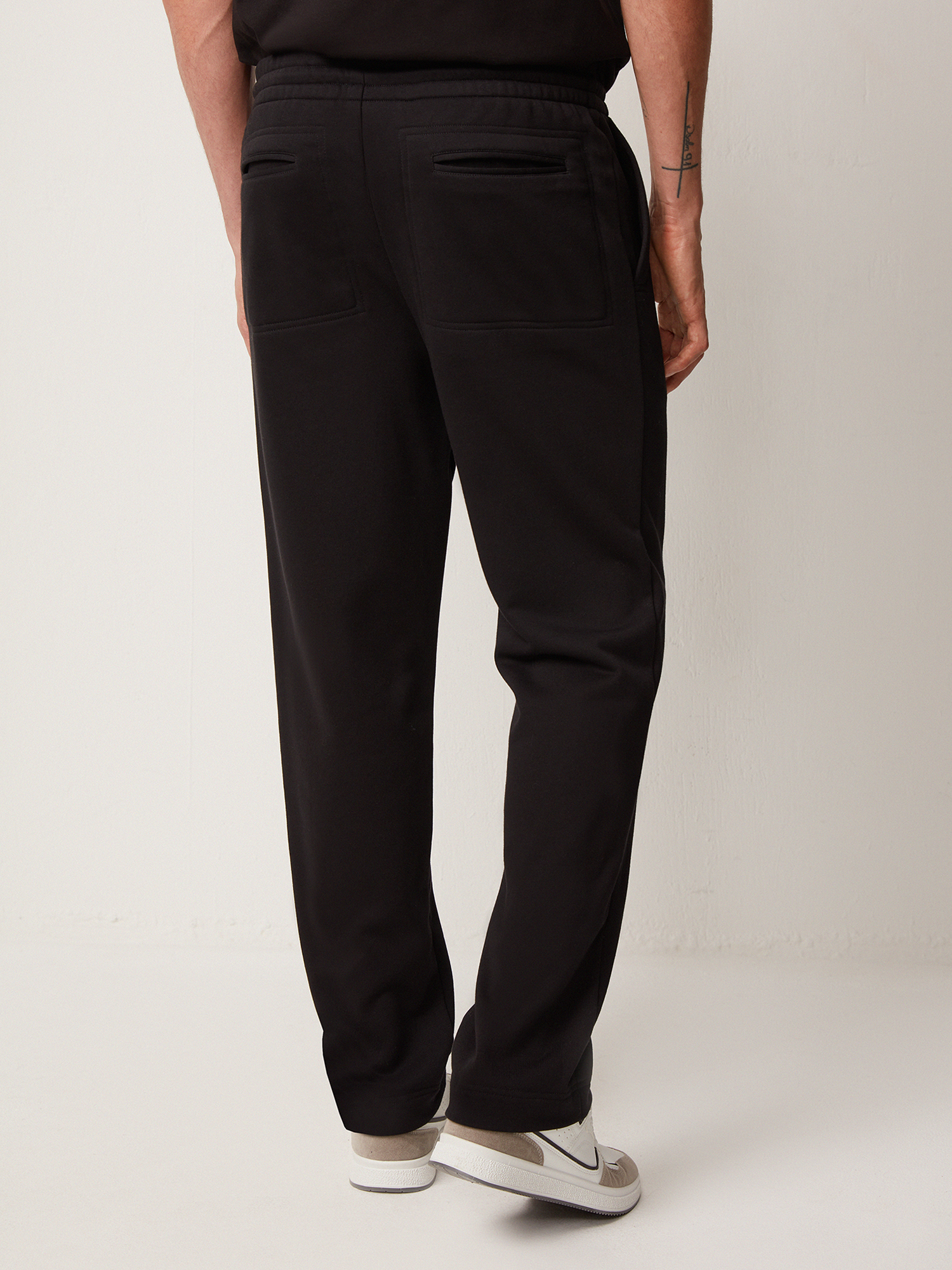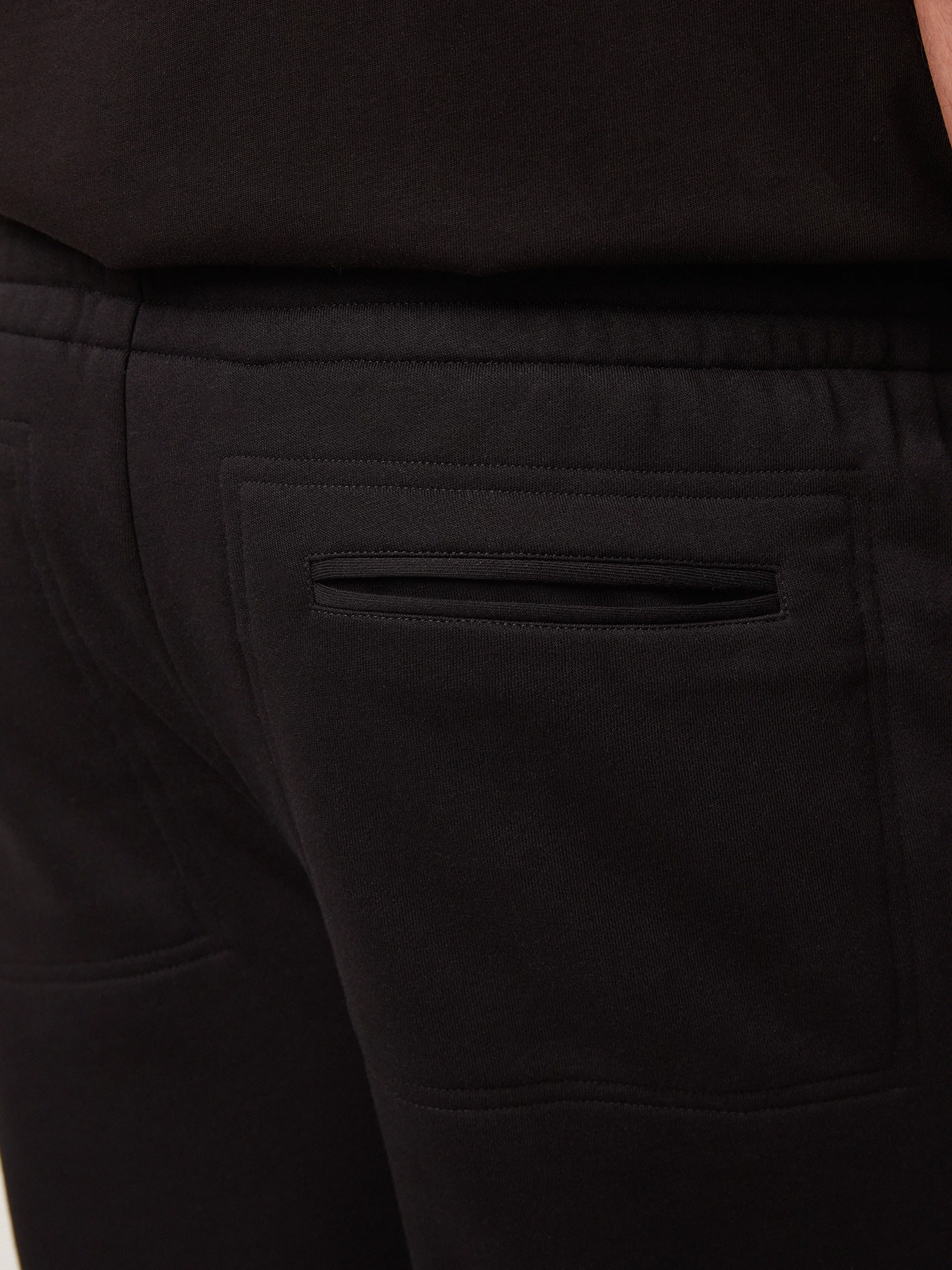 Трикотажные брюки с застроченными стрелками практичного чёрного цвета. Плотный хлопковый трикотаж премиального качества тёплый, приятный к коже и не препятствует циркуляции воздуха. Модель прямого силуэта, с вертикальными рельефами и карманом с отрезным бочком спереди, и двумя прорезными карманами с отделочной строчкой в тон ткани сзади. Эластичный притачной пояс на резинке со шнуром с внутренней стороны обеспечивает комфортную посадку на любой тип фигуры. Брюки составят образ с толстовкой из той же коллекции.