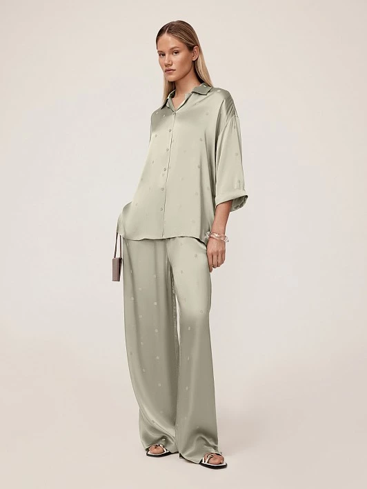 Обращает на себя внимание фактура ткани – это шелковый жаккард из 100% вискозы в актуальном светло-оливковом. Эффектный внешний вид, высокая прочность и устойчивость к деформациям – неоспоримые преимущества такого полотна, а привлекательный дизайн сразу обращает на себя внимание. Набор характеристик жаккардового полотна позволяют рассматривать его как долгосрочную инвестицию в предмет одежды.