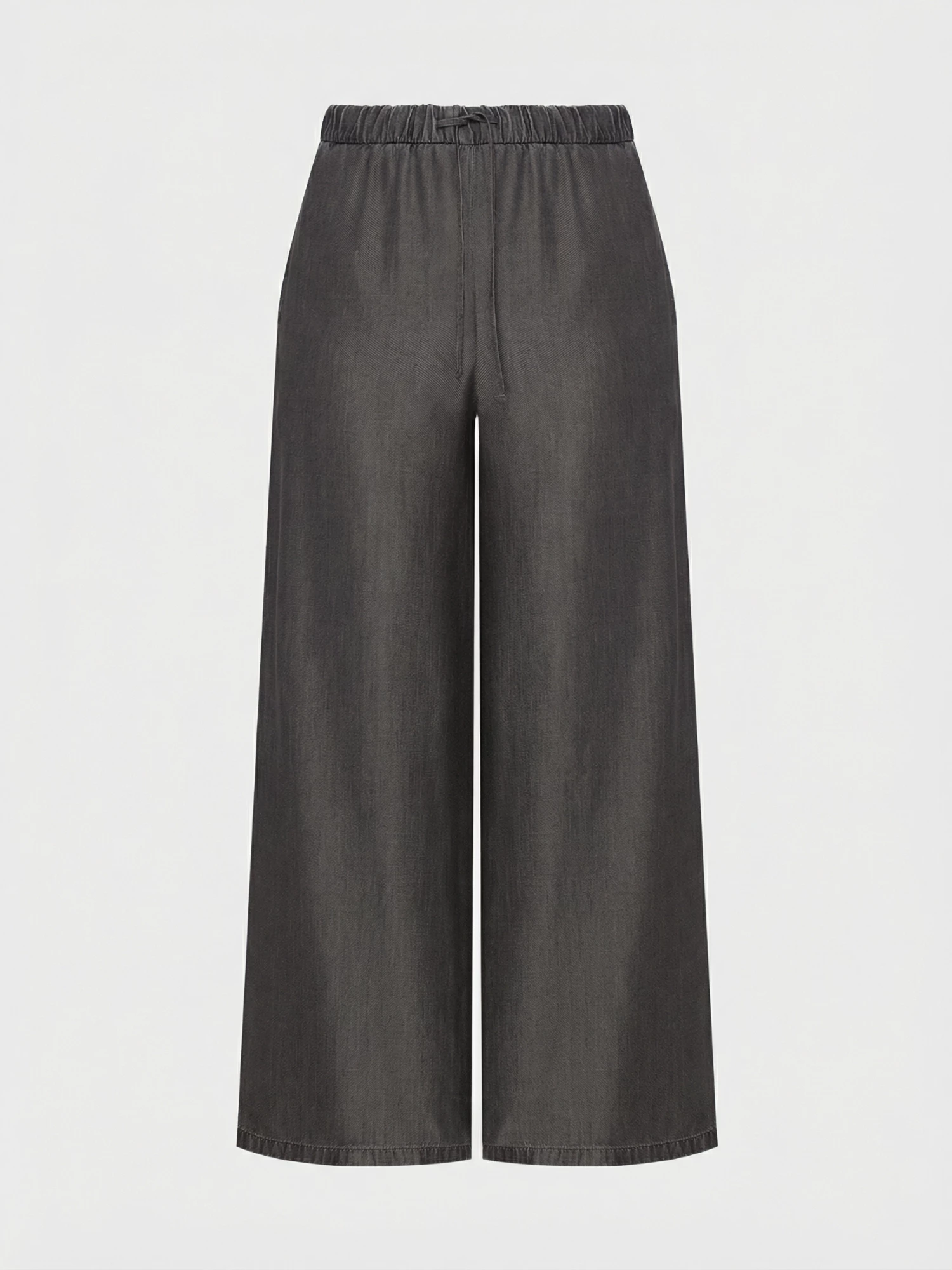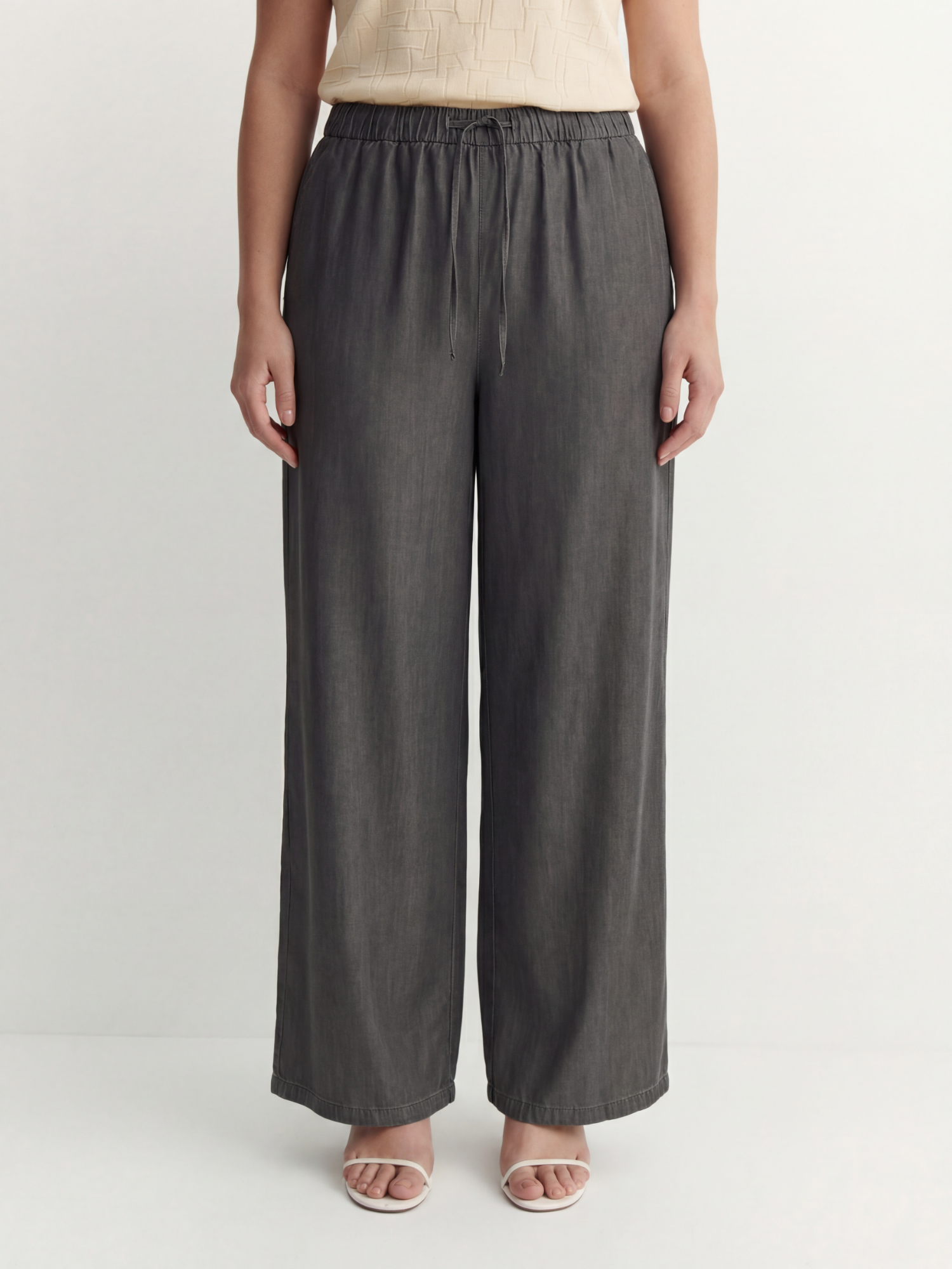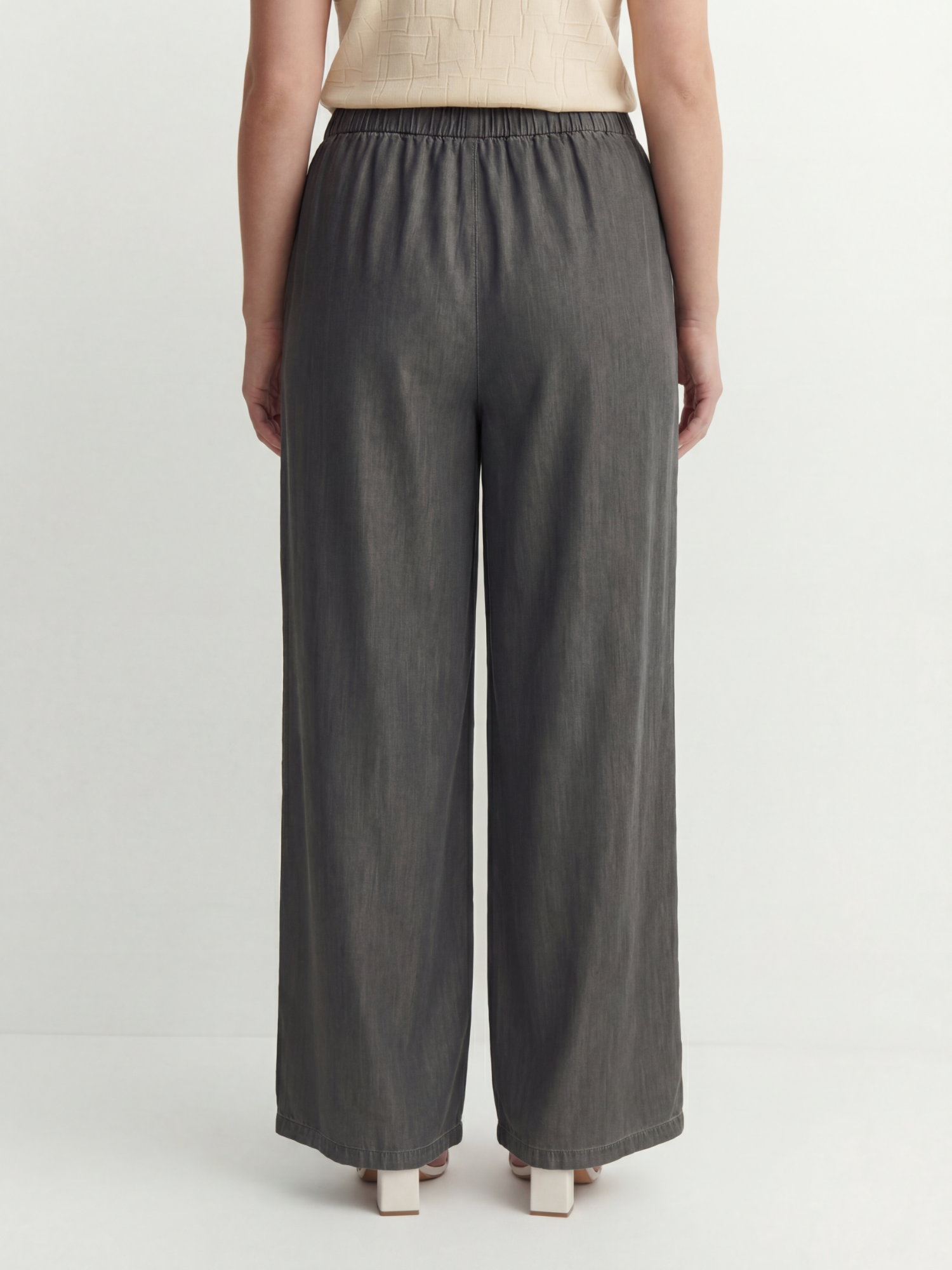 Прямые широкие брюки в цвете темно-серого денима. Полотно на основе вискозы отличается мягкостью и драпируемостью, создавая плавные линии и подчеркивая женственный силуэт.
